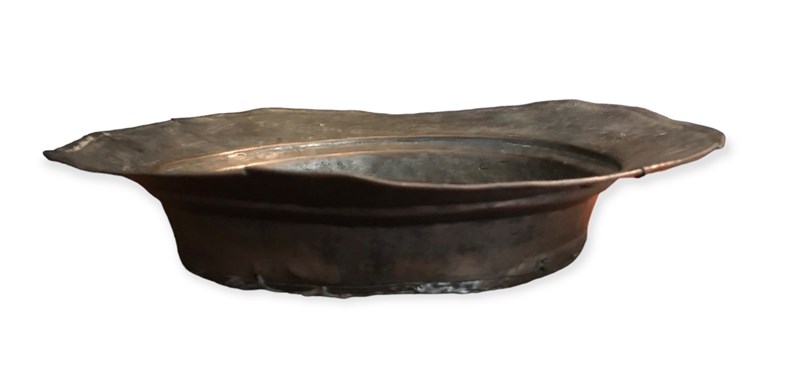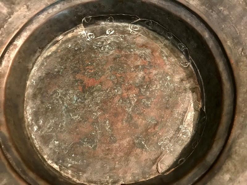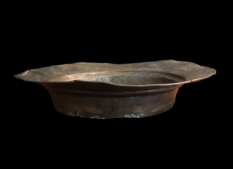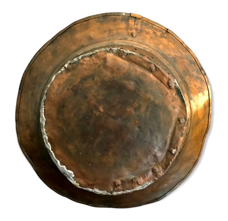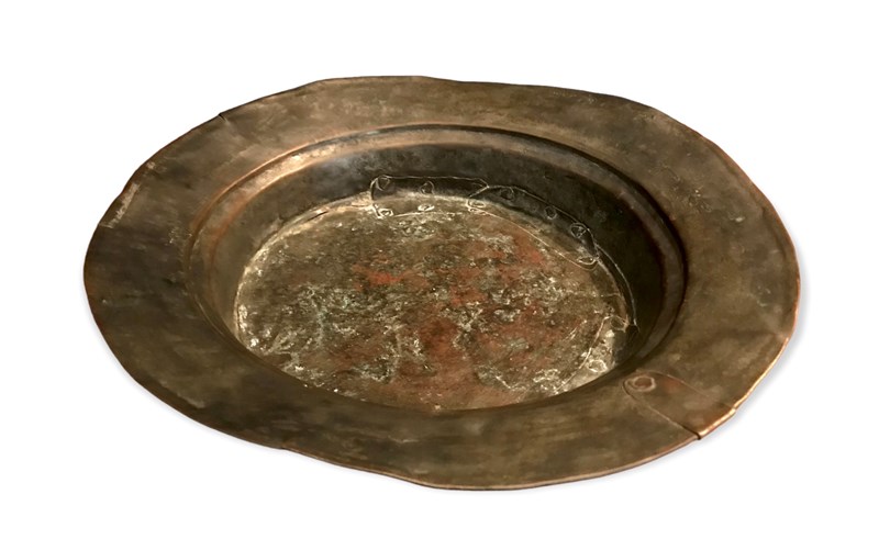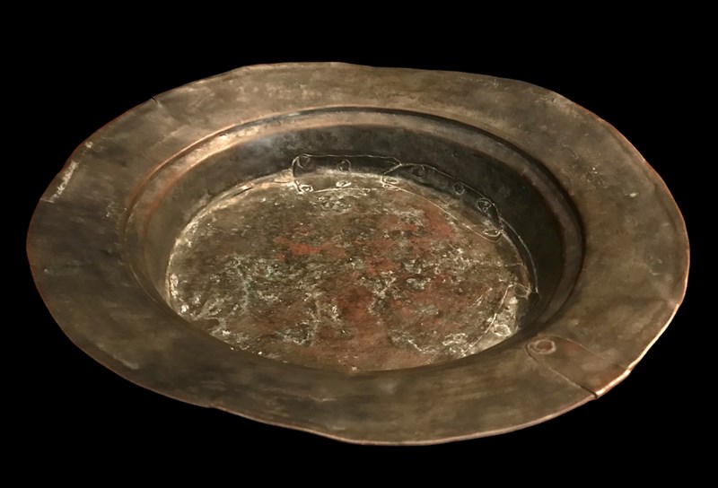 A beautiful well repaired copper dish from Amsterdam Holland, late 18th century this has really seen some use and has the patina and scars to show for it.