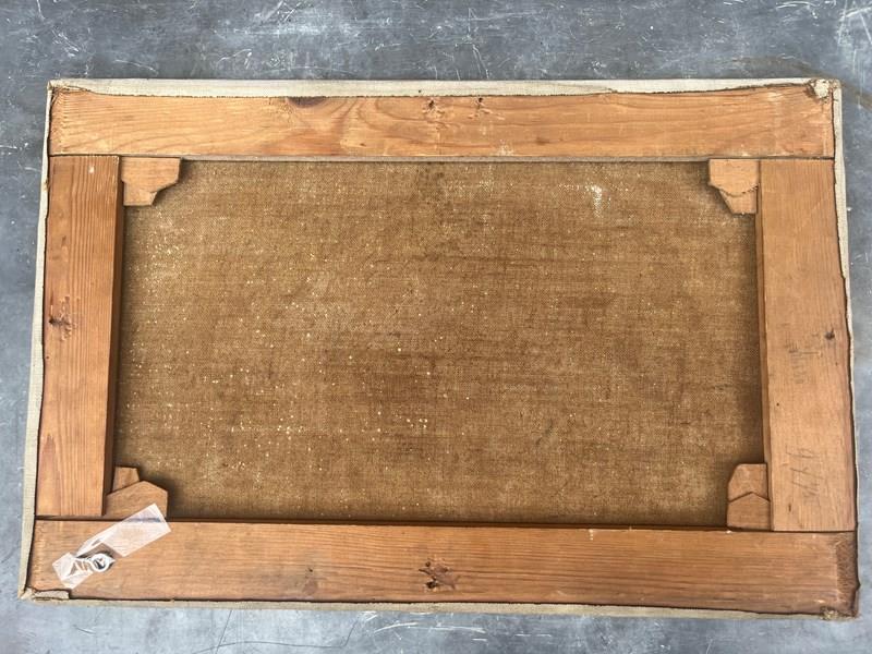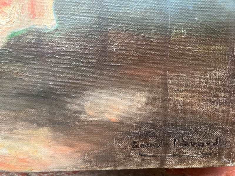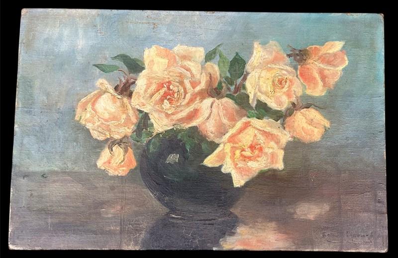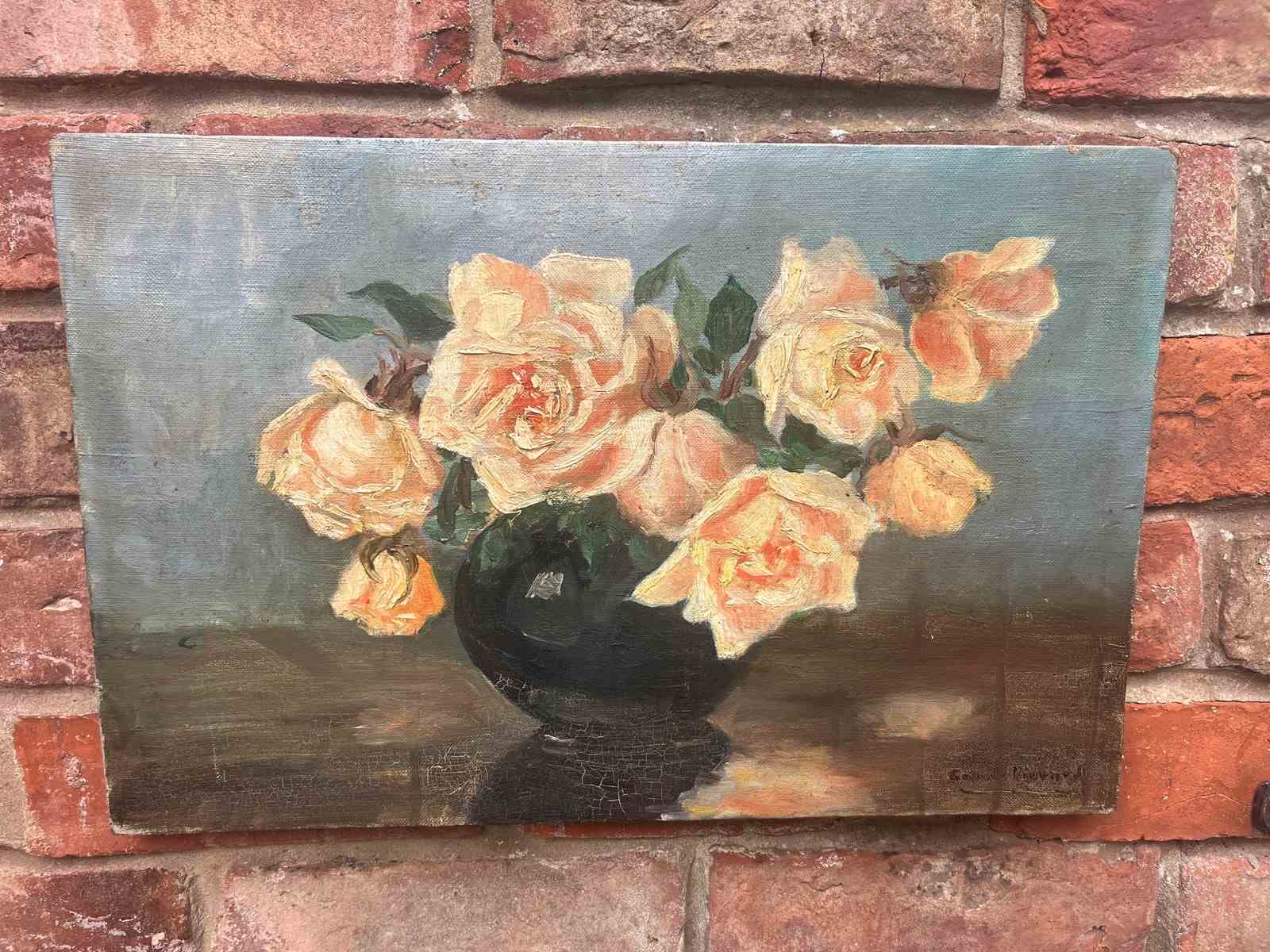 A very nice oil on canvas still life painting of some pink roses in a dark vase.