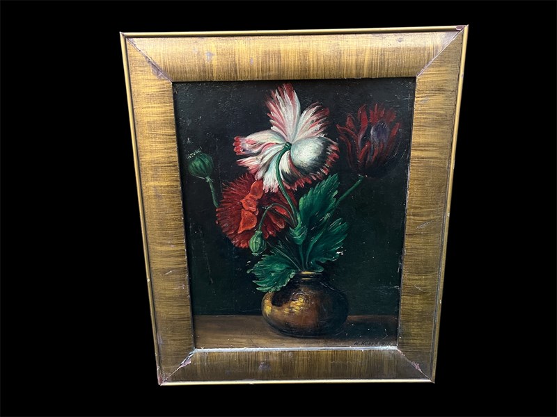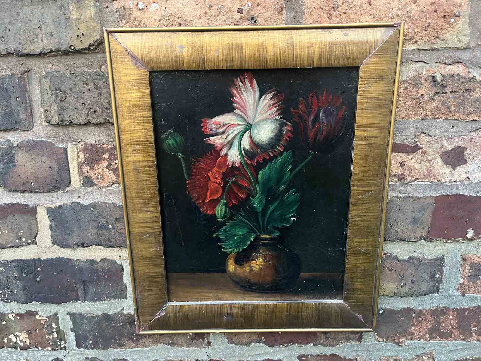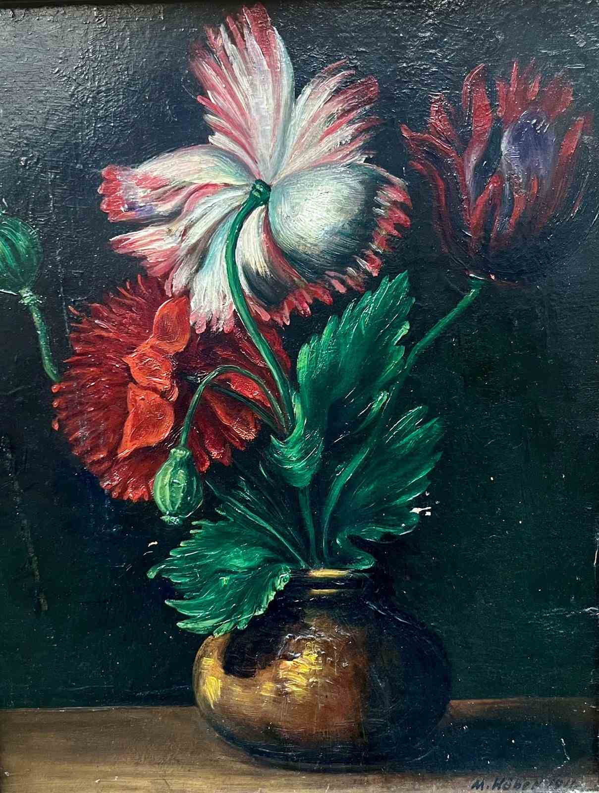 Unusual flowers, oil on board, signed M.Höber and nicely painted.
