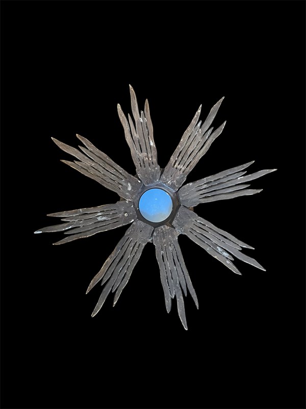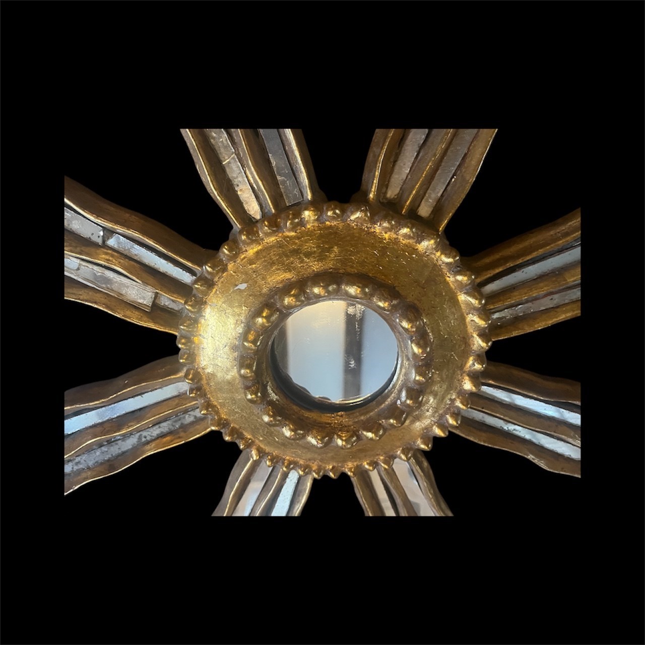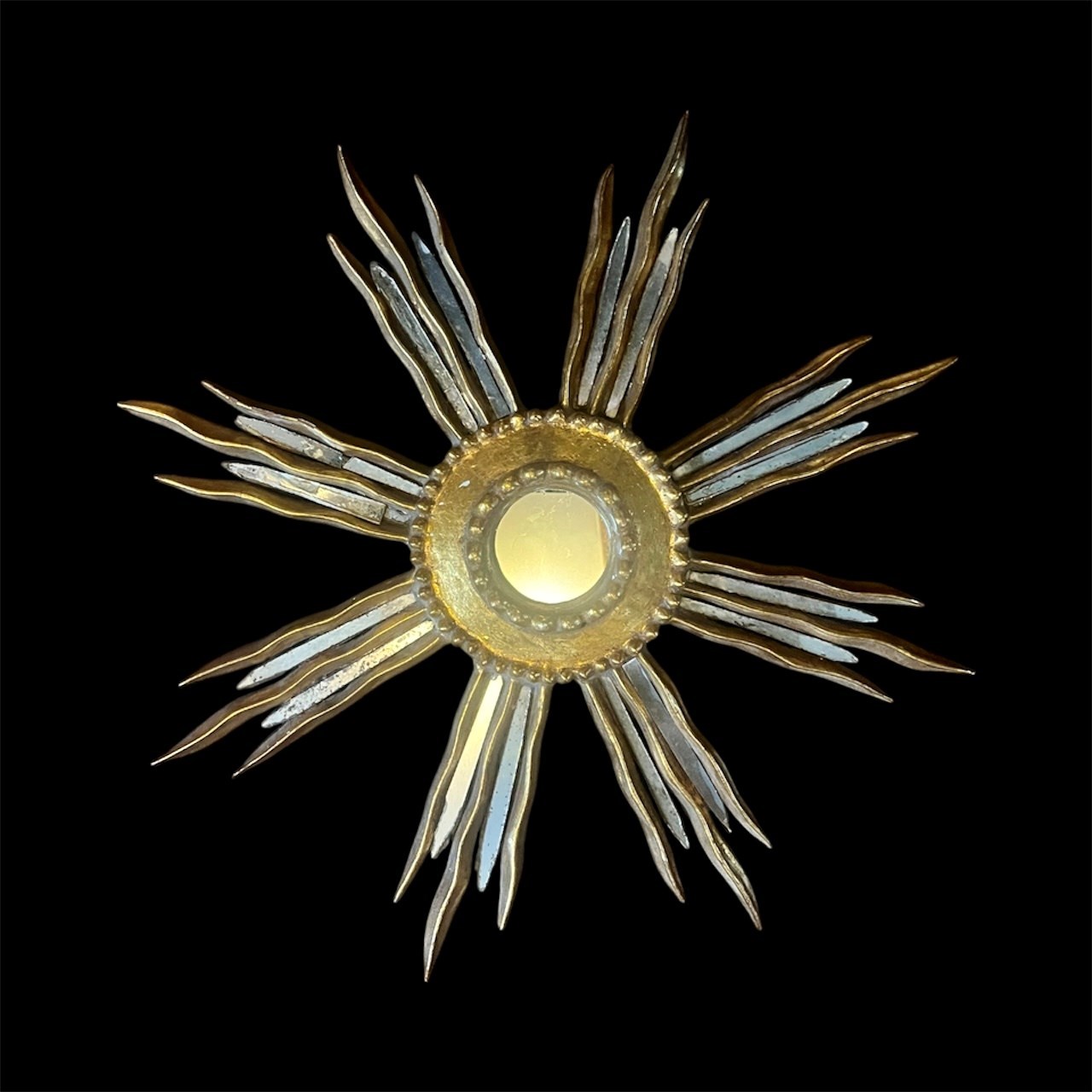 A beautiful unusual gilt wooden sunburst mirror from France with decorative mirror glass on the wooden bursts.