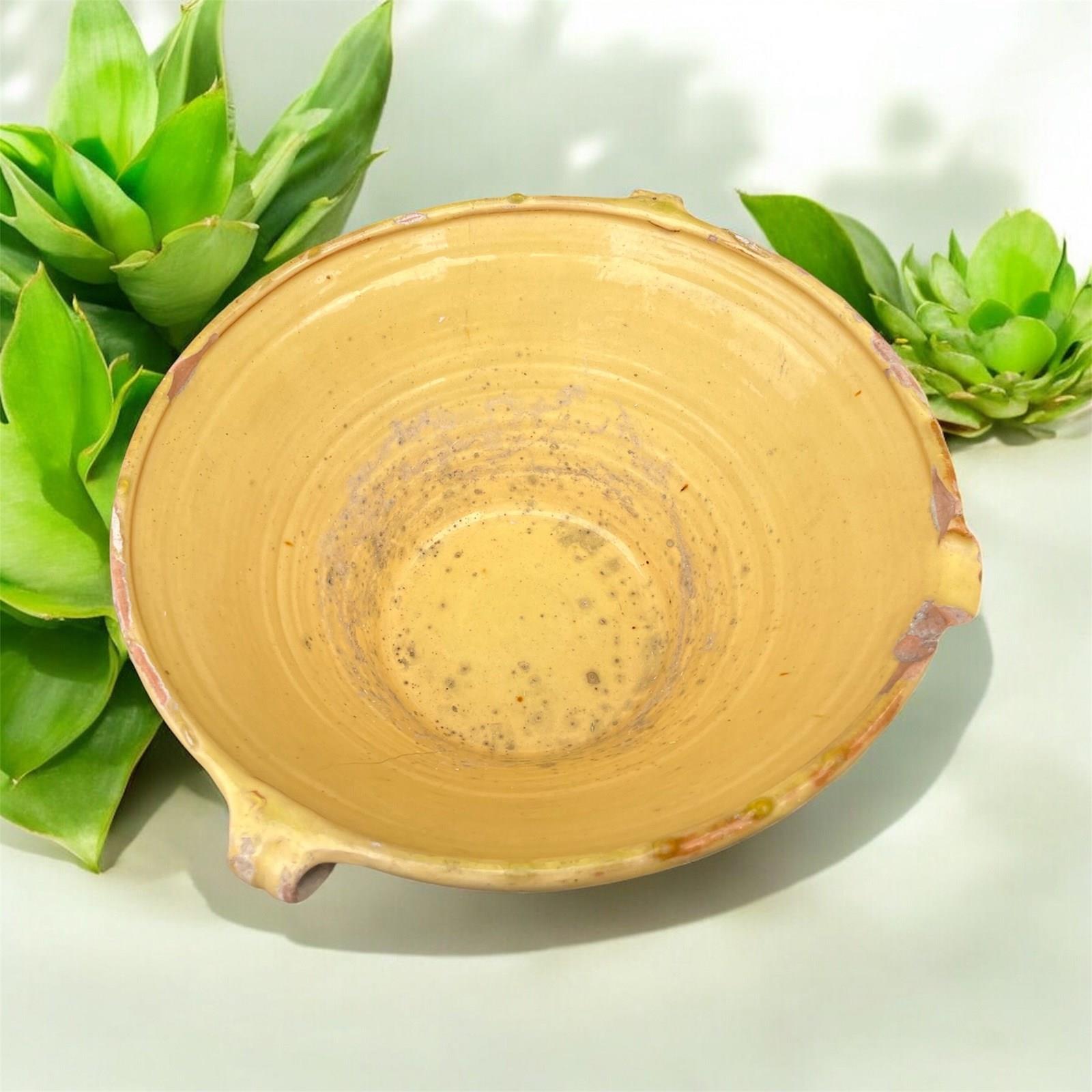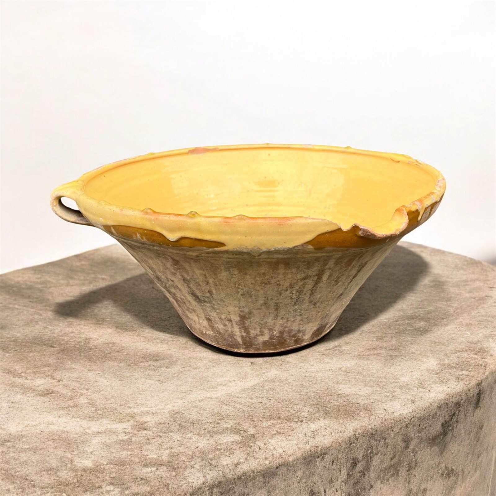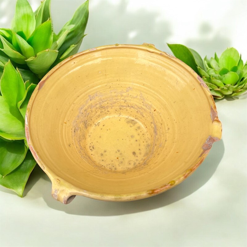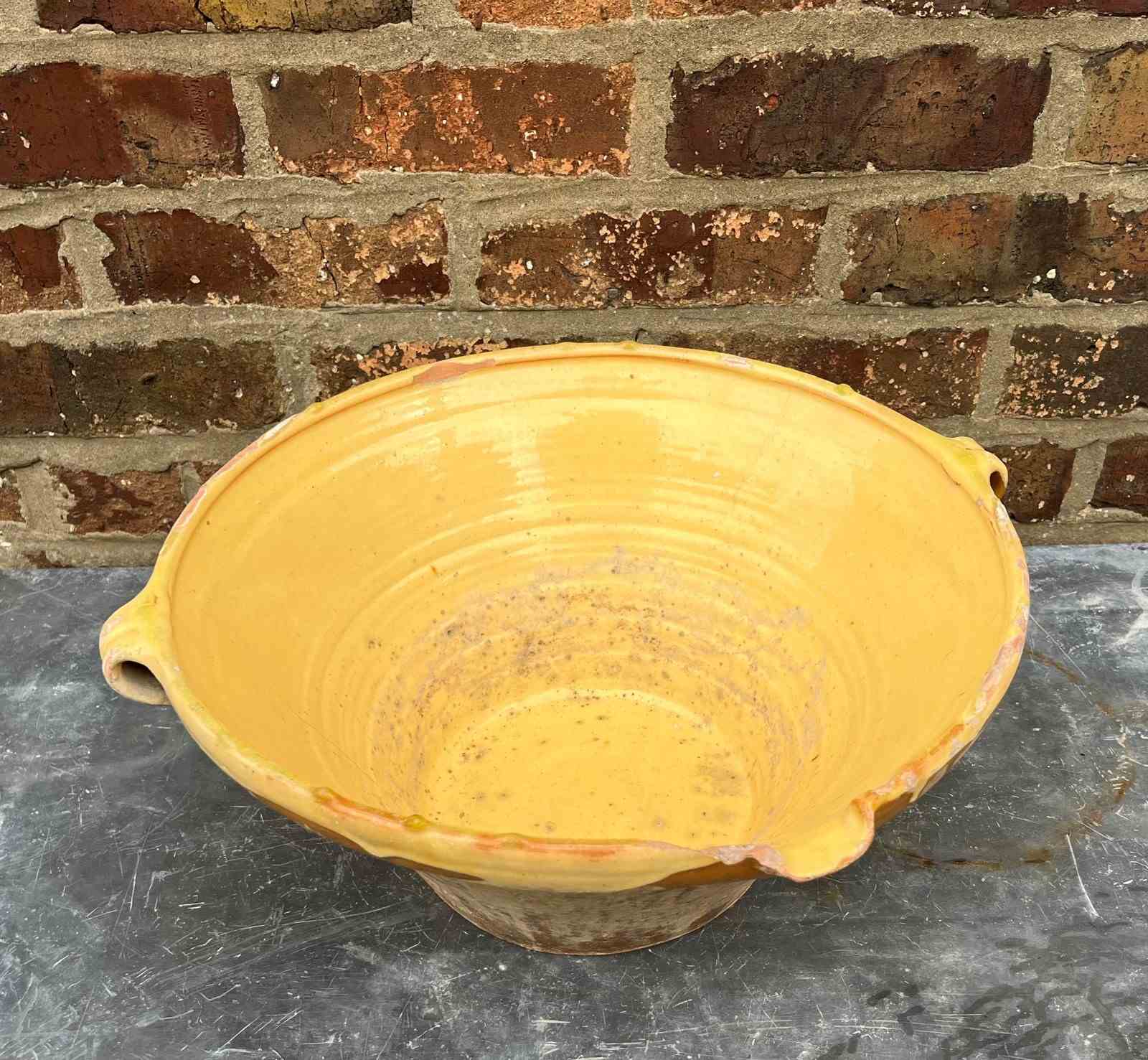 A good sized antique French Tian bowl in the beautiful honey mustard colour glaze, with 2 handles and the pouring lip.