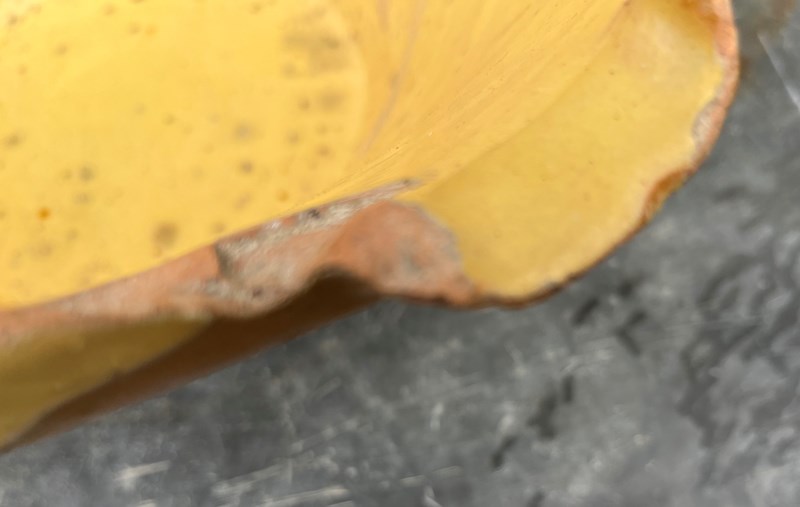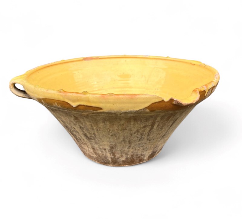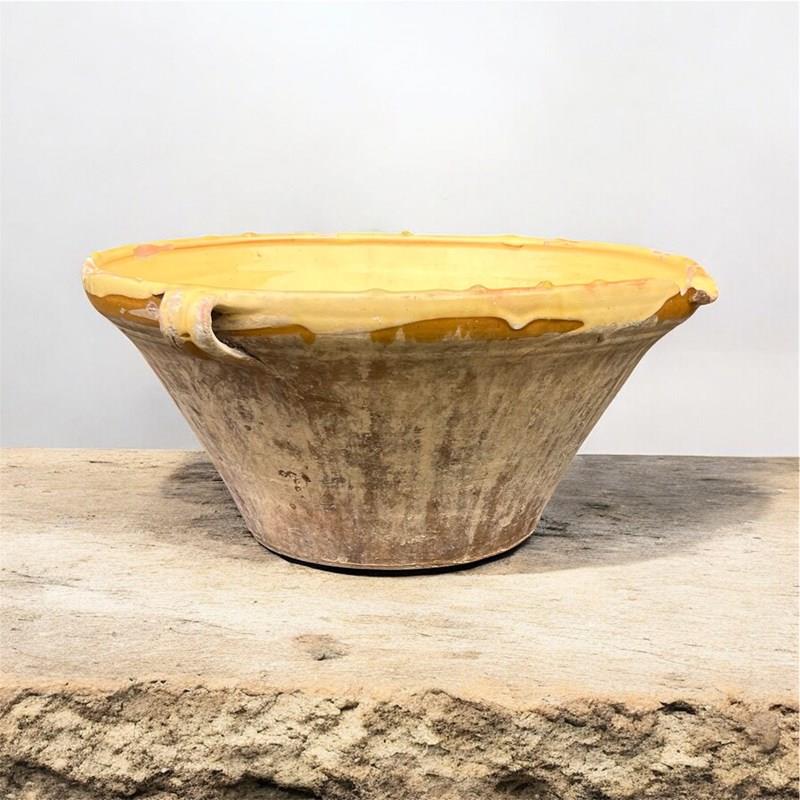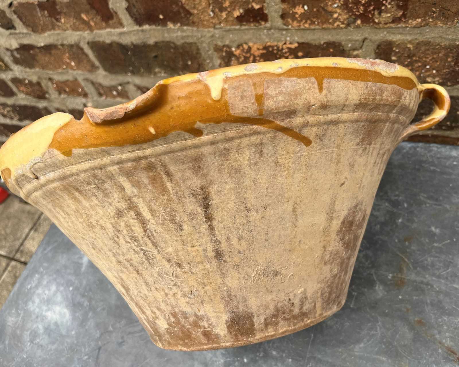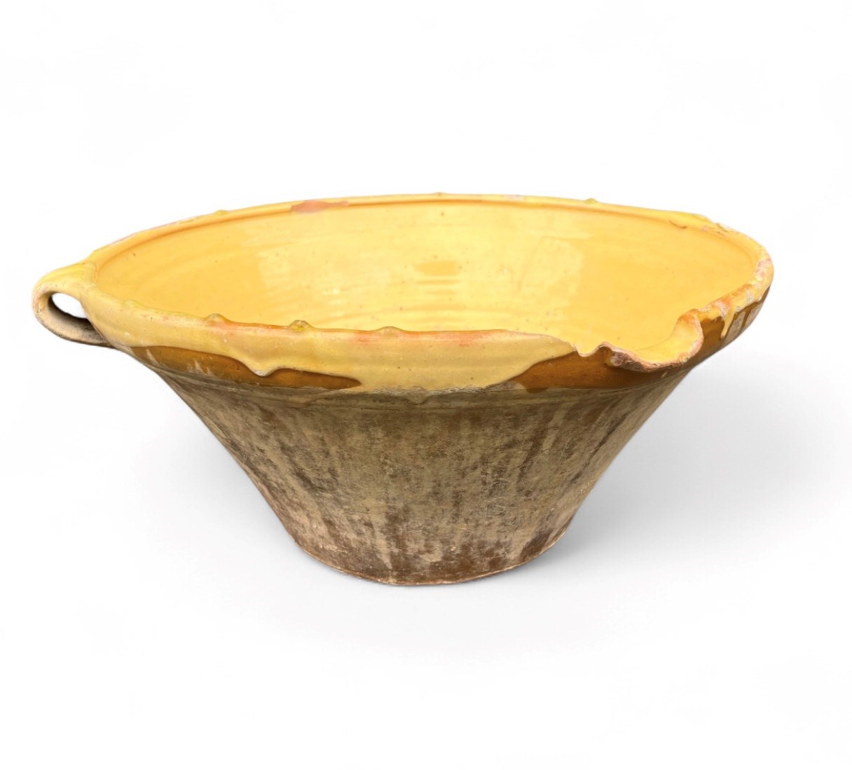 A good sized antique French Tian bowl in the beautiful honey mustard colour glaze, with 2 handles and the pouring lip.