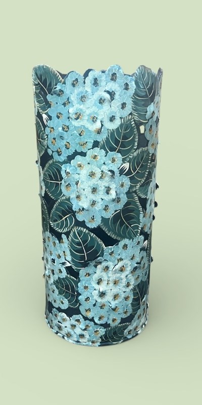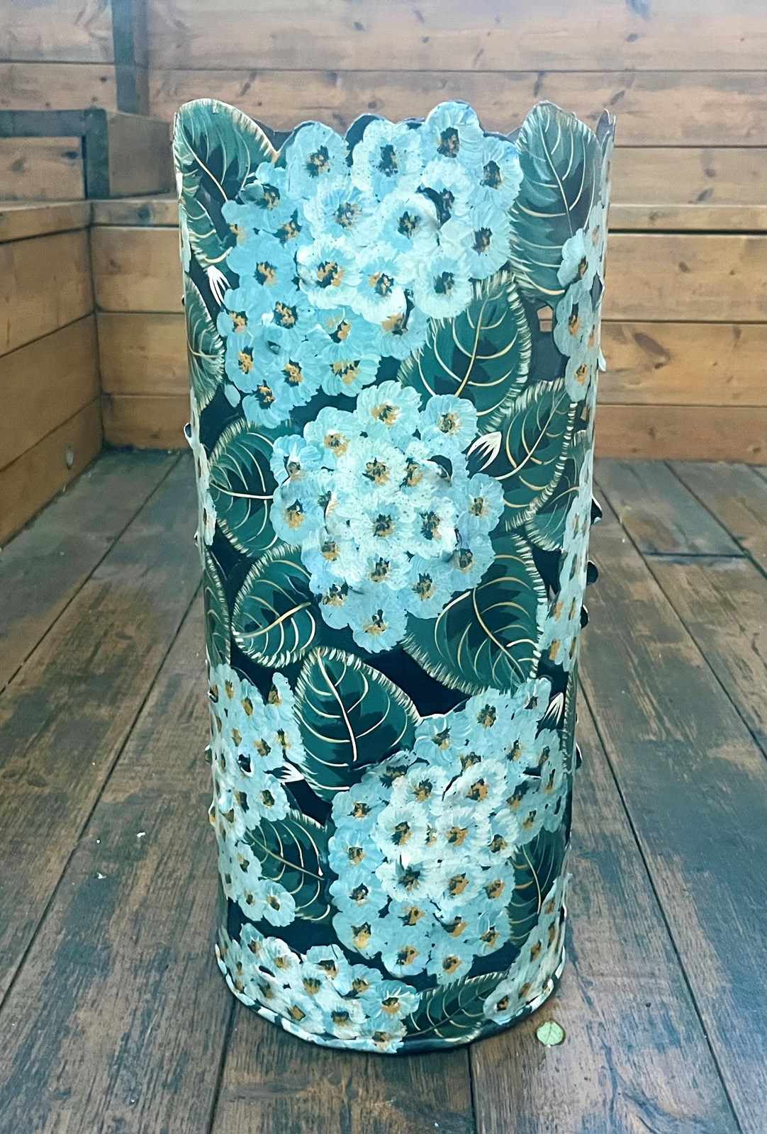 A lovely colourful toleware stick stand with flowers and foliage.
