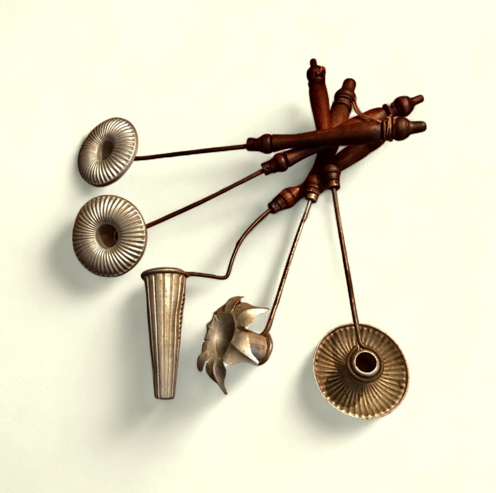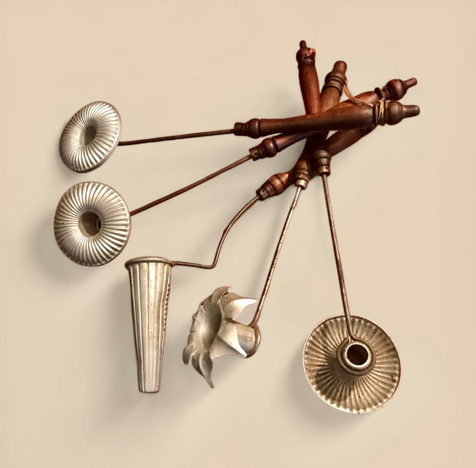 A nice set of wooden handled Dutch kitchen utensils made of aluminum and used to deep fry a kind of pancake mix to make delicious cakes.