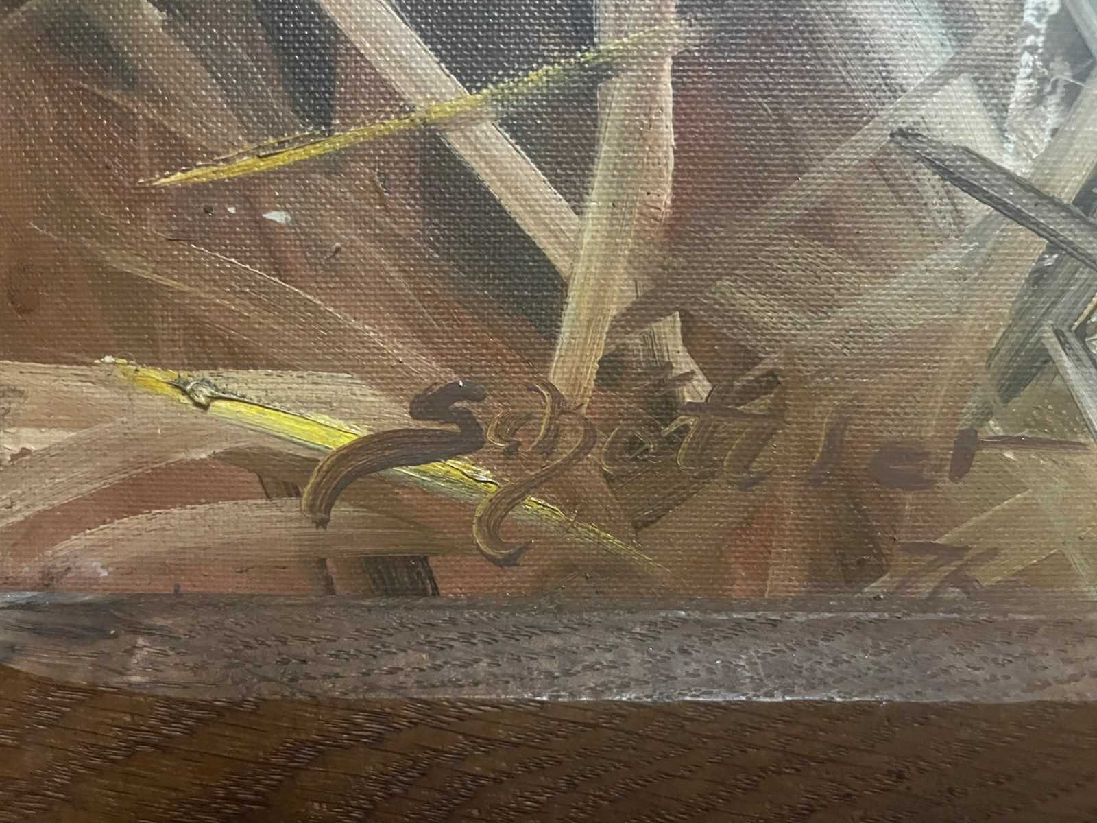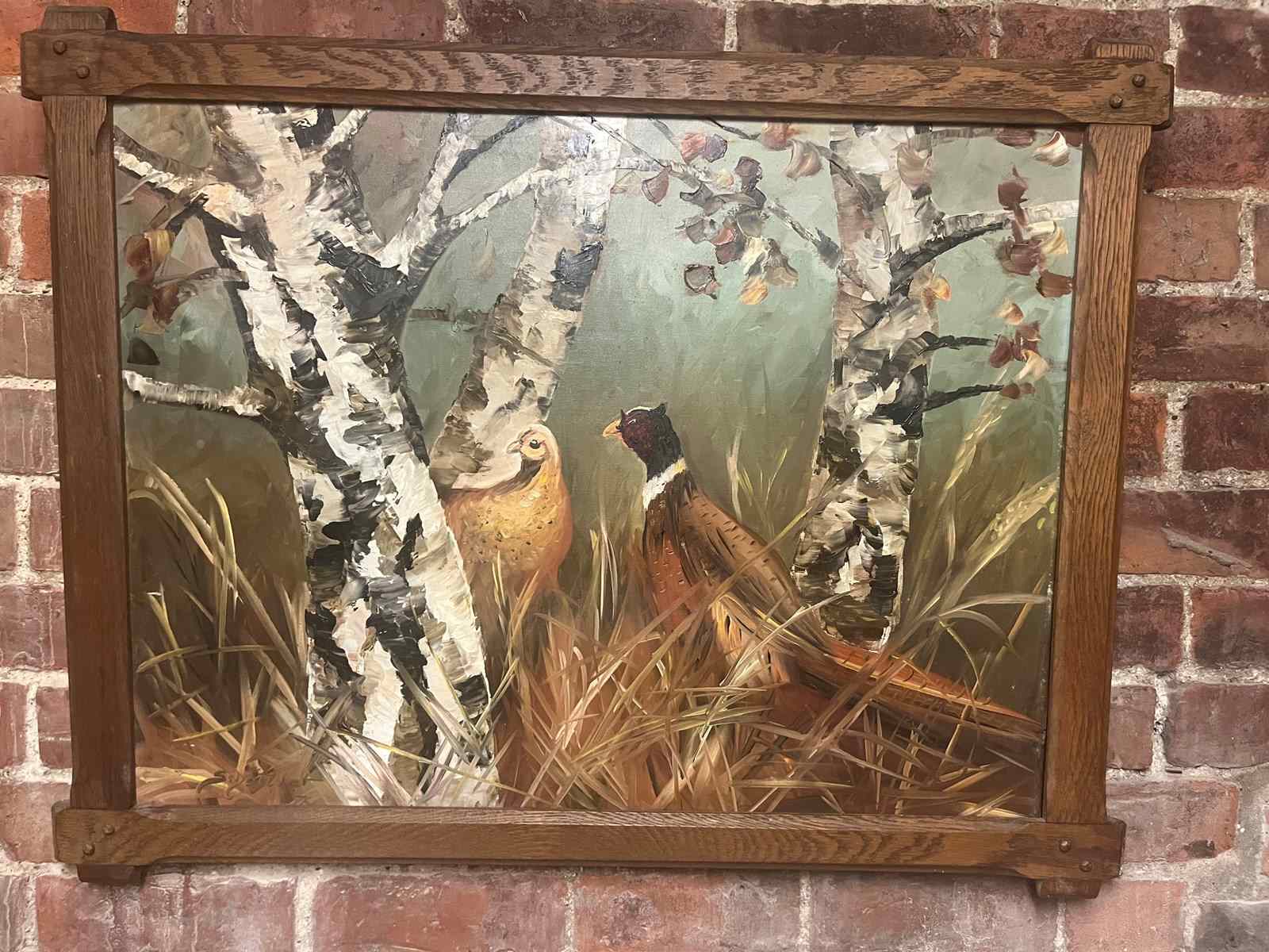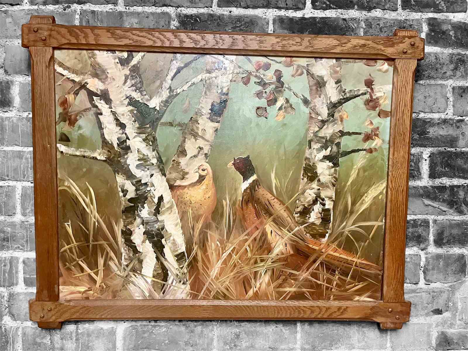 A beautiful painting of a pair of pheasant almost camouflaged in a woodland scene.