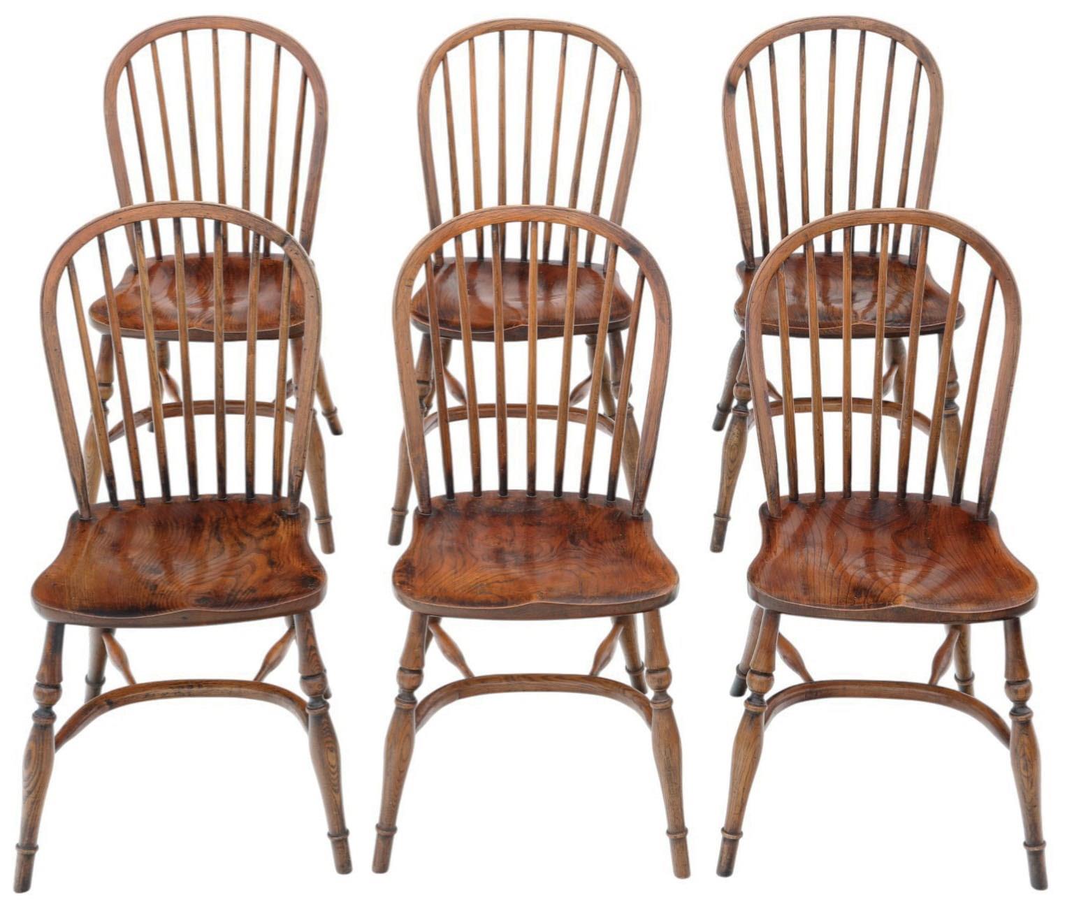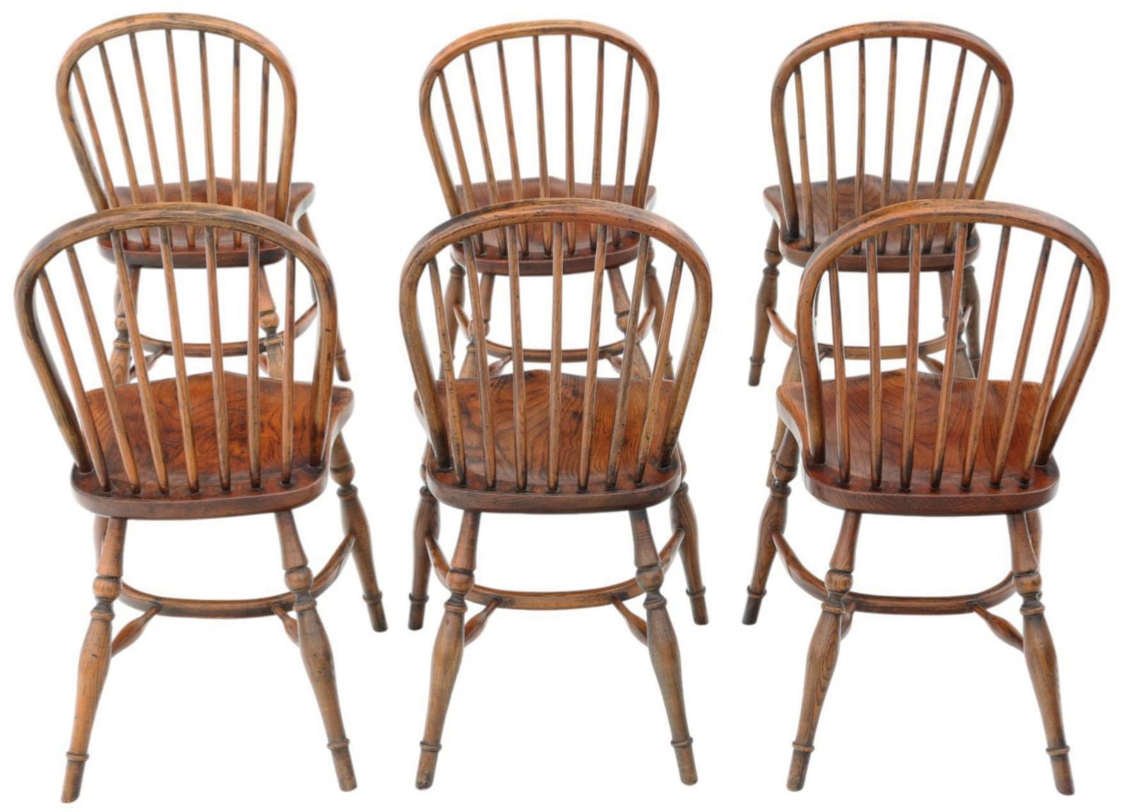 A rare and elegant set of six antique Georgian Revival Windsor kitchen dining chairs, dating from circa 1920. Crafted from ash and elm, these chairs showcase solid construction with no loose joints or woodworm, embodying timeless quality and durability.