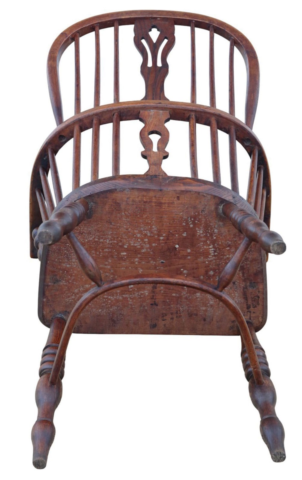 An antique 19th-century Windsor armchair crafted from ash and elm, full of age, character, and patina. This original English country chair is a fine example of traditional craftsmanship, structurally sound and practical for everyday use, while also serving as a decorative statement piece with timeless charm. A rare antique Windsor armchair that would suit a dining room, study, or period-inspired interior.
