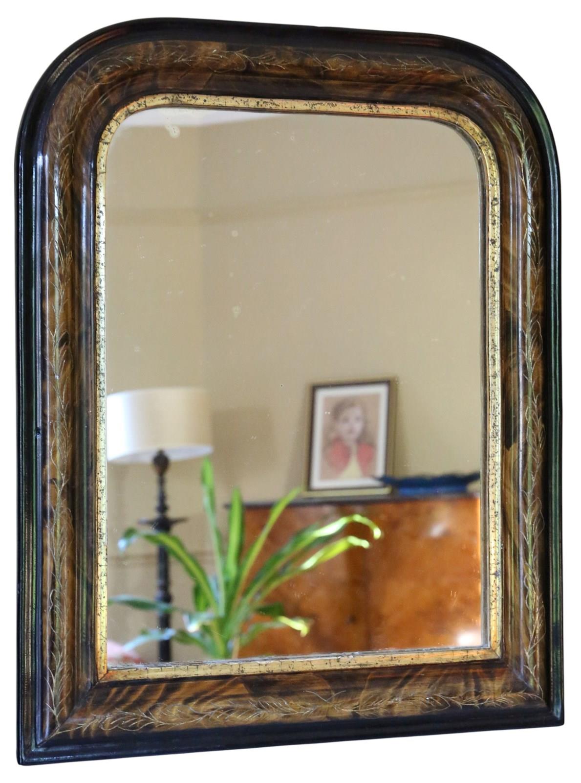 This mirror features a unique faux walnut paint finish with gilt and ebonised edging, combining elegance with period appeal. Full of authentic charm and character, this rare decorative find would make a wonderful statement piece in the right setting.