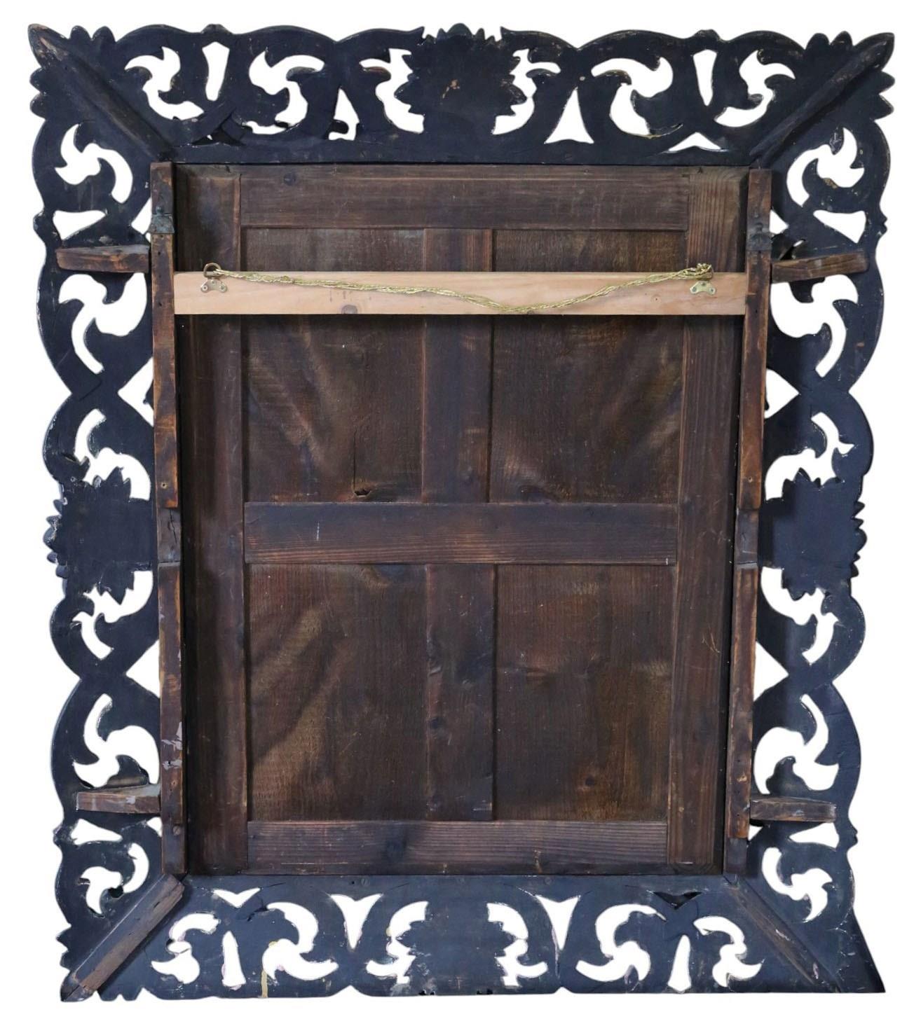 Bevel-edged mirror glass is in good antique condition, showing light oxidation, sparkles, speckles, spots, hazing, minor scratches, shadowing, and other age-related imperfections
