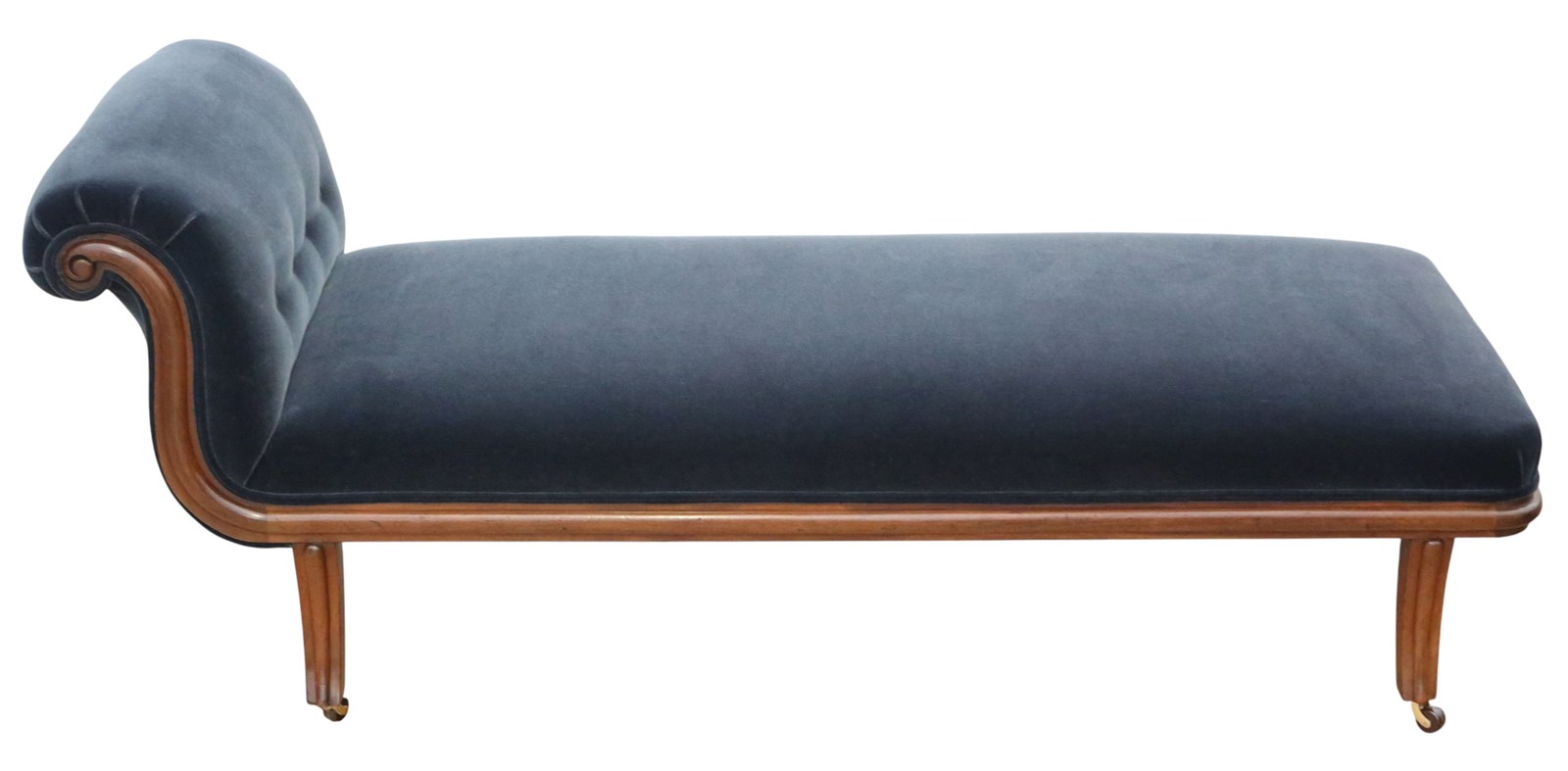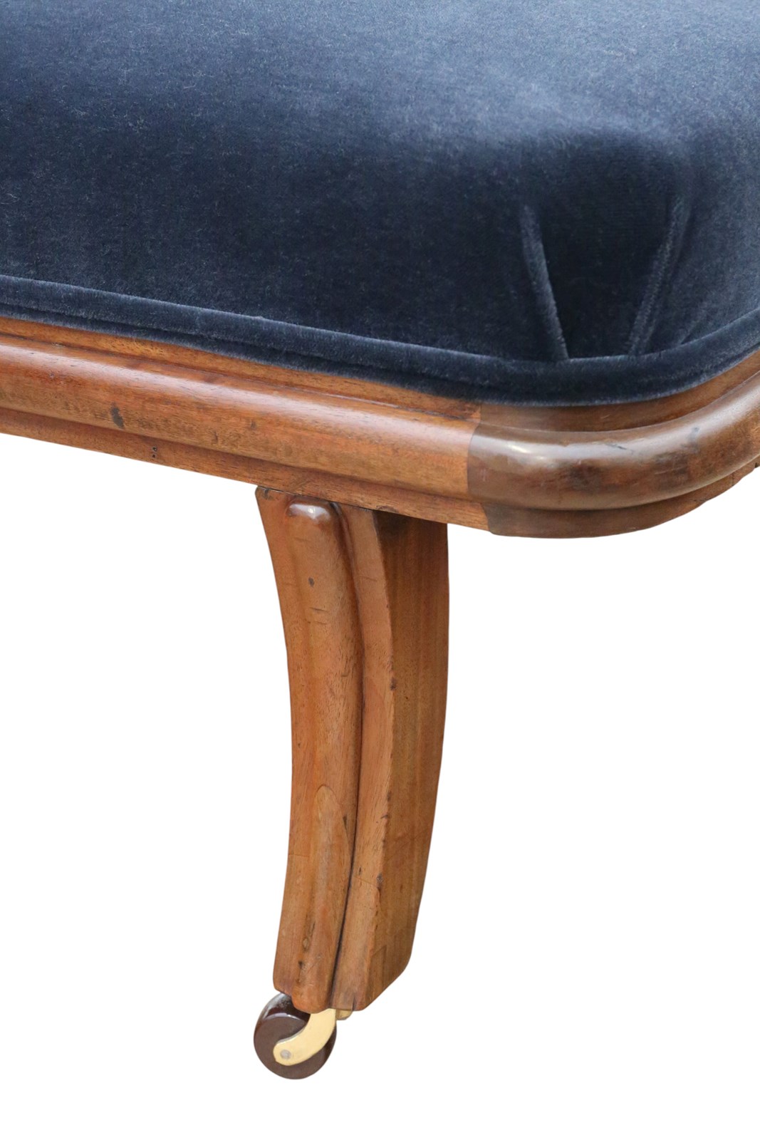 Full of authentic charm and character, this elegant 19th-century mahogany chaise lounge is a rare decorative find and perfect statement piece for the right setting. Recently reupholstered in high-quality anthracite velour, it features replacement brass and ceramic castors, lovely clean lines, and refined proportions that combine comfort with timeless style.