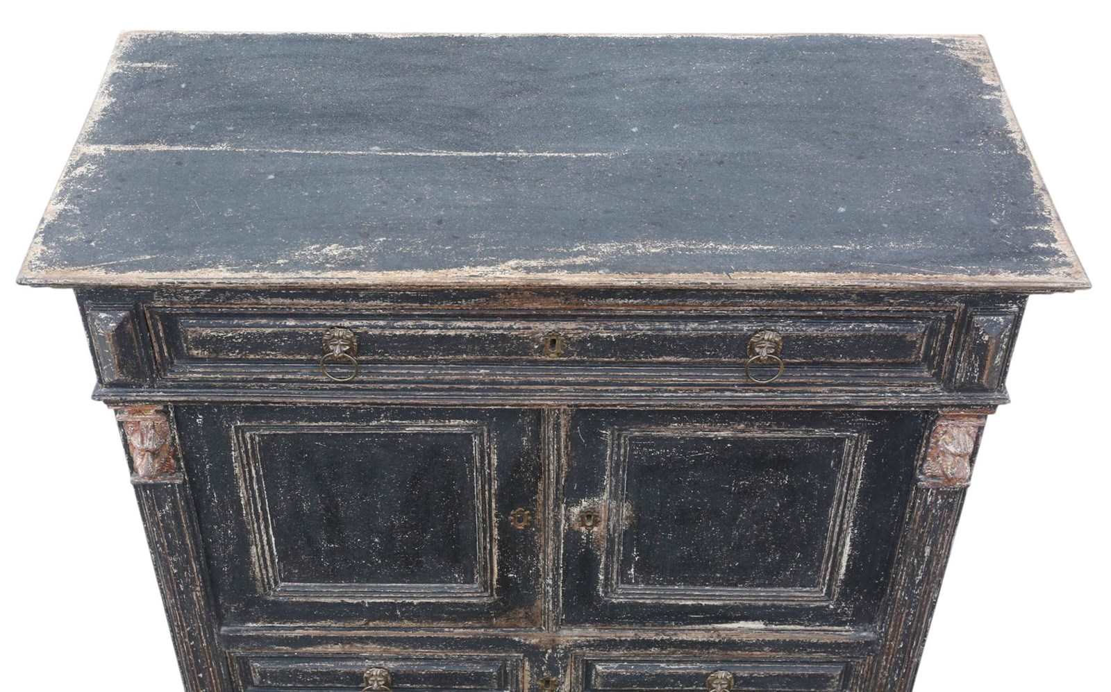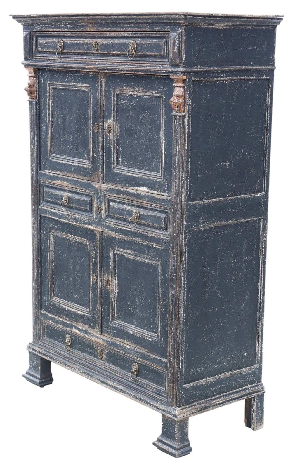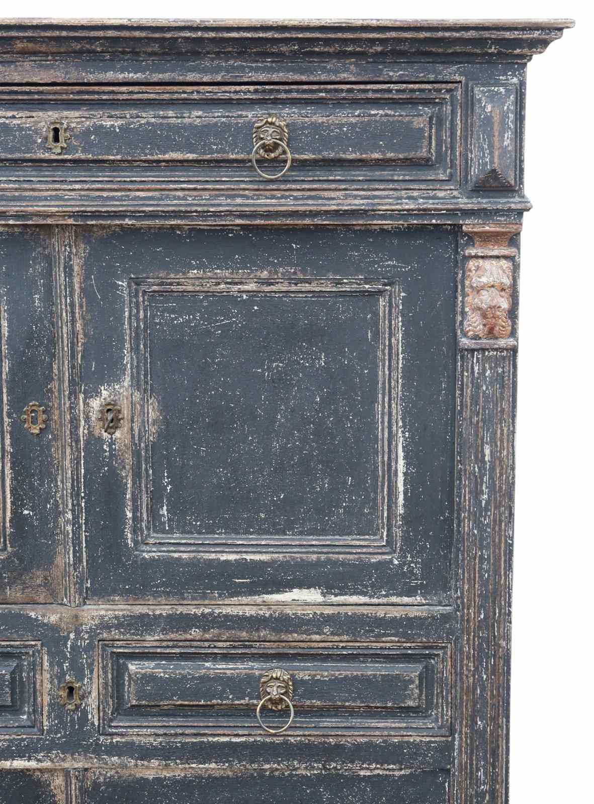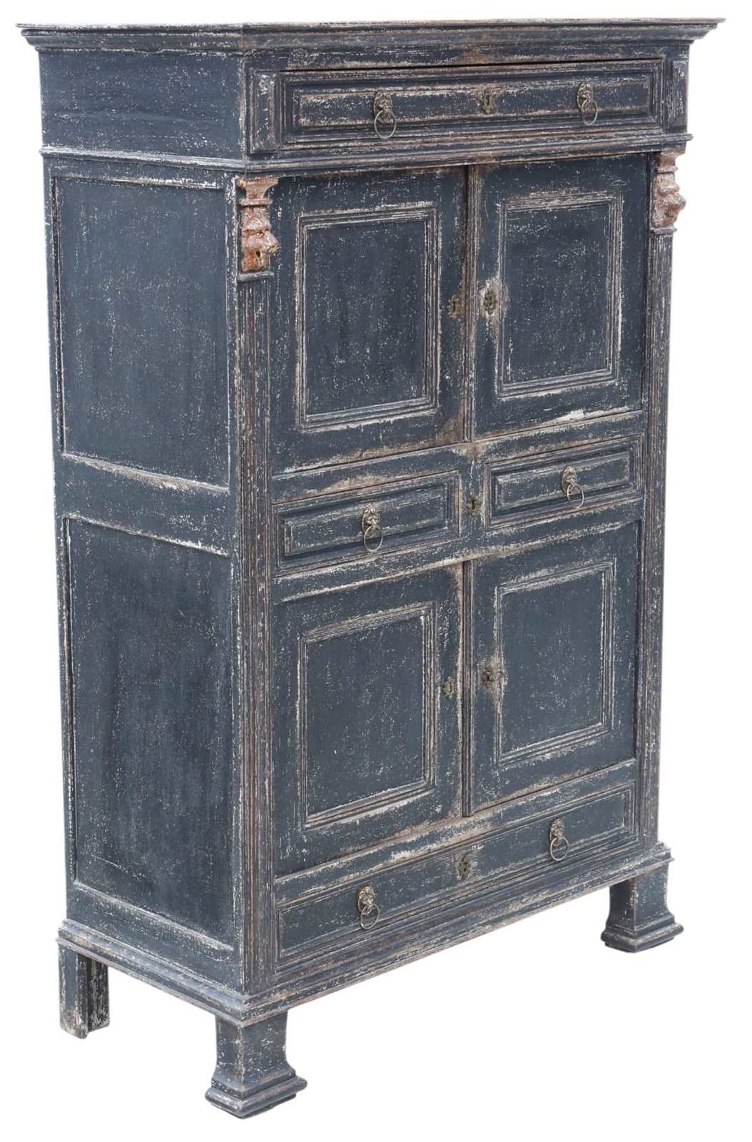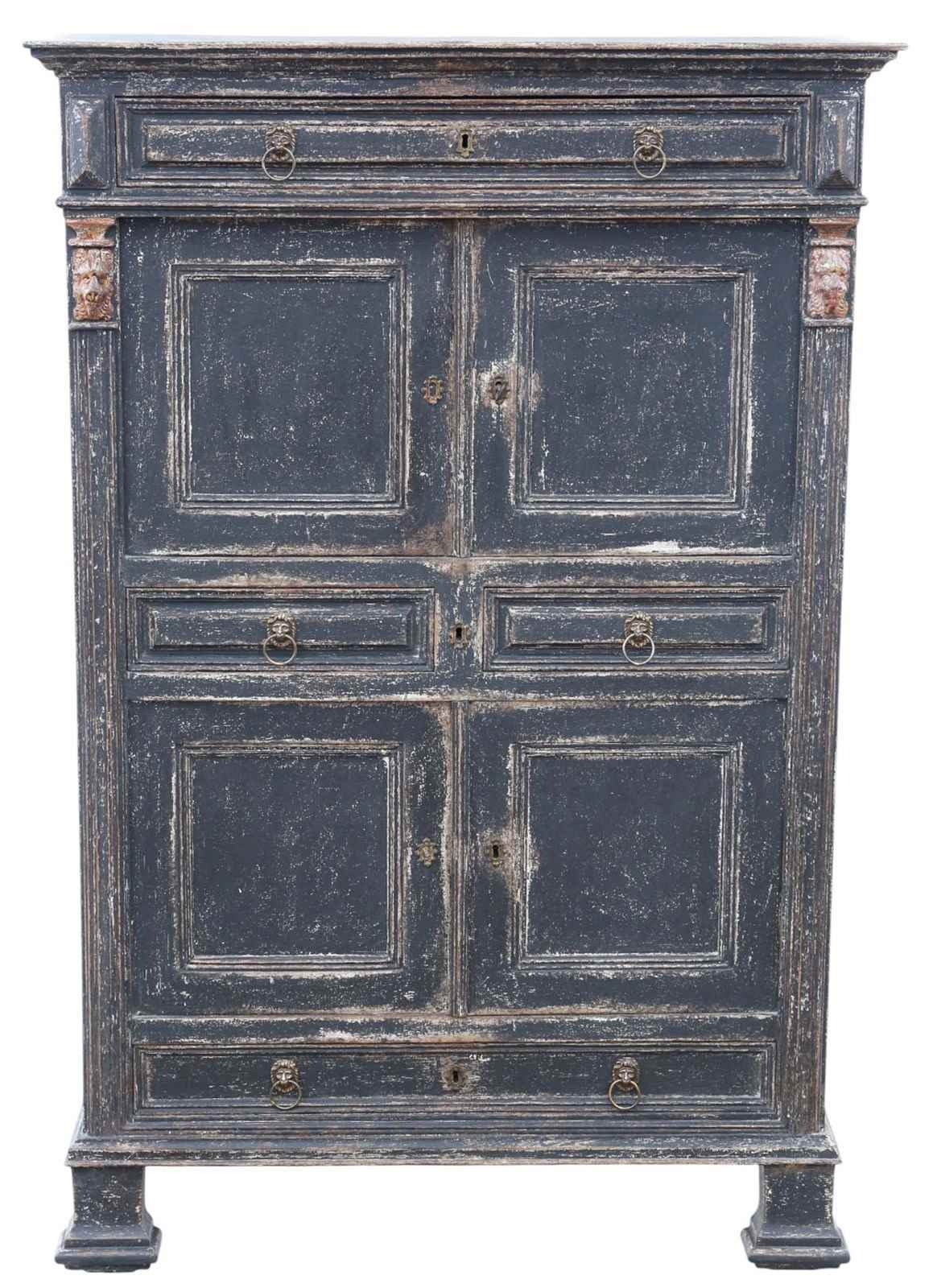 Also known as an estate cupboard, this fine 19th-century painted larder is a wonderful example of period country house furniture. With its lion-mask detailing and beautifully worn grey painted finish, it exudes character and timeless rustic charm.