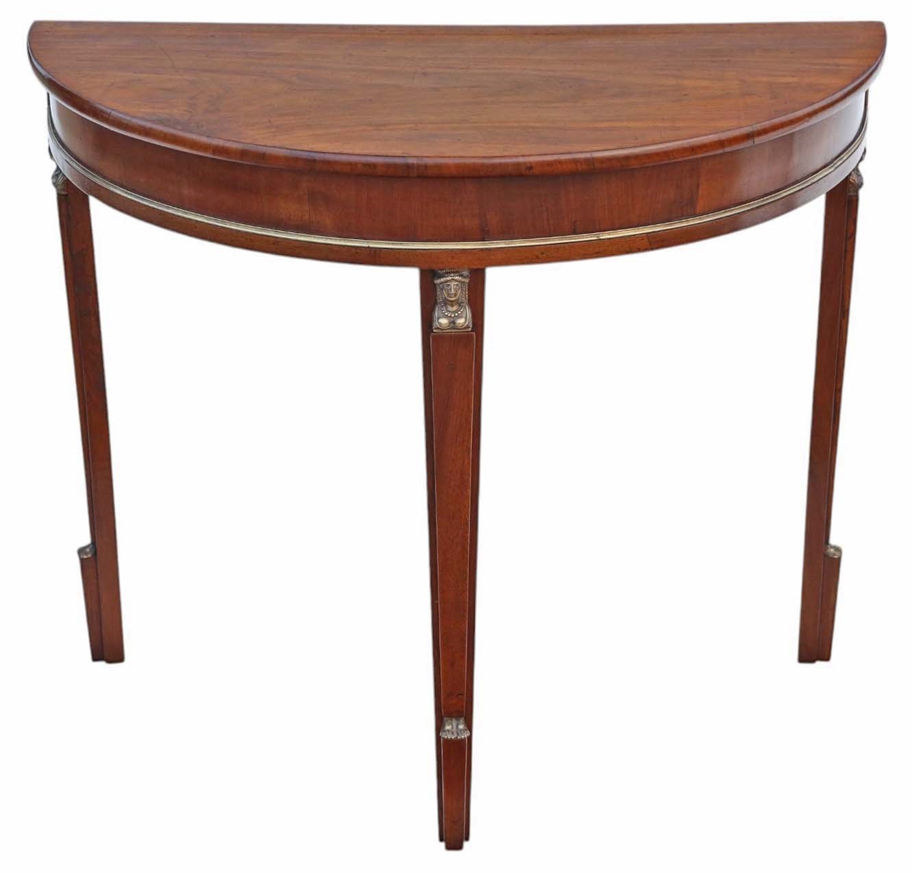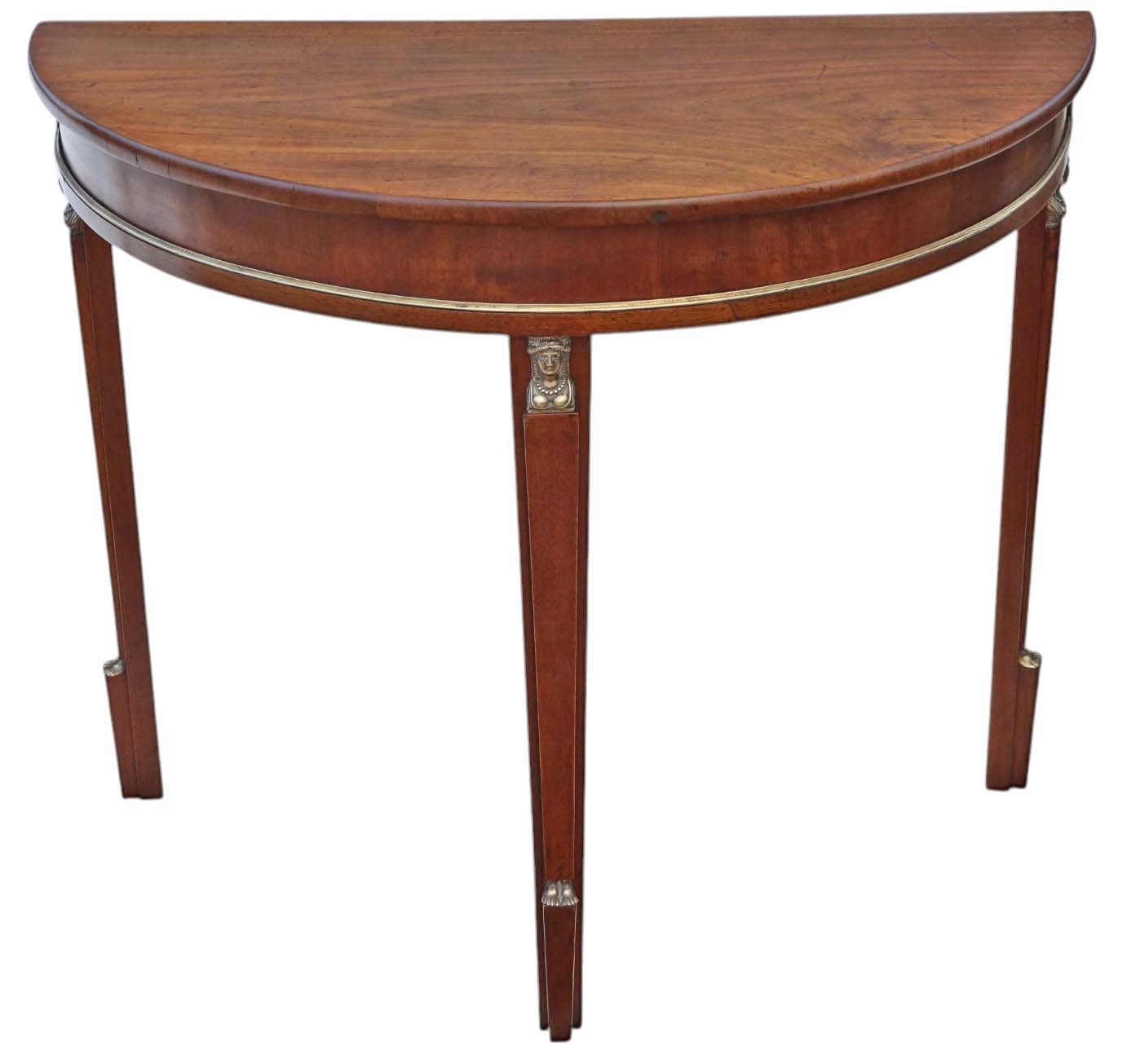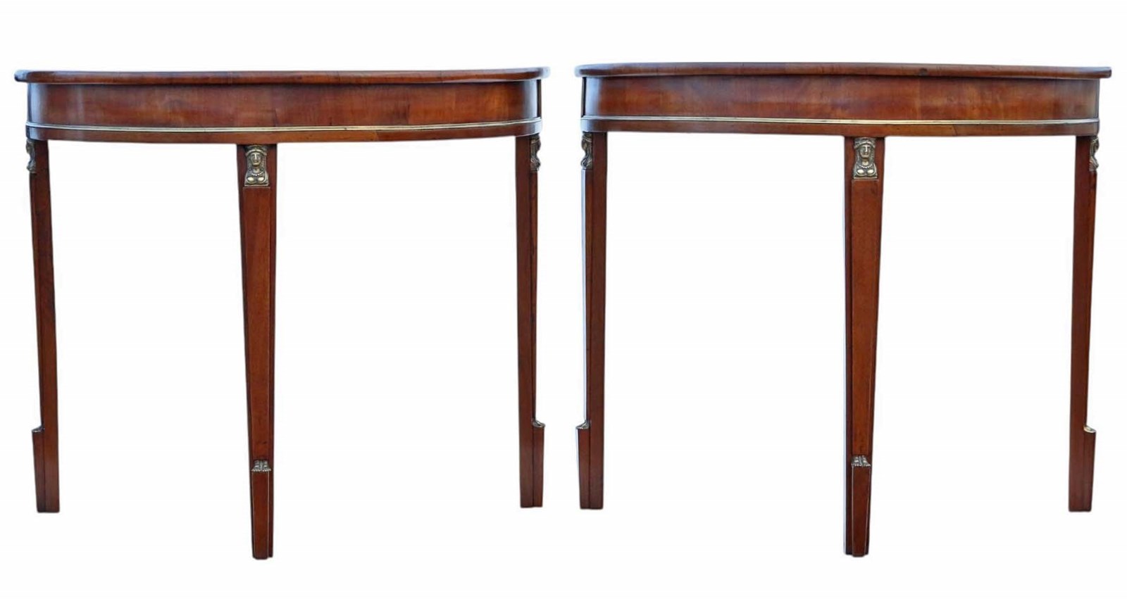 Antique 19th Century Pair of Walnut Demi-Lune Console Tables – Egyptian Influence with Brass Mounts