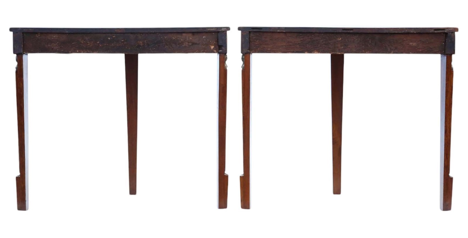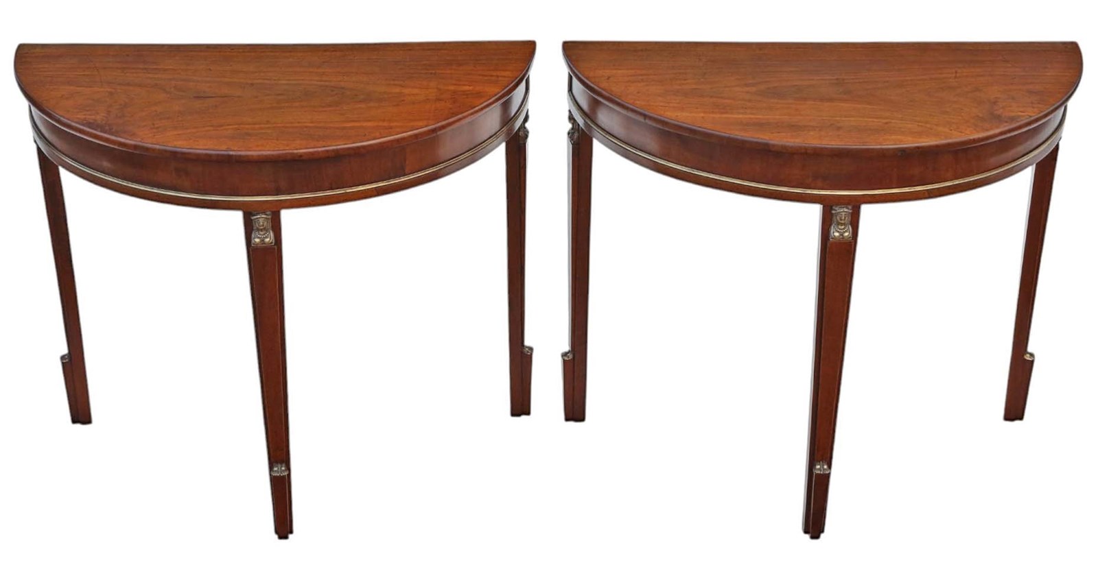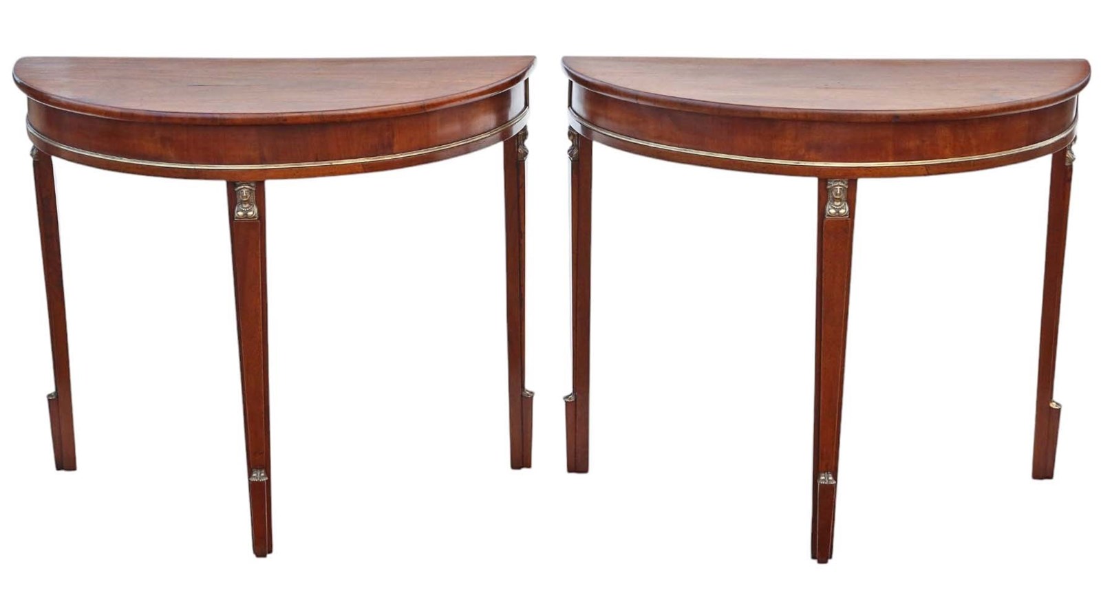 Antique 19th Century Pair of Walnut Demi-Lune Console Tables – Egyptian Influence with Brass Mounts