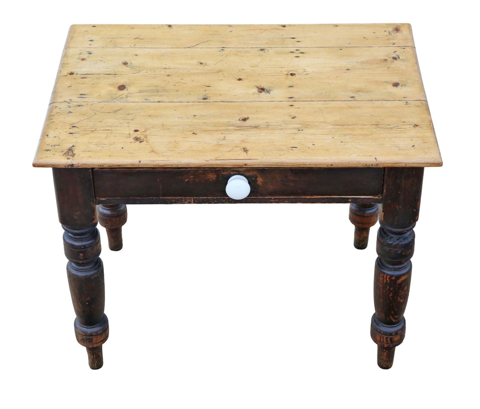 A charming 19th-century pine kitchen or writing table with attractive age, colour, and patina. This rare decorative find would make a wonderful statement piece in the right setting. Its base retains its original finish, and the drawer features a white ceramic knob with appealing surface crazing from age.