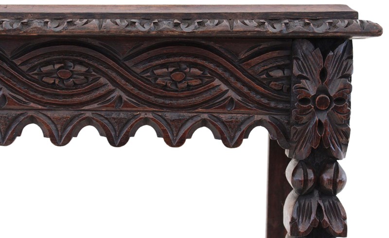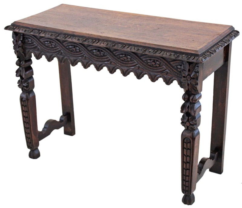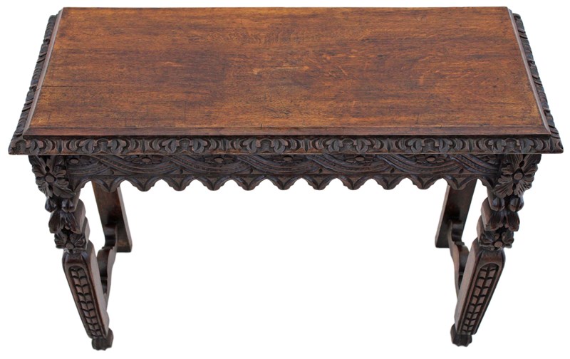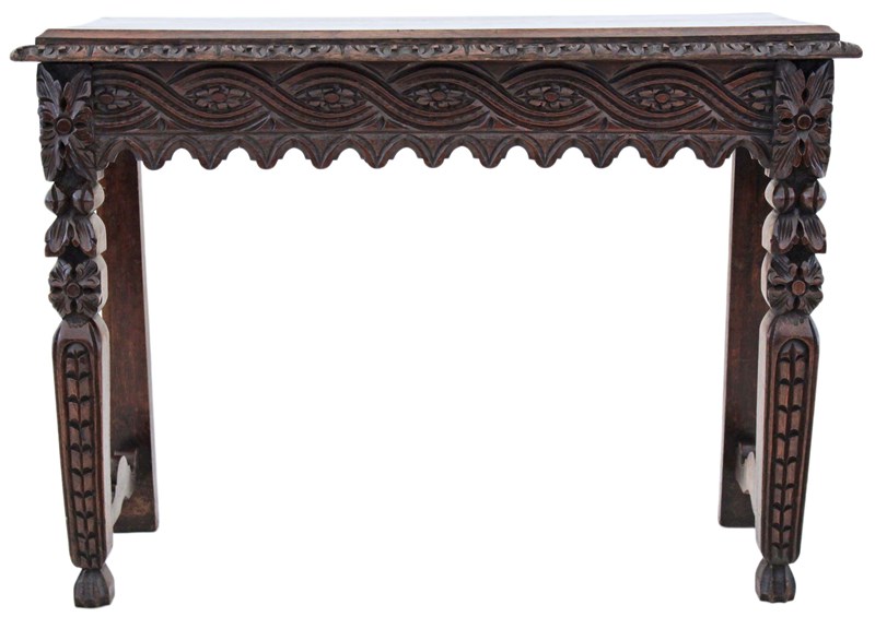 A striking 19th-century Victorian oak writing table, richly carved and full of charm and character. This is a particularly unusual and quite rare piece, showcasing bold craftsmanship and a strong sense of period style. The table has a wonderful colour, age, and patina, making it a standout decorative and practical addition to the right setting. With its versatile use as a hall, side, or writing table, it offers both beauty and functionality.