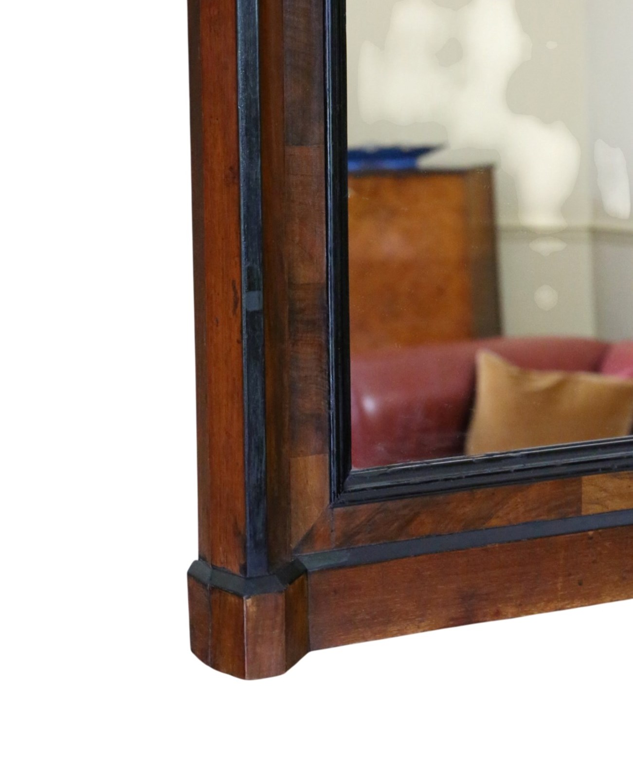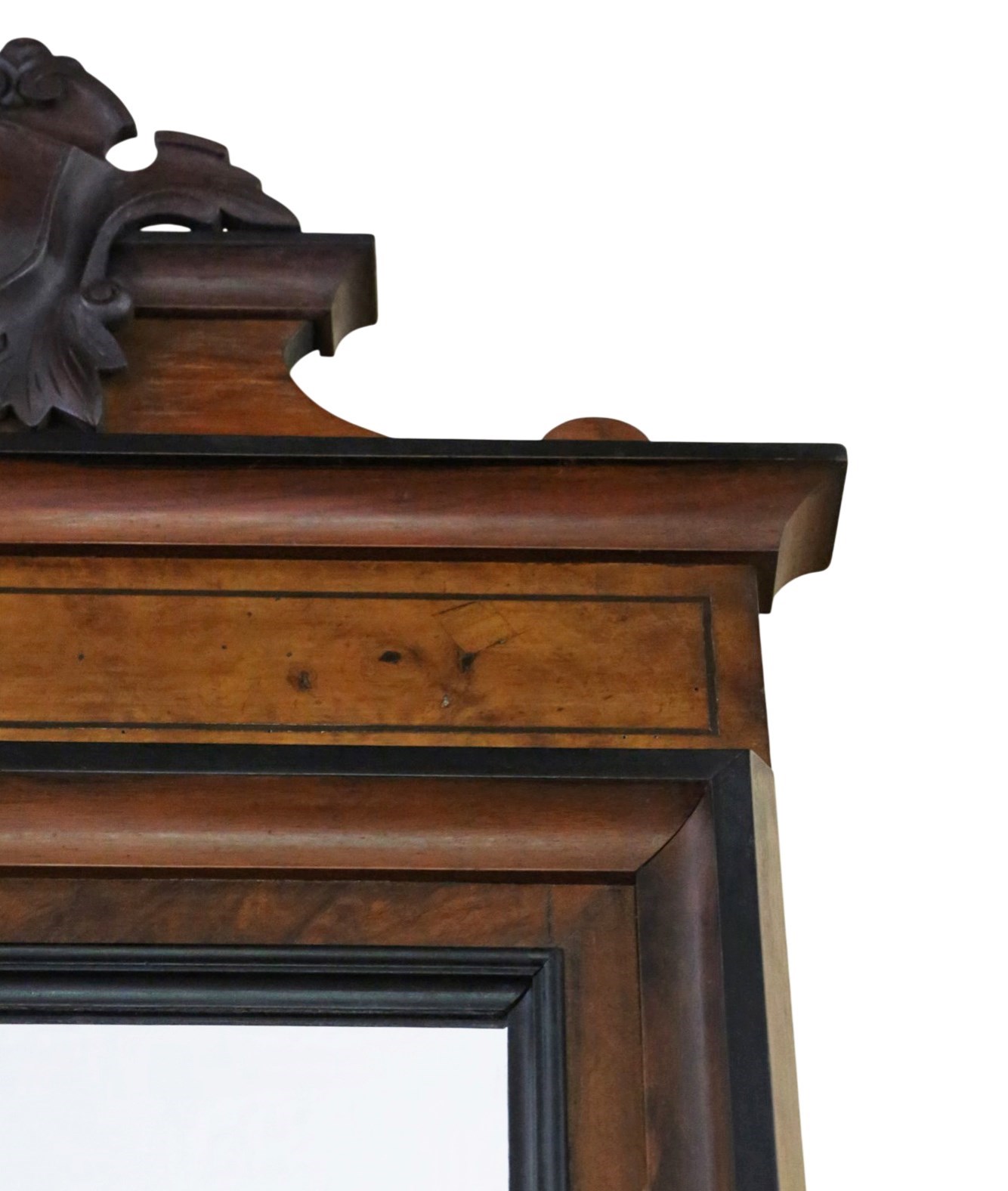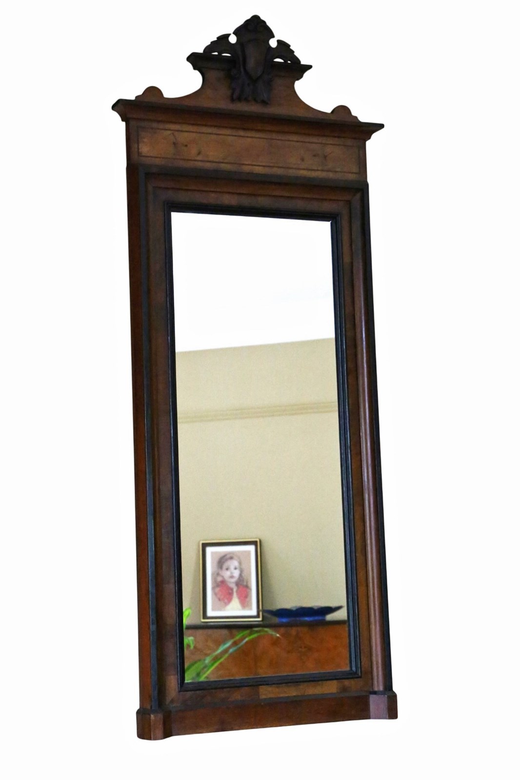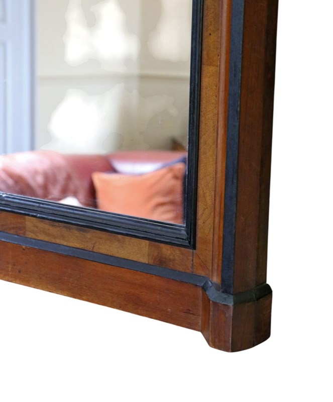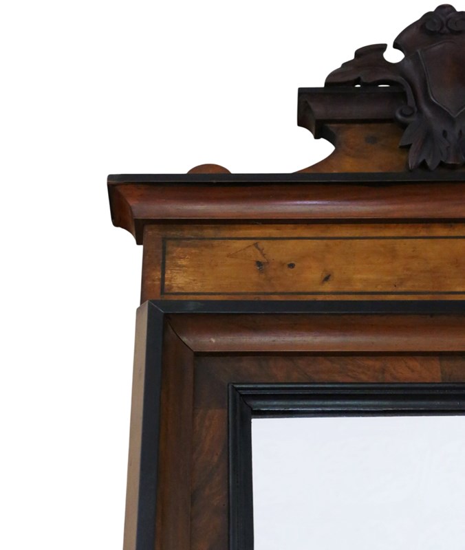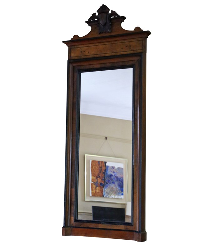 A striking 19th-century tall mirror, beautifully crafted in walnut with a warm, aged patina. Full of charm and character, this rare decorative piece would make a wonderful statement in any setting. Its elegant rectangular inlay and crested top add a subtle, refined flourish, while the generous height allows it to be used either as a floor or wall mirror.