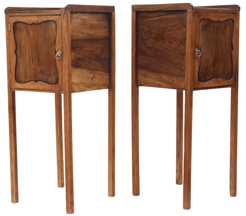 A wonderful opportunity to own a rare antique pair of walnut bedside tables that perfectly combine 19th-century elegance with everyday practicality.