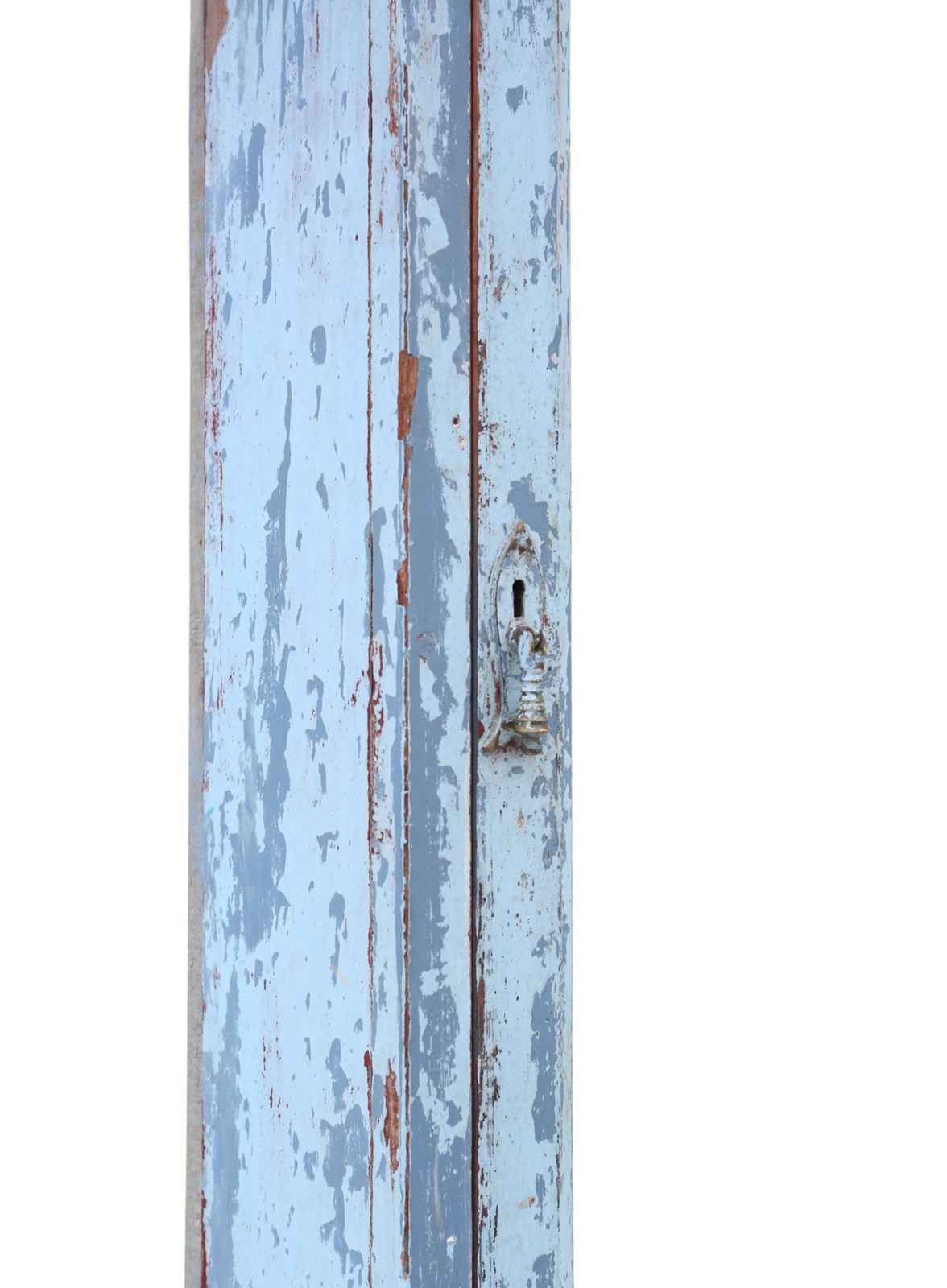Full of authentic charm and character, this rare antique cabinet cupboard would complement a period, contemporary, or country-inspired interior wonderfully. Designed to be hung on the wall, it features two shelves inside and practical hangers on the back for easy installation. Distressed blue paint contributes to its rustic finish; the inside of the cabinet can be repainted if desired.