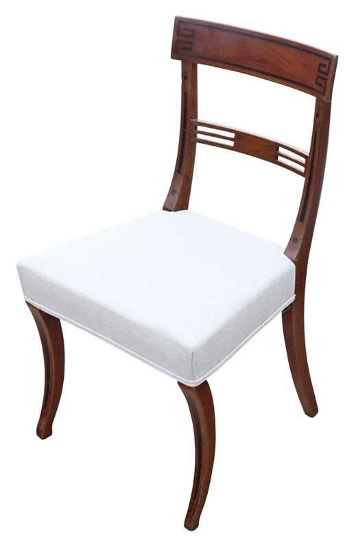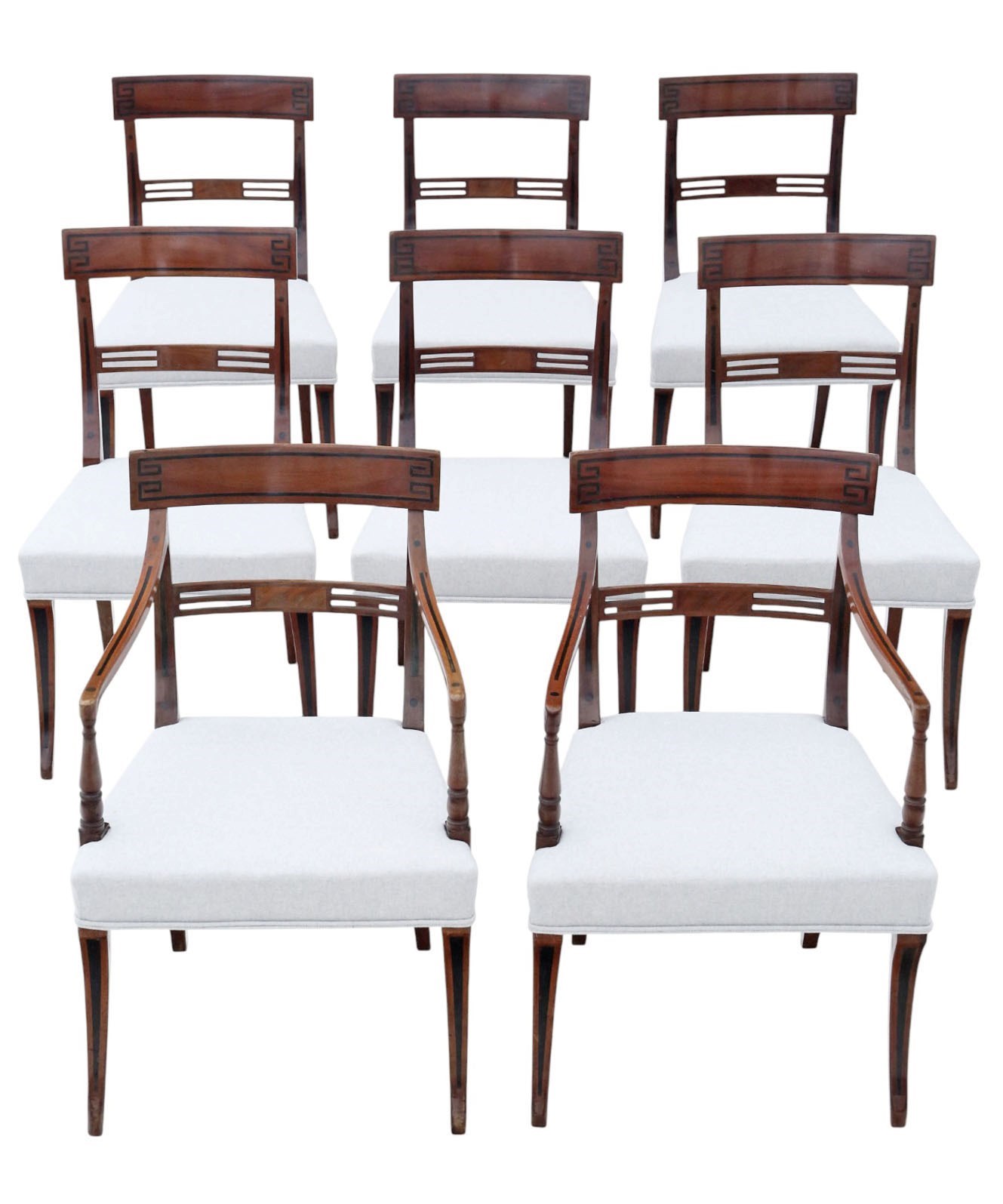 A rare decorative find, this set of eight early 19th-century Georgian mahogany dining and carver chairs is full of age, character, and charm. With new professional upholstery, they bear desirable sabre legs and ebonised Greek key inlays—the latter a distinctive Regency / Georgian feature. These chairs are structurally sound and would make a practical yet elegant addition to a dining room, study, or period-inspired interior.