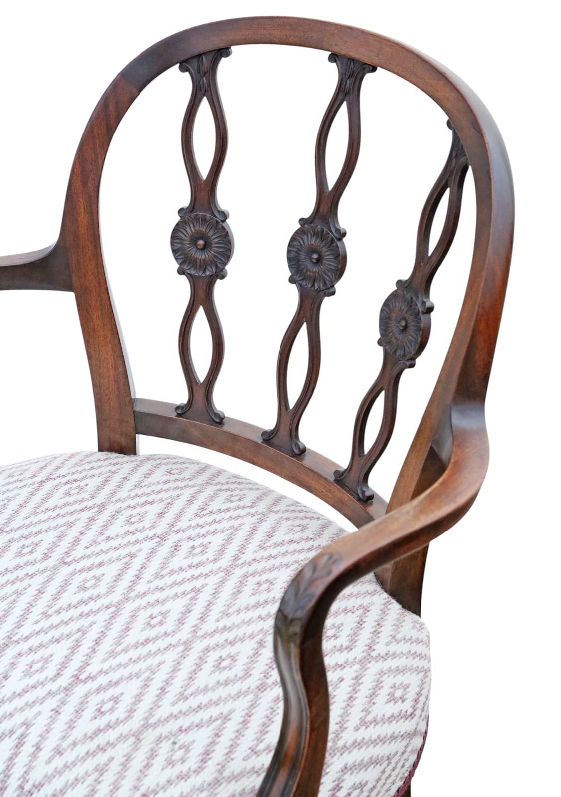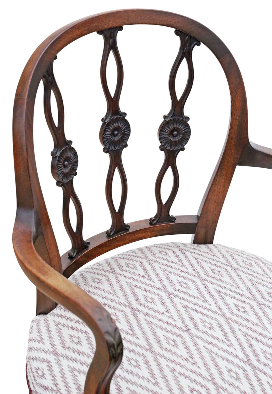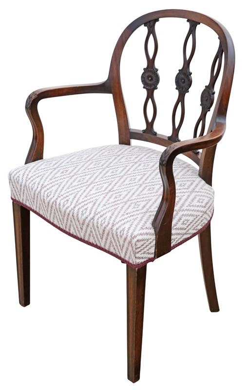 Full of authentic charm and character, this early 19th-century mahogany elbow chair is rare, decorative and ideal for use as a dining, side, or desk chair. It features a lovely design with intricate carving and has recently been professionally reupholstered, combining comfort with timeless elegance.