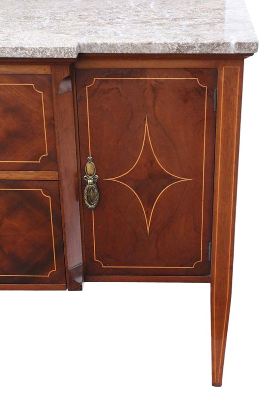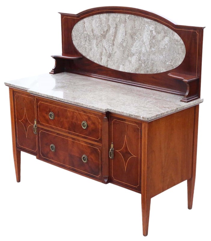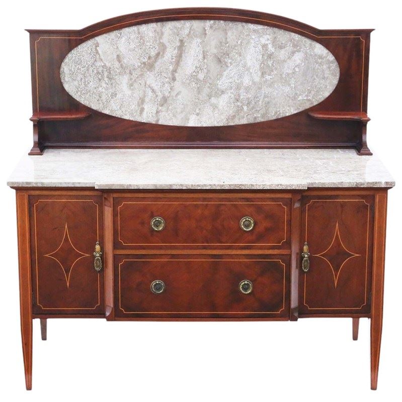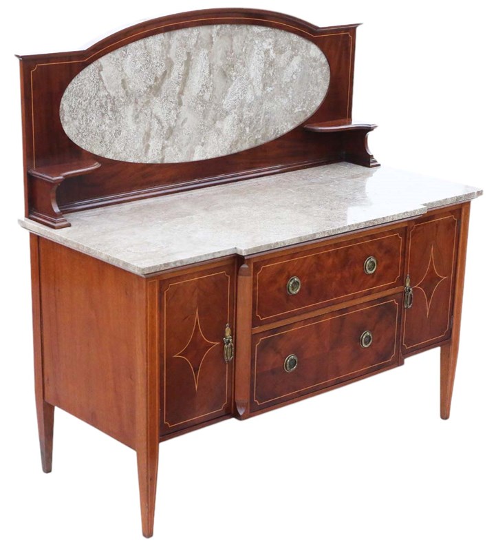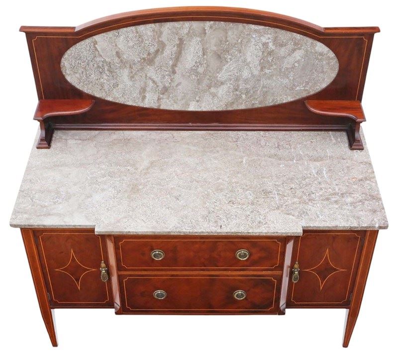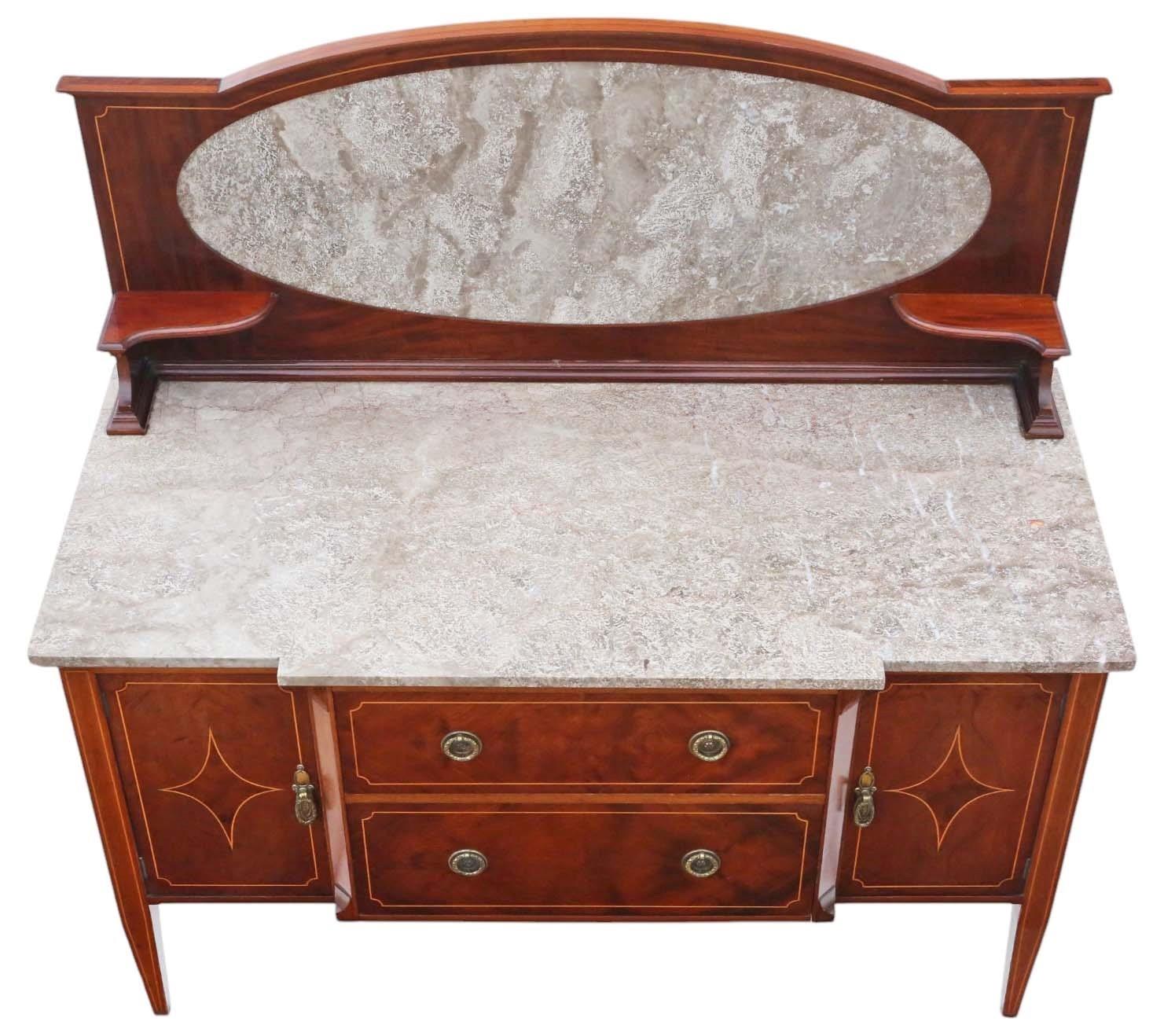 Antique High-Quality Antique C1920 Mahogany Washstand Side Dressing Table. This piece boasts a lovely age, color, and patina, standing out as a rare decorative find. Very attractive line inlays and quality marble top and splash back.