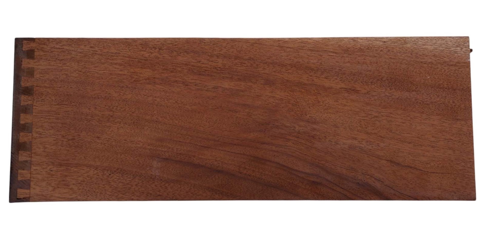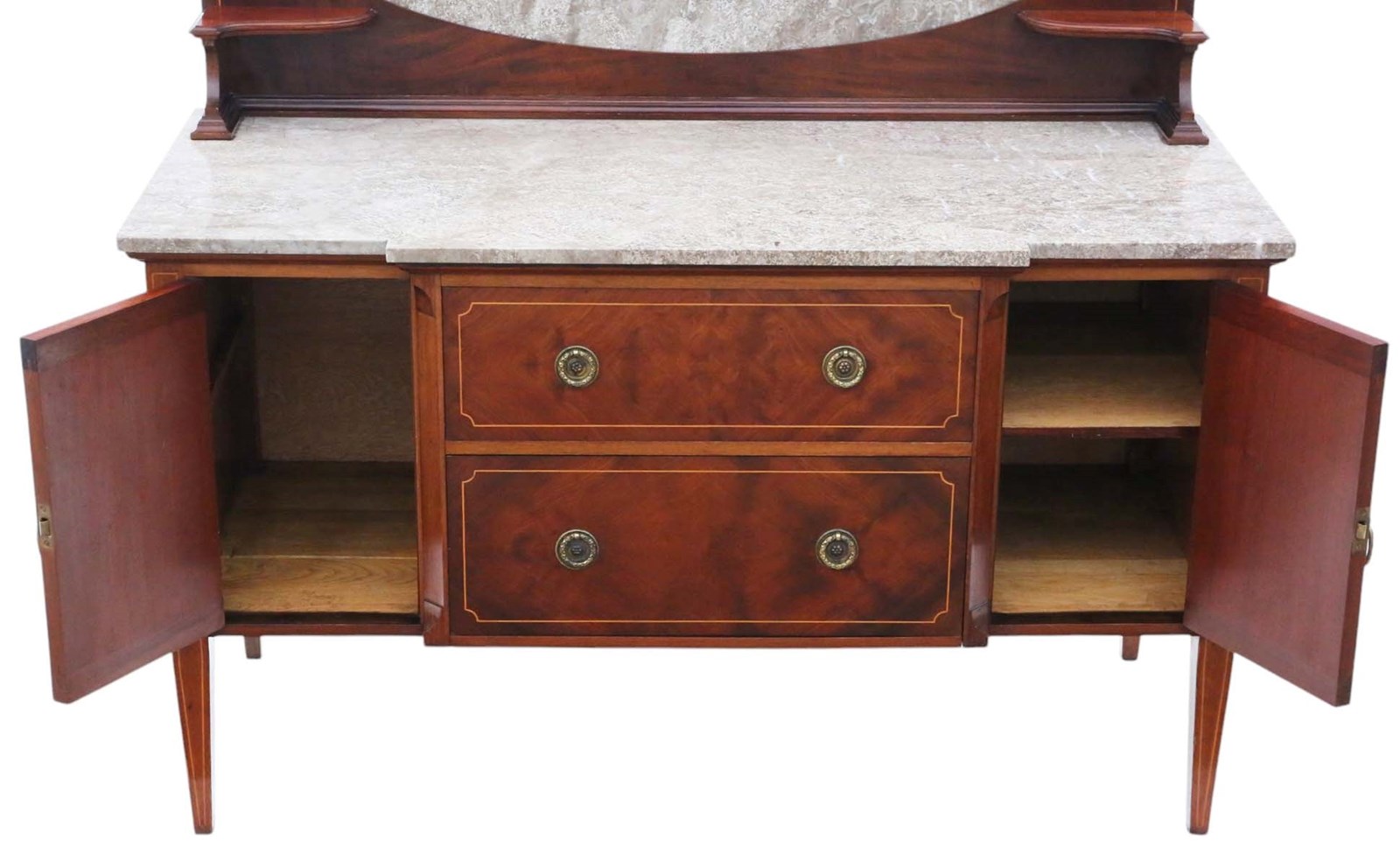 Solid and sturdy, with no loose joints or woodworm, it exudes age, character, and charm. The mahogany lined drawers slide freely and the cupboards have catches, adding to the functionality.