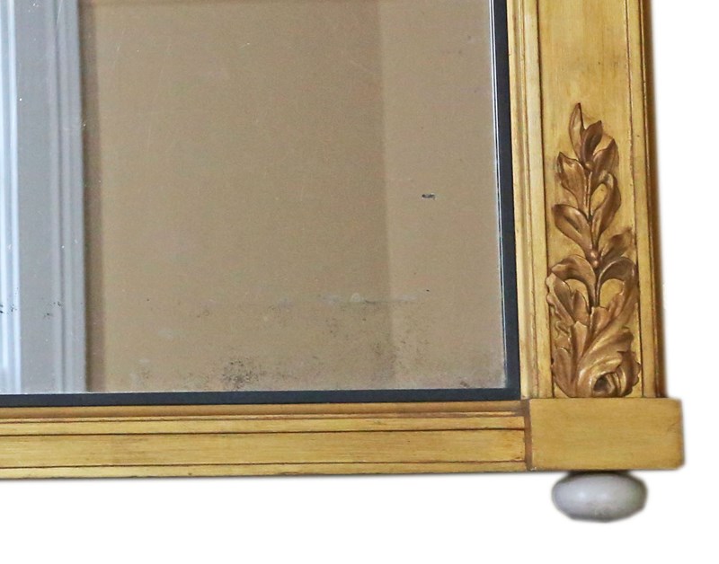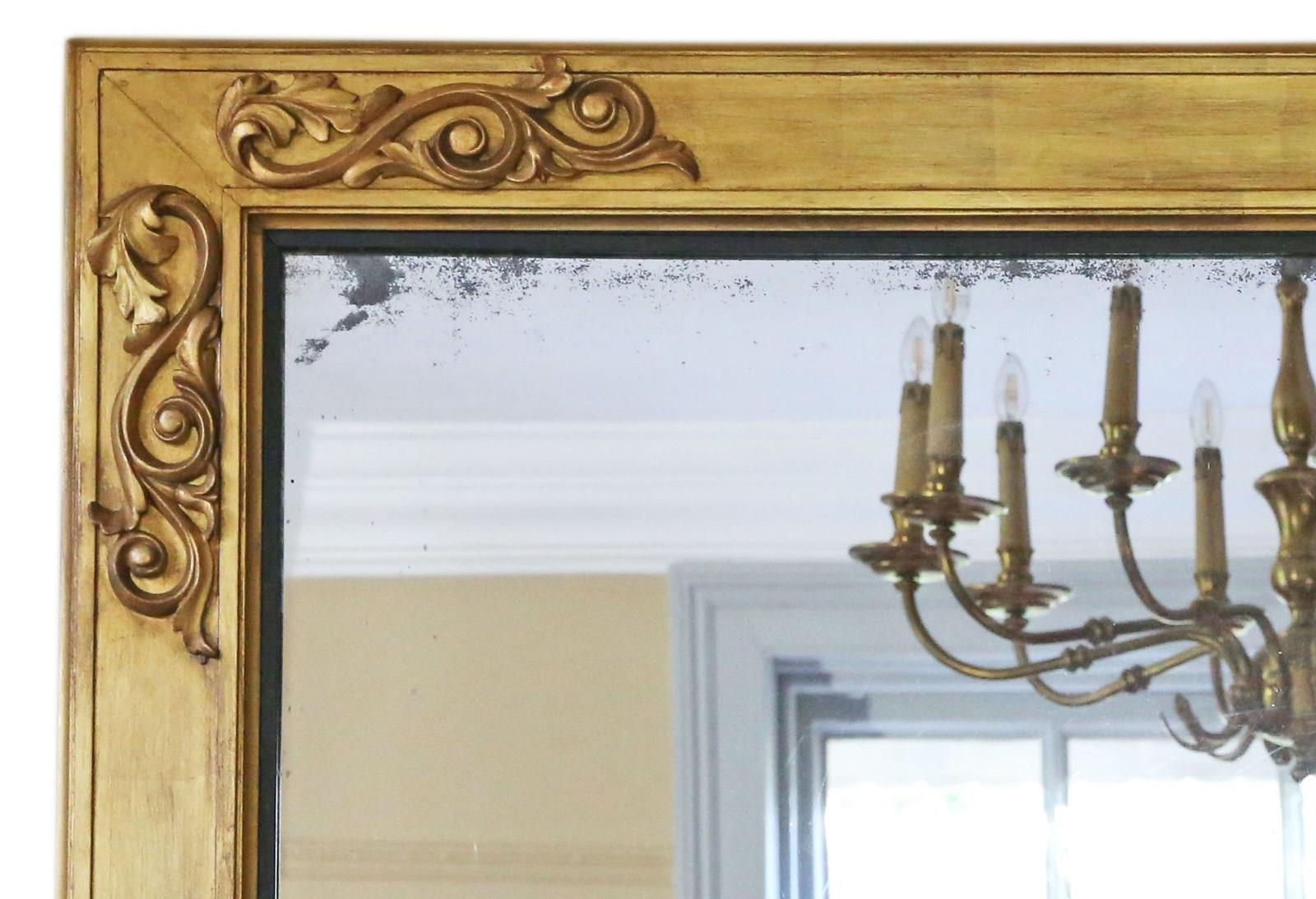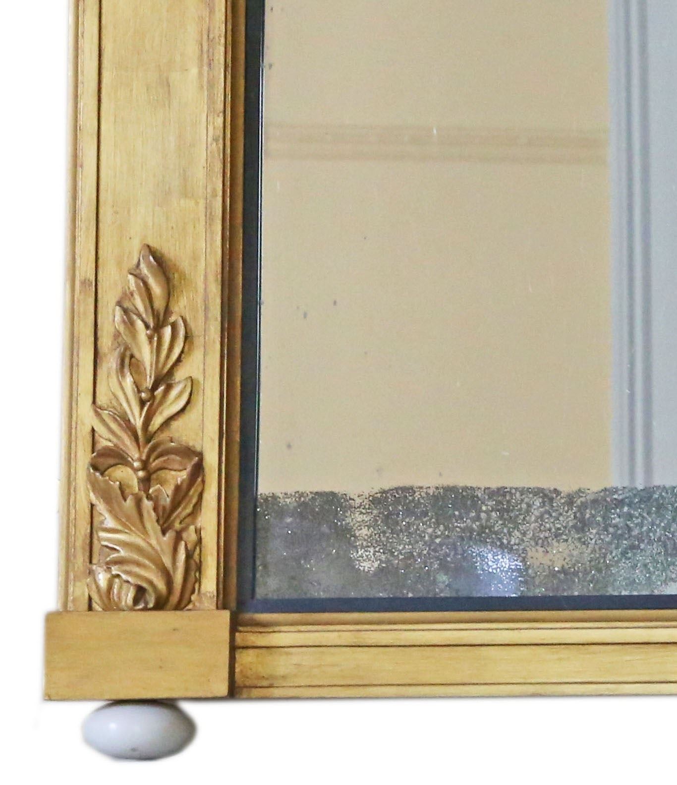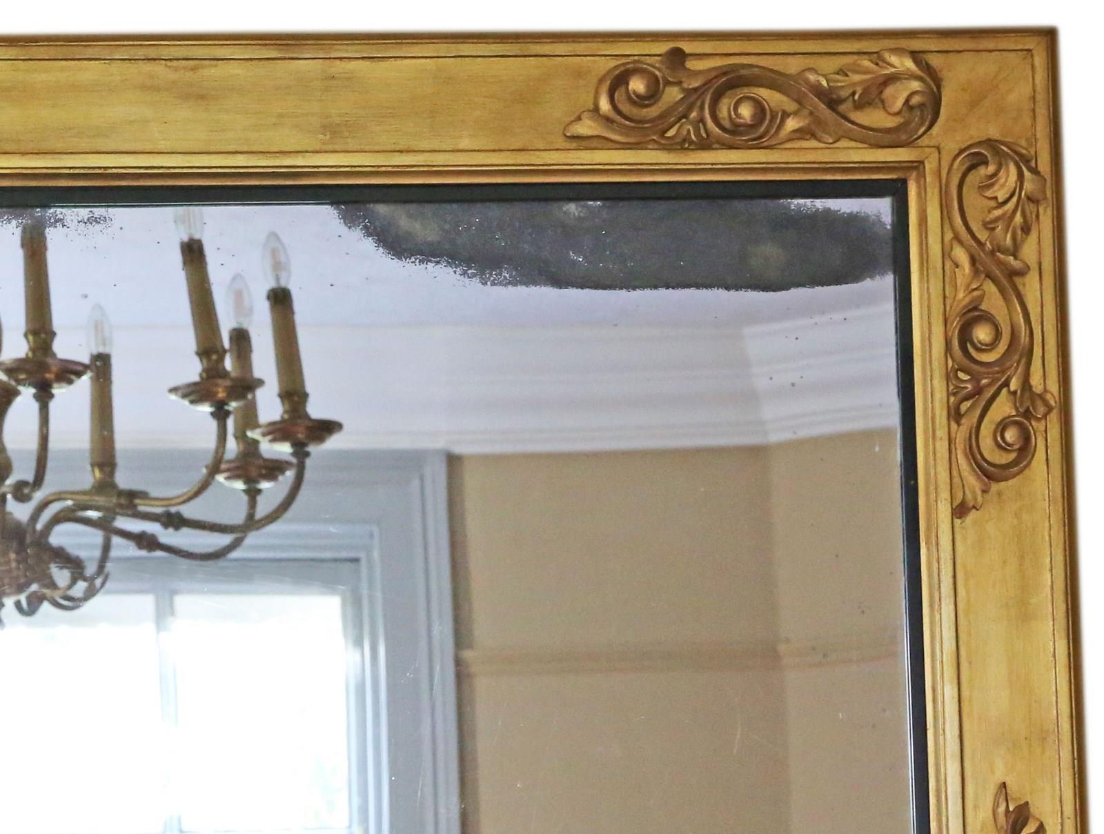 Antique large fine quality decorative giltwood overmantle wall mirror, 19th Century. An impressive rare find, that would look amazing in the right location. No loose joints. The original mirrored glass has medium oxidation and age related imperfections. There is a clean and sharp reflection from the main central portion of the mirror and an original back. Historically the frame has been professionally restored and has minor knocks, losses and touching up since. Overall maximum dimensions: 135cmW x 79cmH x 7cmD. Glass 111cmW x 58cmH. In very good antique condition, with historic knocks, marks, wear and imperfections. The removable mantle feet are later. Stock No. 8295. 30-day no-quibble money-back guarantee. Competitive UK and overseas door to door shipping.