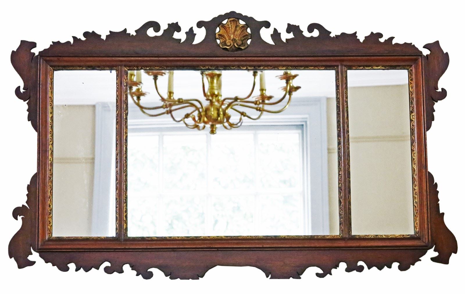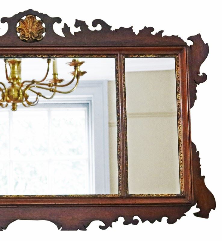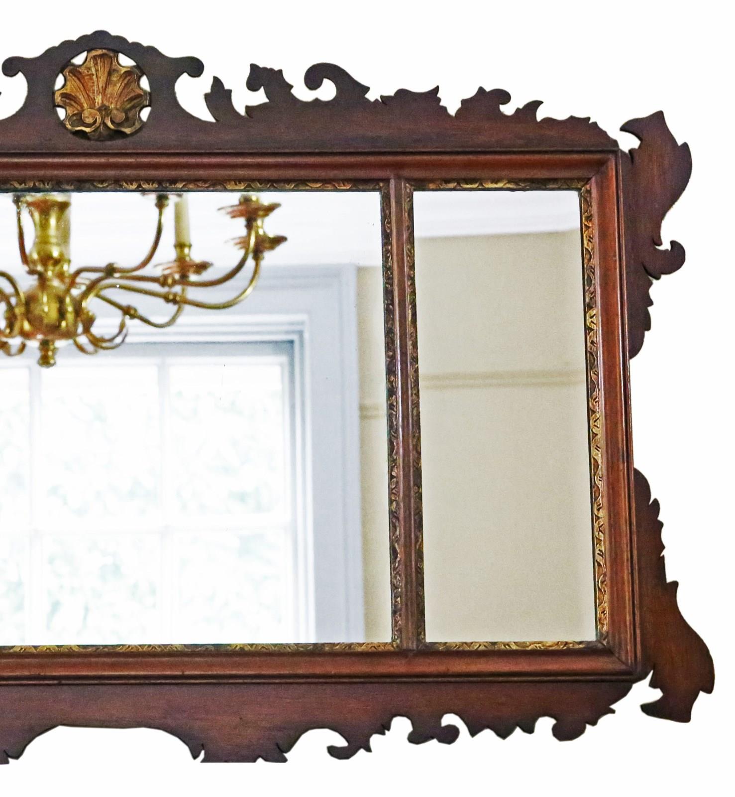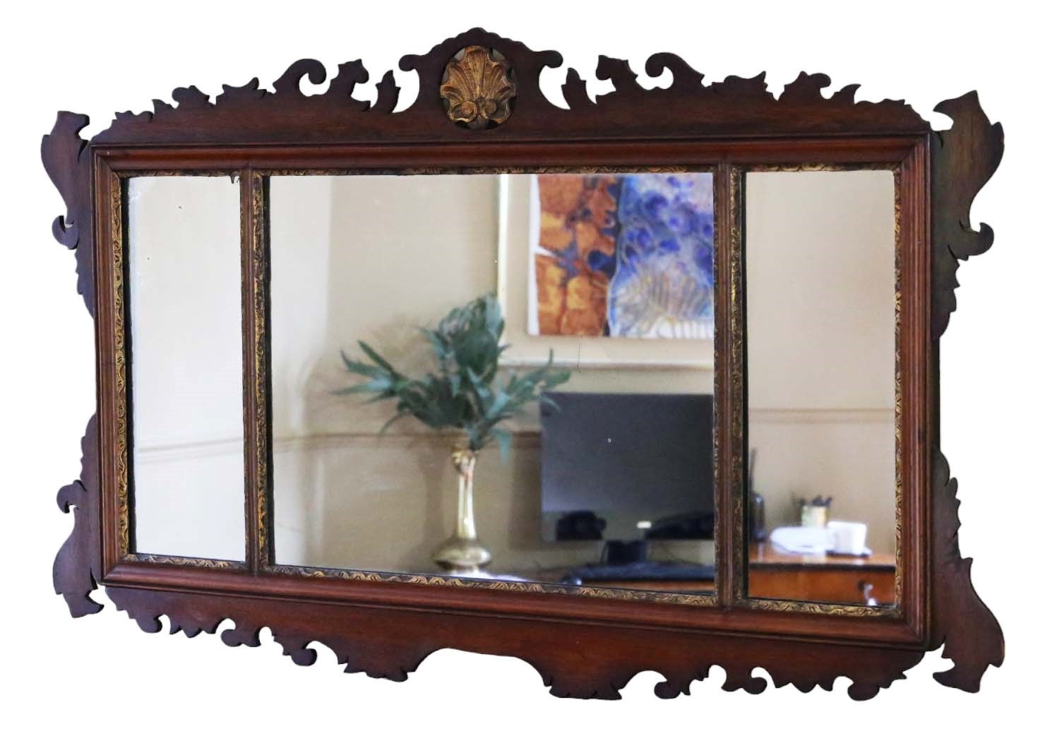 Antique large gilt and mahogany overmantle wall mirror from circa 1900, featuring fine quality and adorned with a decorative fret-cut design.