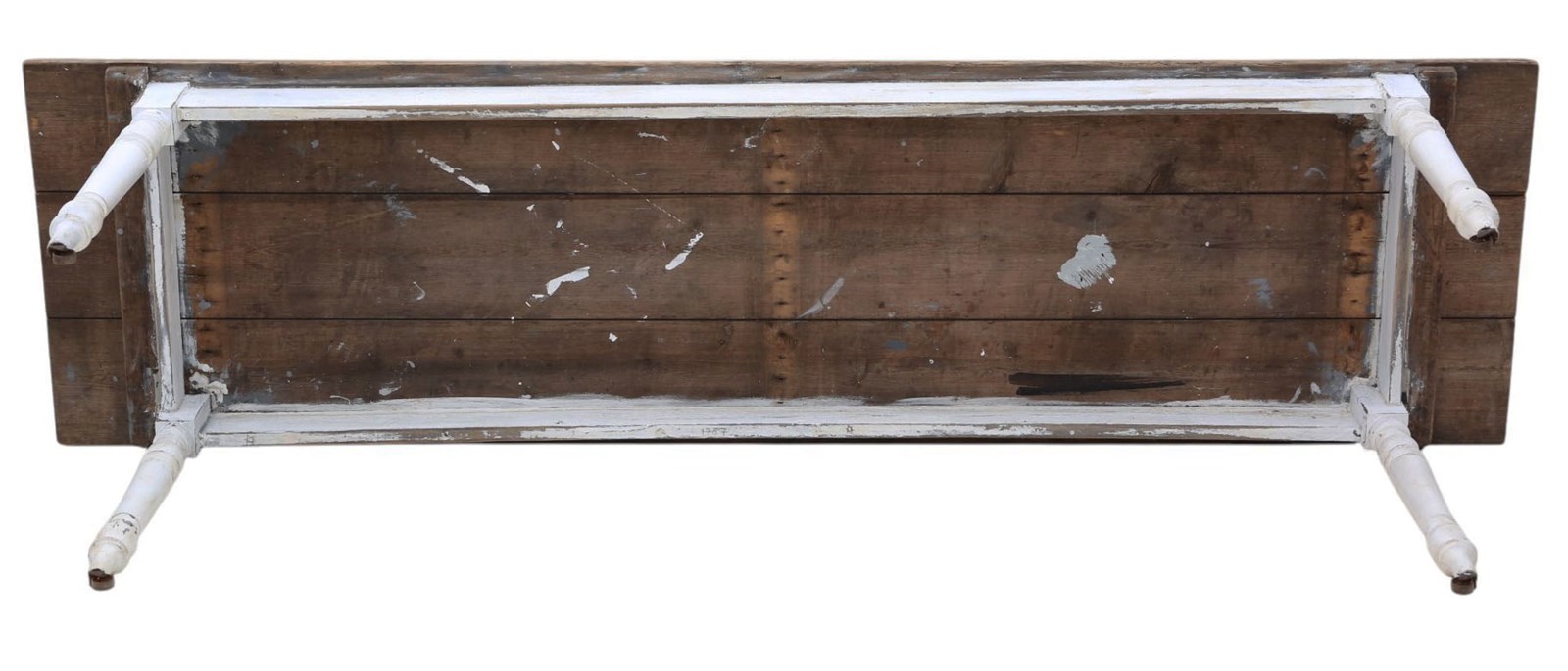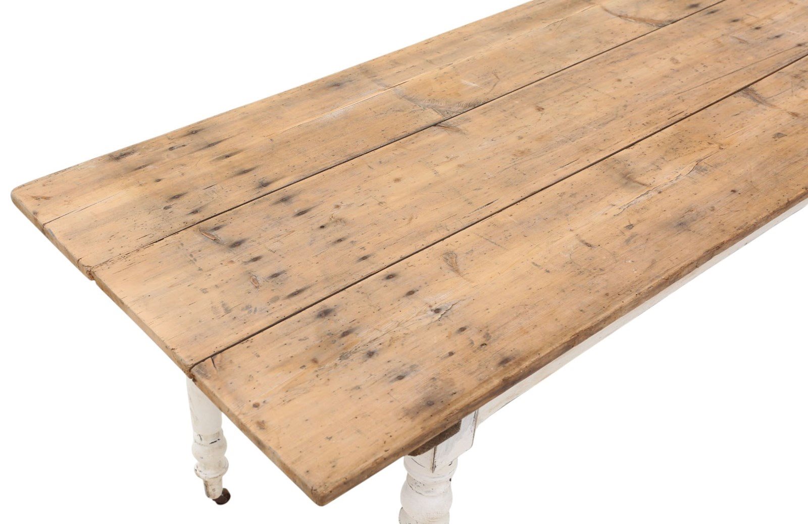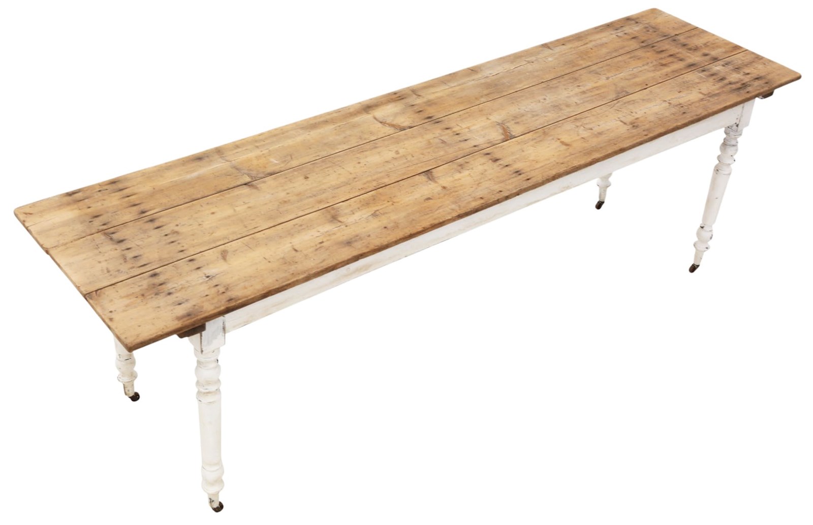 A charming and practical antique table dating from the late 19th to early 20th century, with a beautifully patinated pine top. Its long, narrow proportions and rustic character make it ideal as a kitchen dining or serving table, blending seamlessly into both traditional and eclectic interiors. The base retains traces of old, worn white paint, adding to its farmhouse appeal.