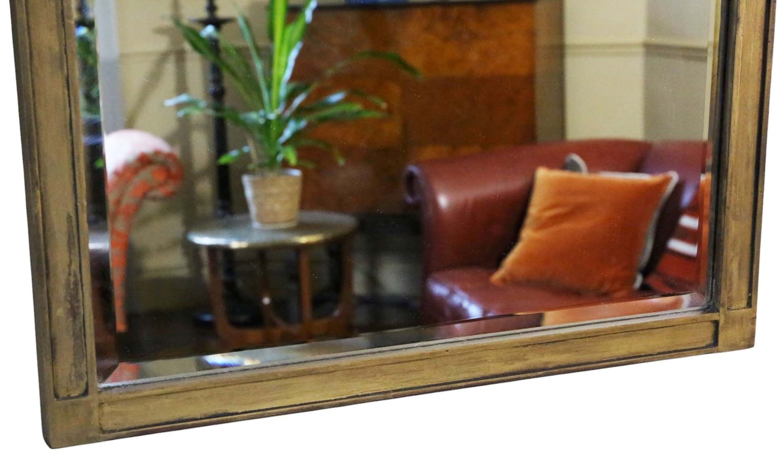 The bevel edge mirrored glass has very light oxidation and other minor age related imperfections. A clear and sharp reflected image.