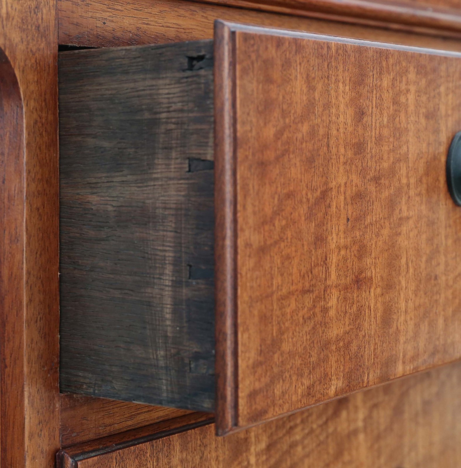 Antique 19th Century inlaid mahogany tallboy chest on chest of drawers. This is a lovely chest, that has been restored historically to a good standard. Attractive fiddle-back veneers, with a nice light colour. Drawers slide freely. Solid strong and heavy...splits into two halves for transport. No loose joints and the oak lined drawers slide freely. Separates into two halves for transport. Overall maximum dimensions: 114cmW x 57cmD x 192cmH (88cm bottom, 104cm top). In very good antique condition with historic knocks, marks, cracks, scratches, wear, imperfections, repairs and alterations, as is always the way and to be expected with genuine antique furniture. There are no keys and the locks are consequently untested. There are just a few historic extinct woodworm holes (to be expected), that we have treated for good measure. Some handles have been replaced. There is a key hole escutcheon missing from the bottom drawer. The customer will need to provide a strong able bodied person(s) for our driver to assist with carrying. Stock No. M8106. 30 day no quibble money back guarantee. Competitive UK and overseas door to door shipping.