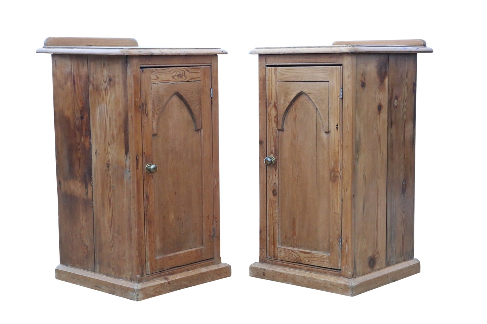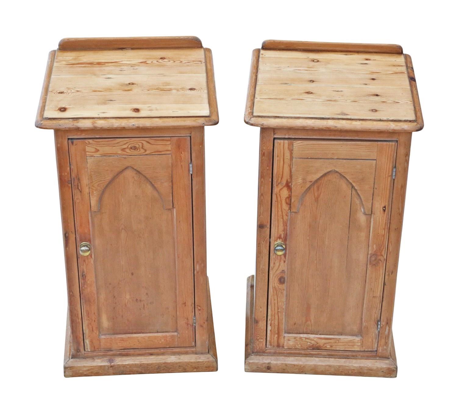 A pair of 19th-century Victorian Gothic bedside tables, full of age, character, and patina. This rare decorative find features fantastic Gothic arched doors and is structurally sound, making it practical for use as bedside tables, side tables, or decorative accent pieces in period or contemporary interiors.