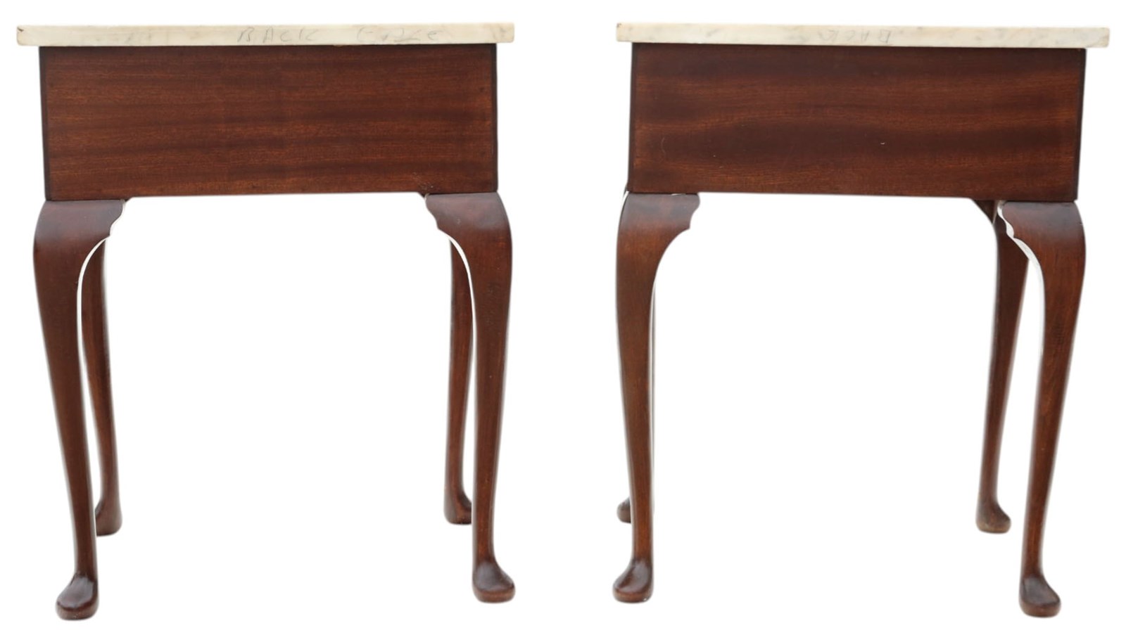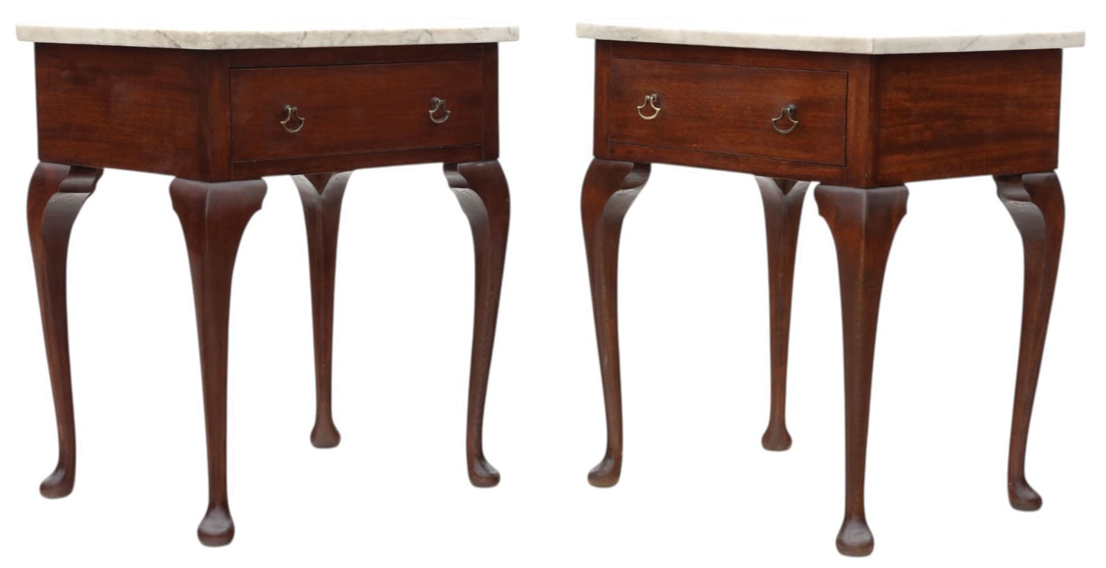 Antique c.1910 Pair of Low Mahogany Bedside Tables with Marble Tops – Fine Quality Nightstands or Lamp Tables
