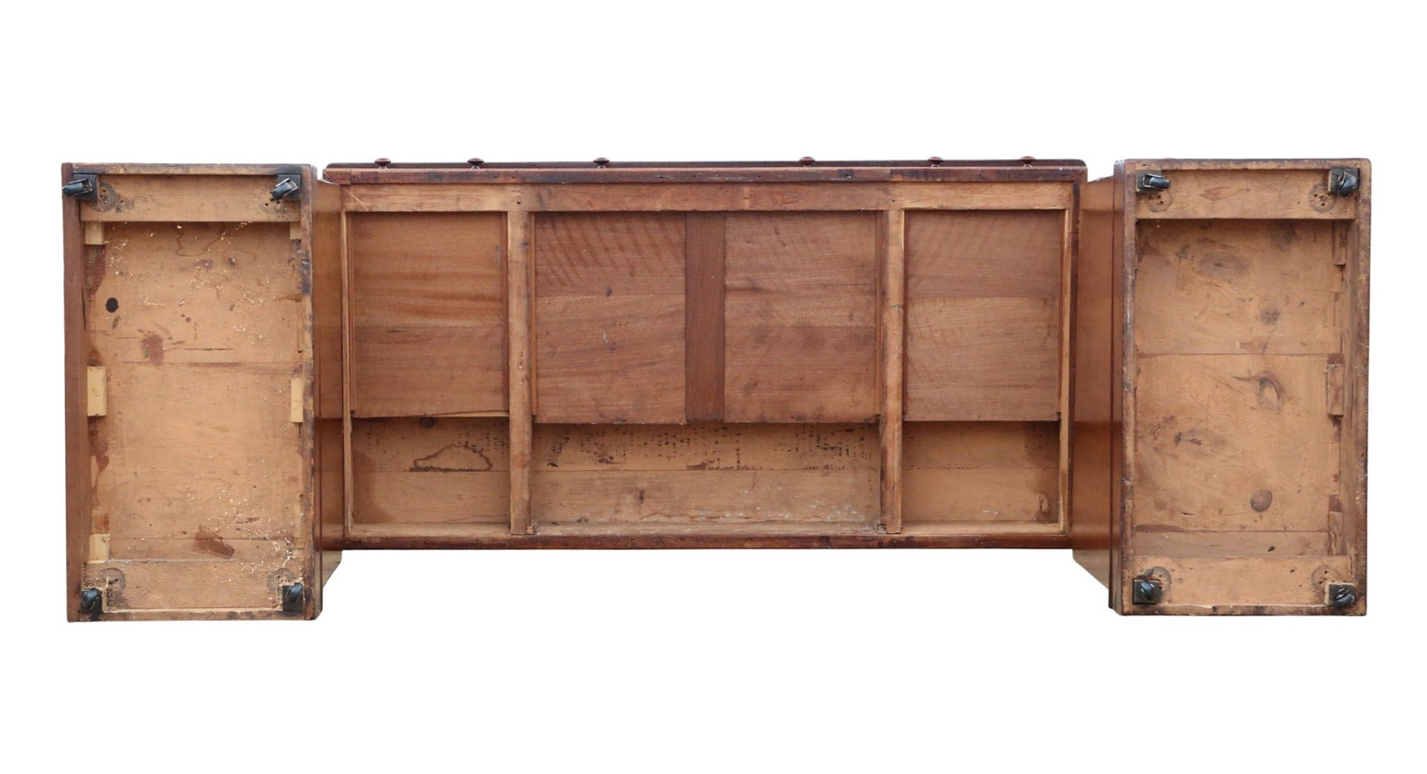 In good antique condition overall, showing expected signs of age, including historic marks, knocks, repairs, and alterations consistent with functional period furniture. No woodworm. Later-added castors. Some chips and losses to the handles and their skirts. Mahogany-lined drawers slide smoothly.