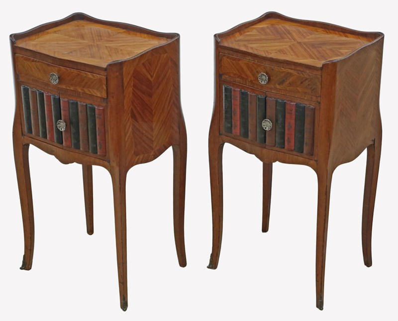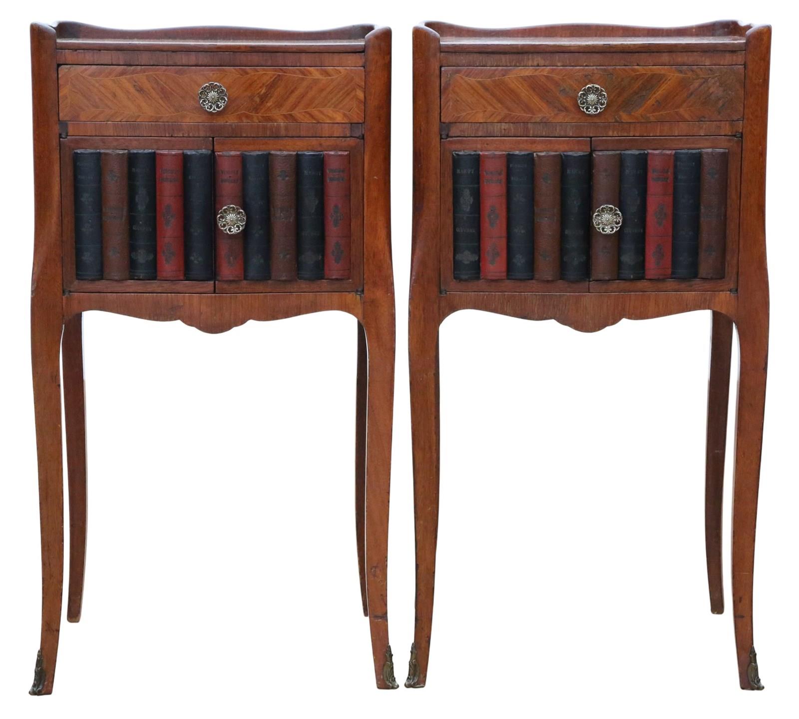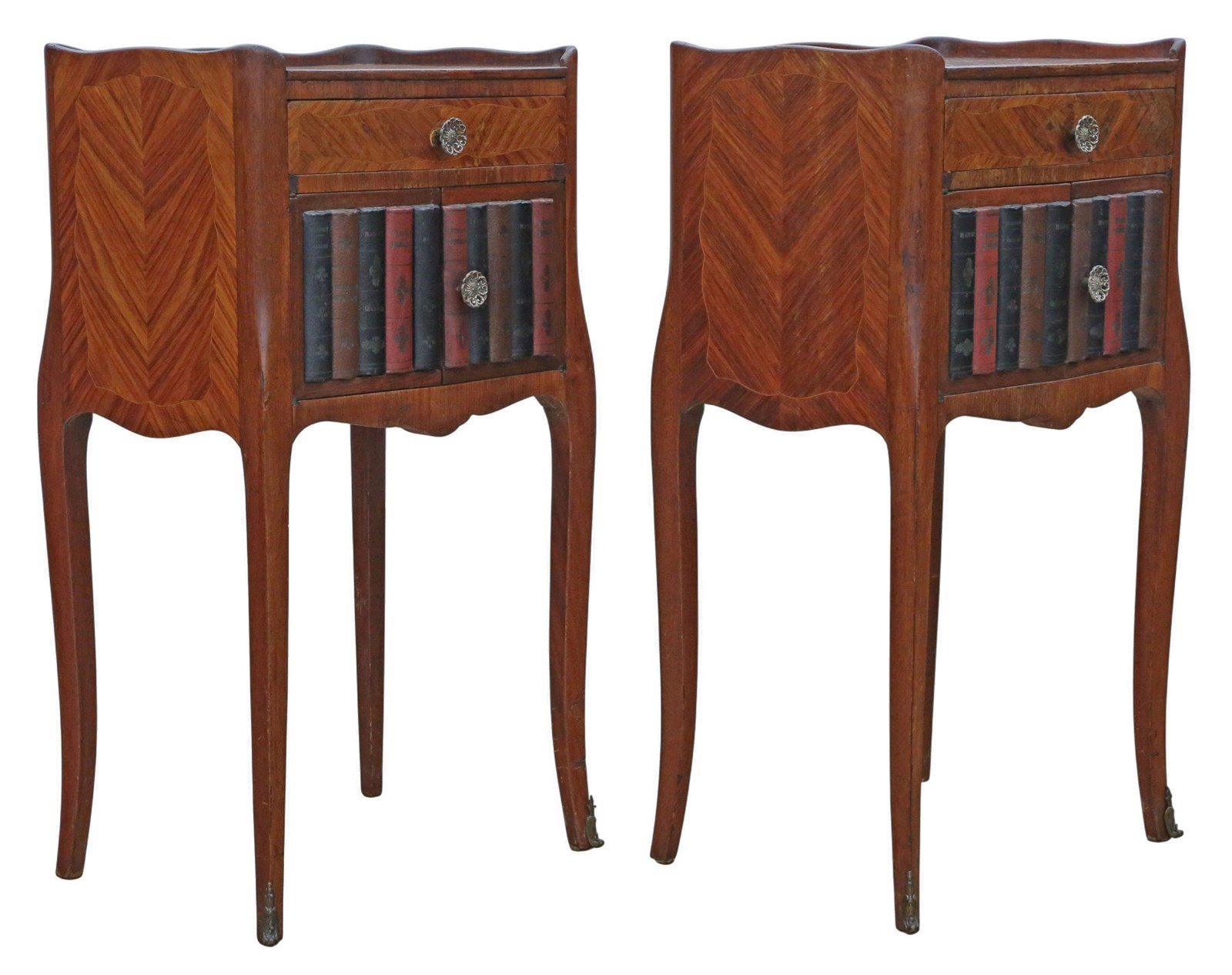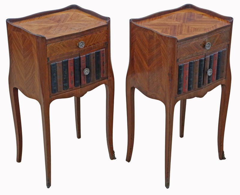 Antique Vintage Retro c.1930 Early 20th Century French Pair of Parquetry Bedside Tables / Nightstands – Multicoloured Book Facades, Fine Quality