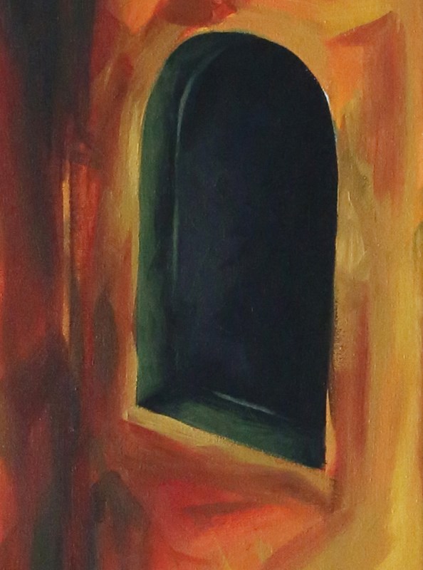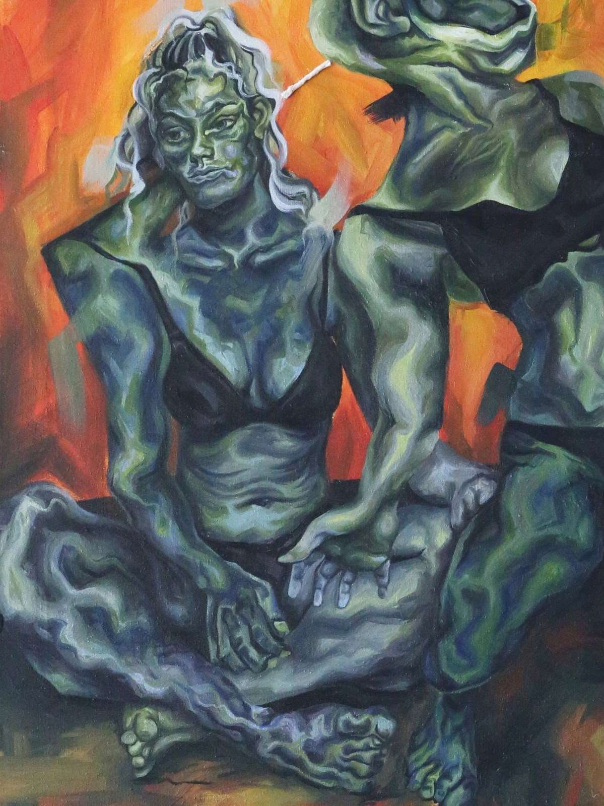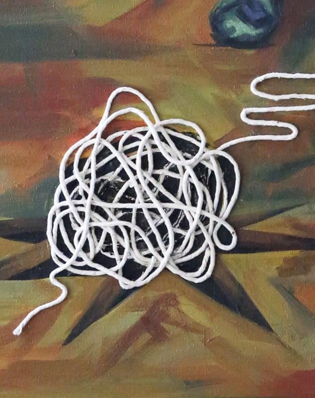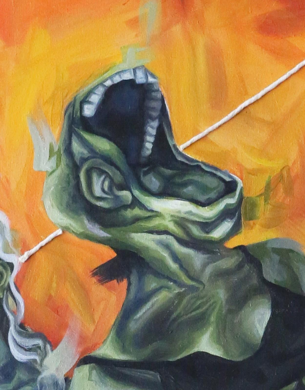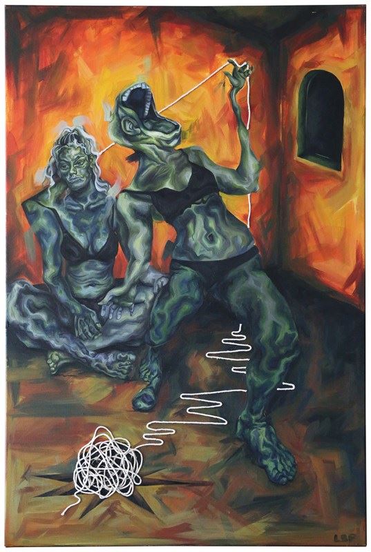 'Body 2' uses a surrealist style to show two figures, the right figure being a pastiche of the third in Bacon's 'Three Studies for Figures at the Base of a Crucifixion', within a strange room to reflect the polarised personalities within one's mind. The string that links them shows their binded nature; you can't have one emotion without its binary opposite.