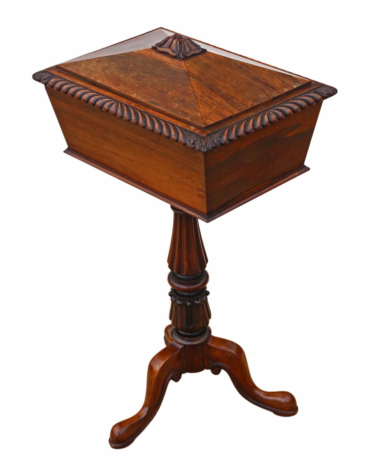 Antique quality Regency carved rosewood tea ploy C1830. A top quality piece in the manner of Gillows. A very rare find. Solid, no loose joints and no woodworm. Good size, colour and proportions. 49cmW x 35cmD x 85cmH. Historic knocks, marks, cracks, distortion, wear, imperfections, scratches, chips, repairs and alterations, as is to be expected with antique furniture. There is a chip missing from the internal lid of one tea caddy. No key and the lock is untested. Stock no. 4979. 30 day no quibble money back guarantee. Competitive UK and overseas door to door shipping.