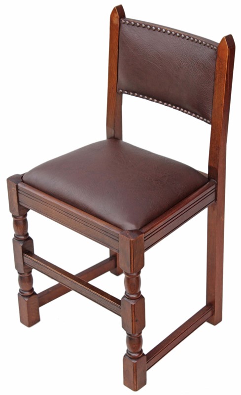 Set of 4 Gothic revival oak dining chairs Date from the mid 20th Century in the Gothic style. A great rare find, with a lovely colour, age, patina and charm. Solid chairs, with no loose joints. No significant woodworm. Sought after style of dining chair. The Leatherette (artificial) upholstery is not new, but has little wear and no major marks. Overall maximum dimensions: Chair 45cmW x 43cmD x 83cmH (47cmH seat when sat on). Historic knocks, marks, cracks, scratches, repairs and alterations, as is always the way with antique furniture of this age. We have not inspected beneath the upholstery. The chairs have had historic repairs as you would expect...but all is good and solid now. Stock No. 3667. 30 day no quibble money back guarantee. Competitive UK and overseas door to door shipping.