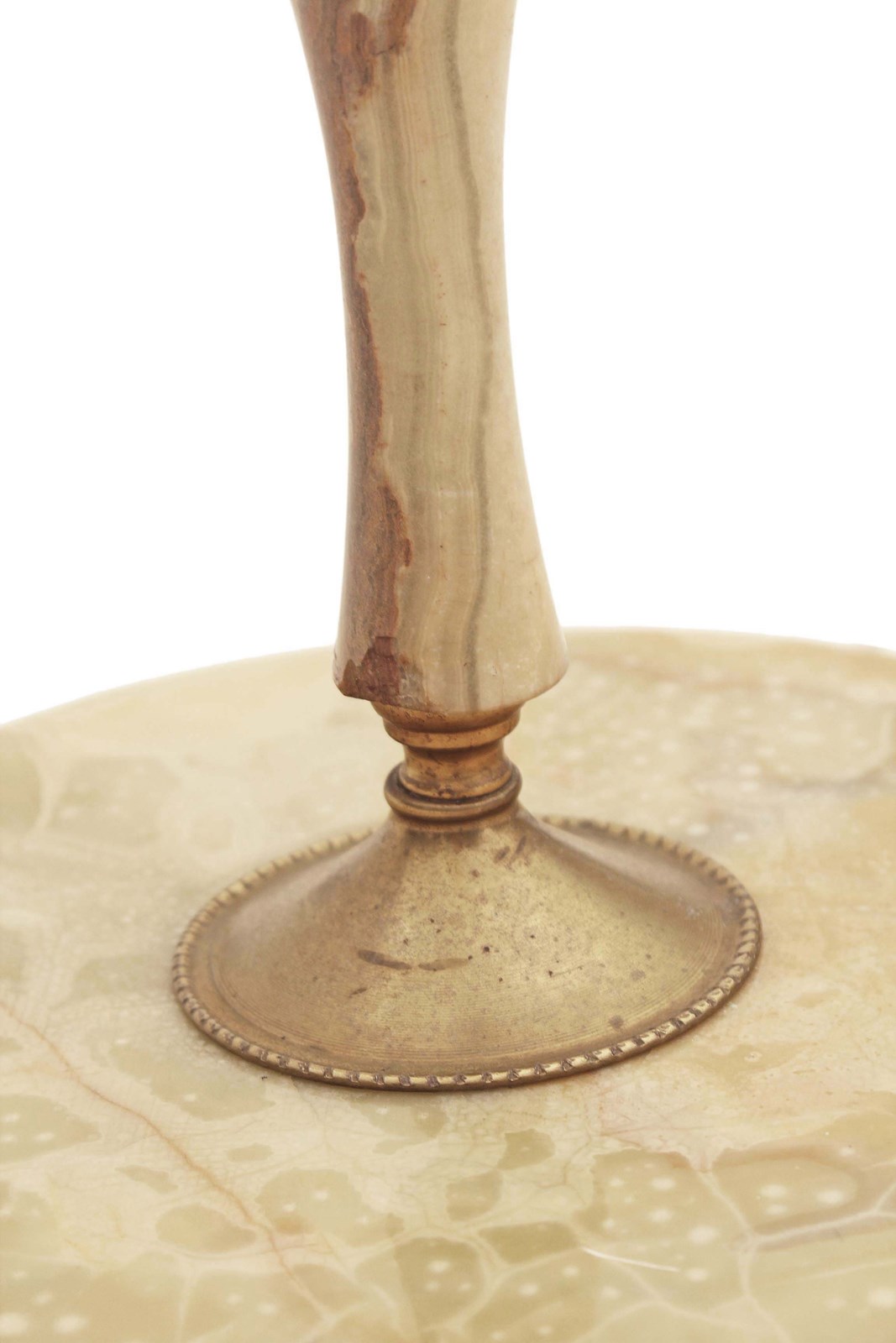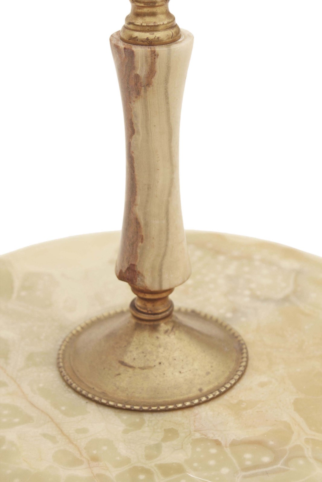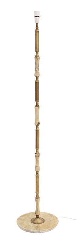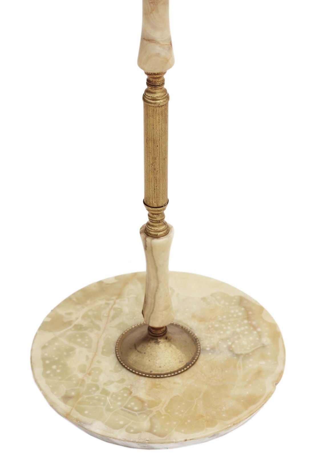 A stylish and heavy mid-20th-century standard lamp, crafted in ormolu brass (gold-finished metal and onyx. This decorative piece displays lovely age, colour, and patina. Full of charm and character, its classic design and rich materials make it a striking addition to both traditional and eclectic interiors.