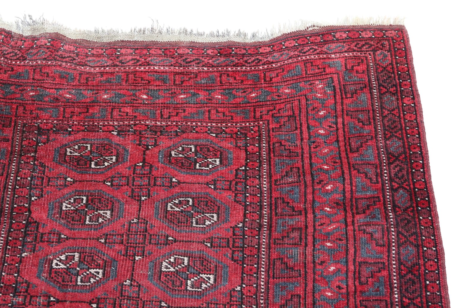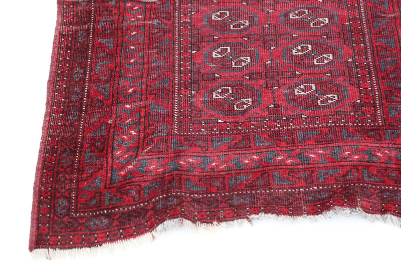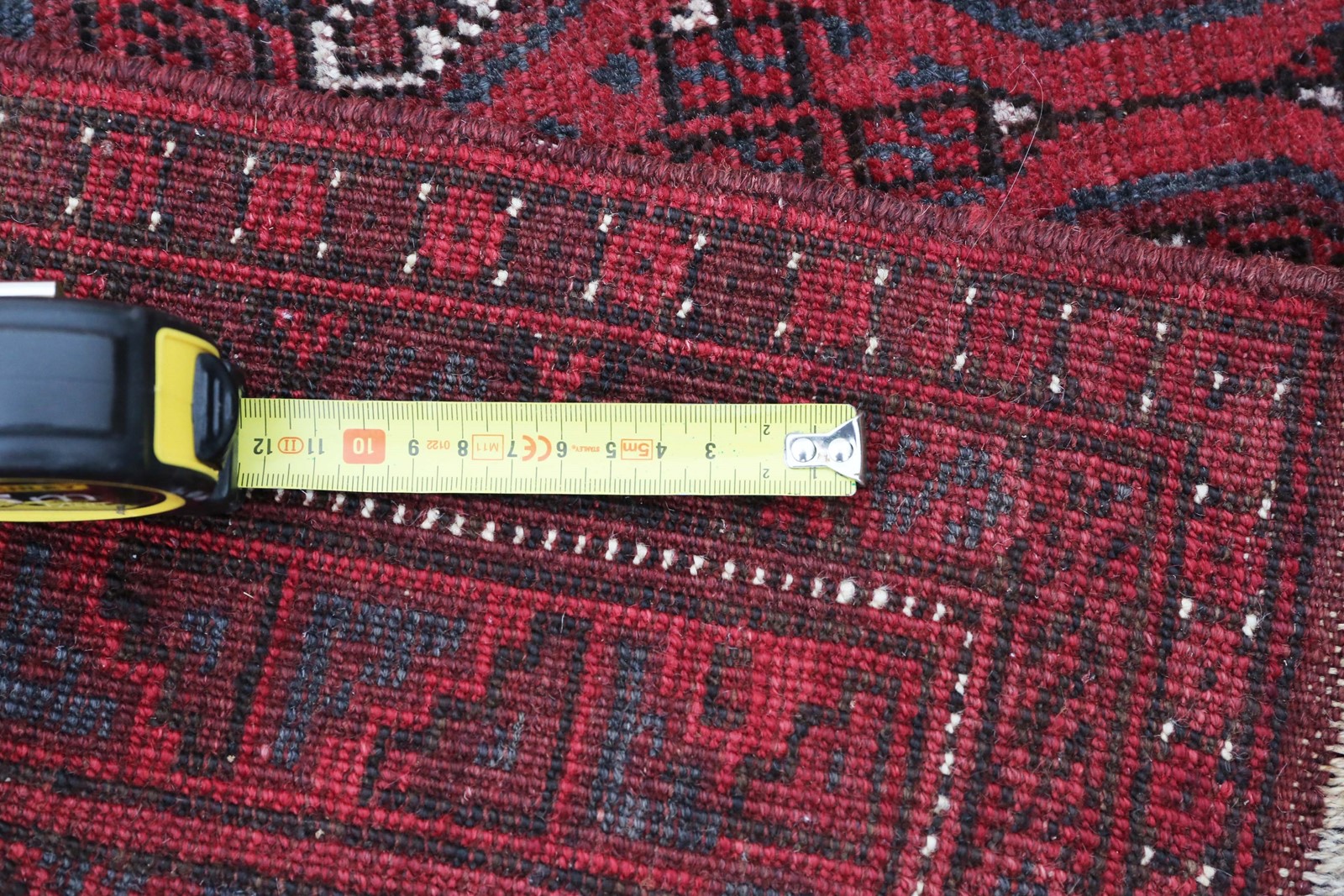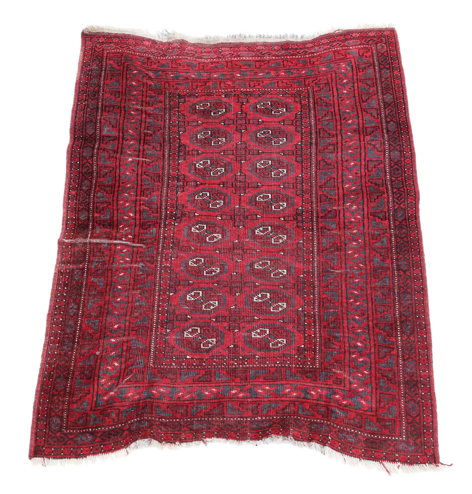 Vintage/retro wool rug roughly 4'8" x 3'4" Eastern. Would look amazing in the right location! Overall maximum dimensions: 140cmL (inc. tassels) x 100cmW. Slightly misshapen and some wear in places, no major marks. No bad odours. Stock No. 7927a. 30-day, no-quibble, money-back guarantee. Competitive UK and overseas door to door shipping.