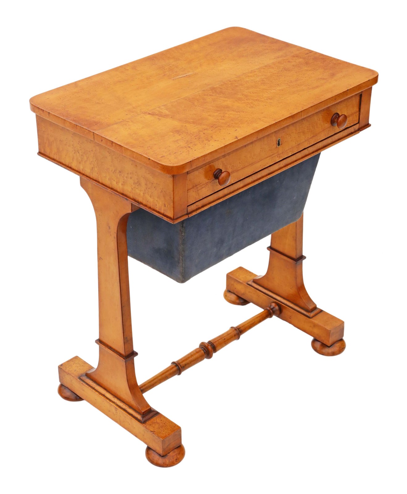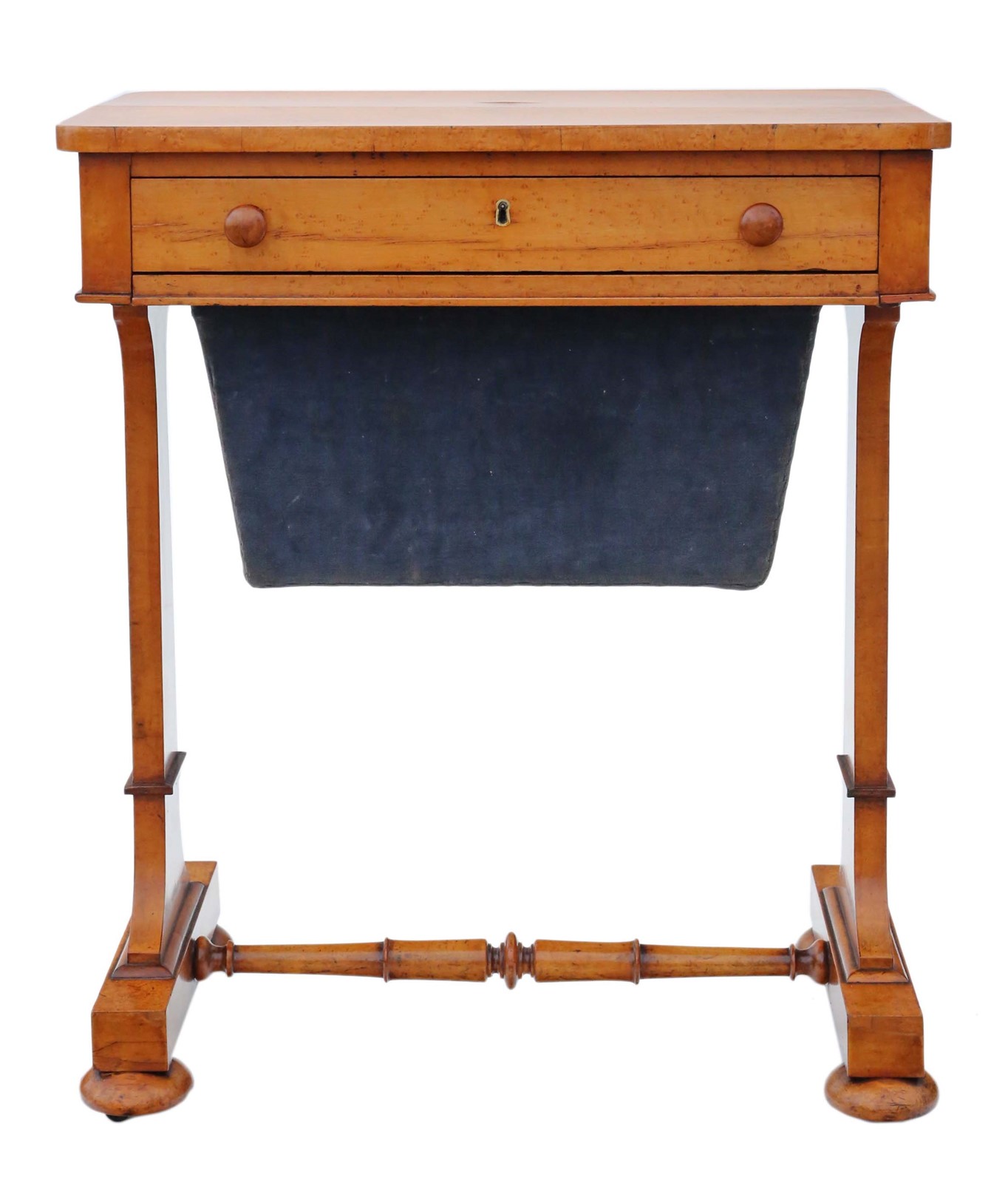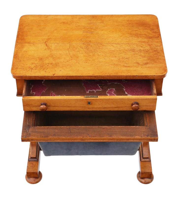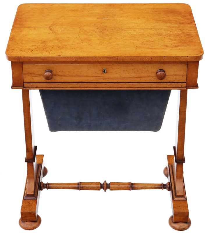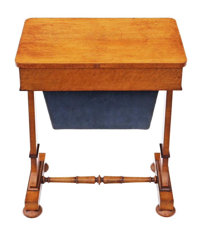 Antique William IV C1835 birdseye maple work / sewing box or table No loose joints and no woodworm. Full of age, character and charm. The mahogany lined drawers slide freely. Would look great in the right location! Overall maximum dimensions: 58.5cmW x 40cmD x 70.5cmH. Historic knocks, marks, cracks, scratches, wear, imperfections, repairs and alterations, as is always the way and to be expected with genuine antique furniture. There is some historic cracking that has been professionally filled and stabilised. The velvet cover is old and there are some losses to the skirt of one handle. Stock No. 4811. 30 day no quibble money back guarantee. Competitive UK and overseas door to door shipping.
