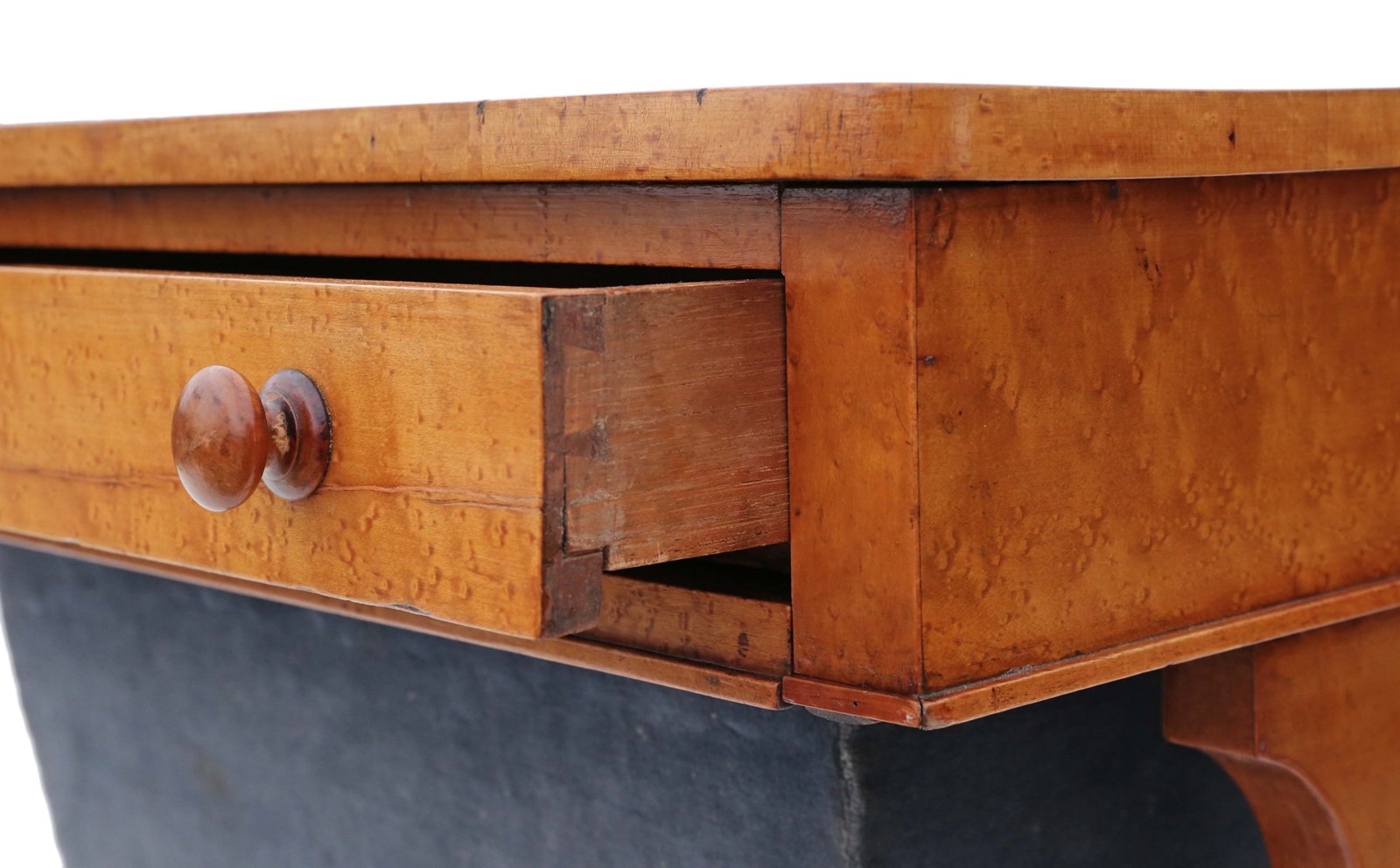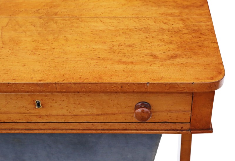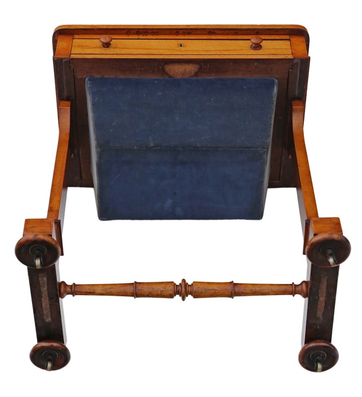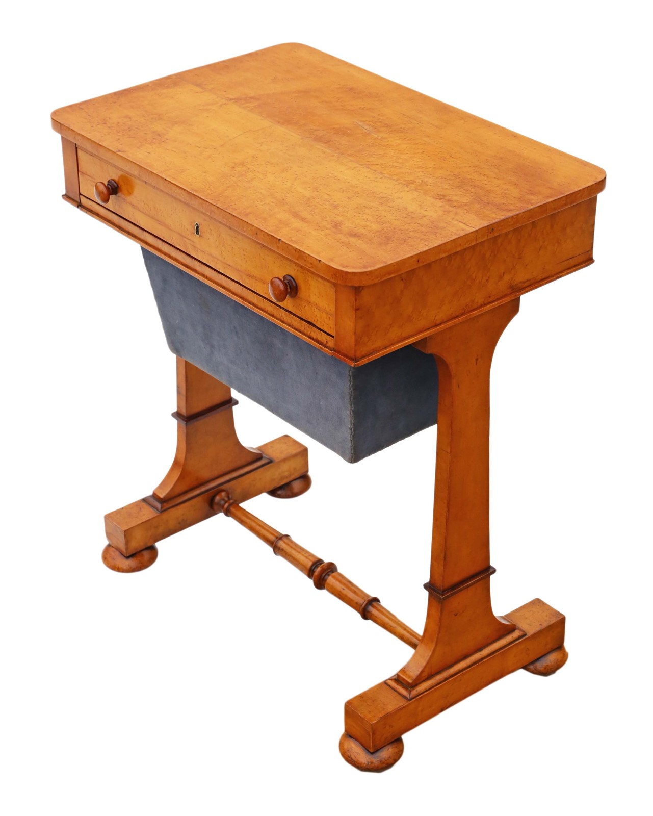 Antique William IV C1835 birdseye maple work / sewing box or table No loose joints and no woodworm. Full of age, character and charm. The mahogany lined drawers slide freely. Would look great in the right location! Overall maximum dimensions: 58.5cmW x 40cmD x 70.5cmH. Historic knocks, marks, cracks, scratches, wear, imperfections, repairs and alterations, as is always the way and to be expected with genuine antique furniture. There is some historic cracking that has been professionally filled and stabilised. The velvet cover is old and there are some losses to the skirt of one handle. Stock No. 4811. 30 day no quibble money back guarantee. Competitive UK and overseas door to door shipping.
