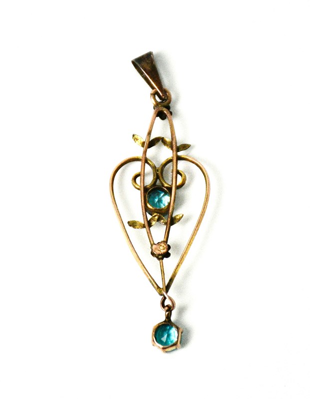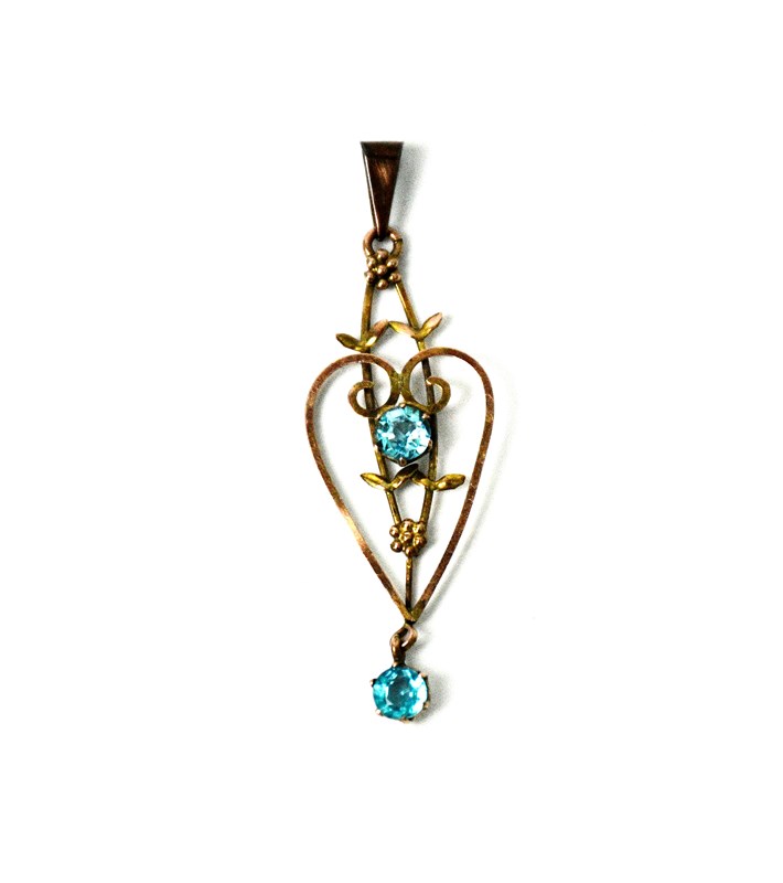 Antique Art Nouveau 9Ct Rose Gold Heart Shaped Pendant W/ Two Tourmaline Stones