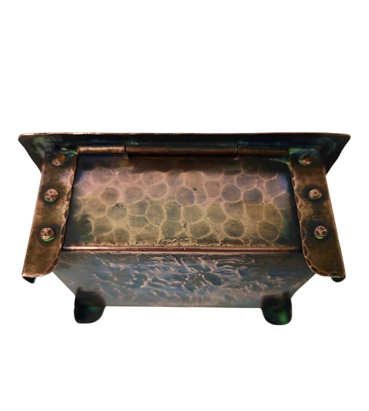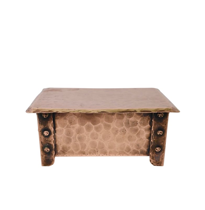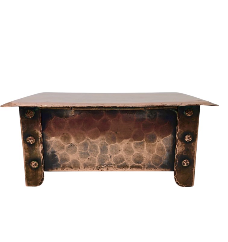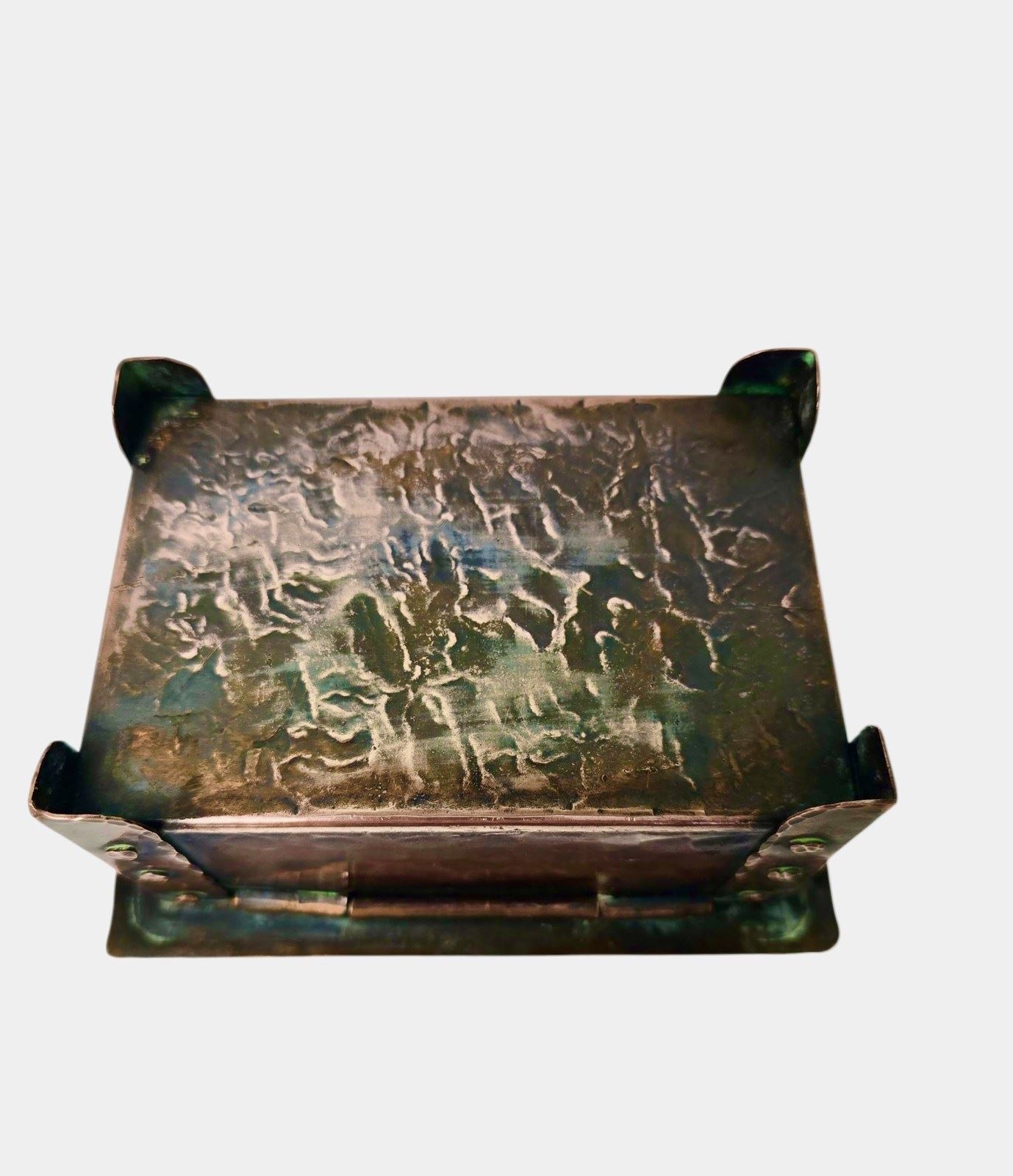 This Antique Arts & Craft Copper Box with Wood Liner is a beautifully handcrafted trinket or card box featuring intricate hand planished detailing. Made in the United Kingdom, this unique piece showcases the traditional Arts & Crafts design, adding a touch of Antique elegance to any room. Crafted from high-quality copper with a fine wood liner, this box is perfect for storing small treasures or keepsakes in a stylish and timeless manner.