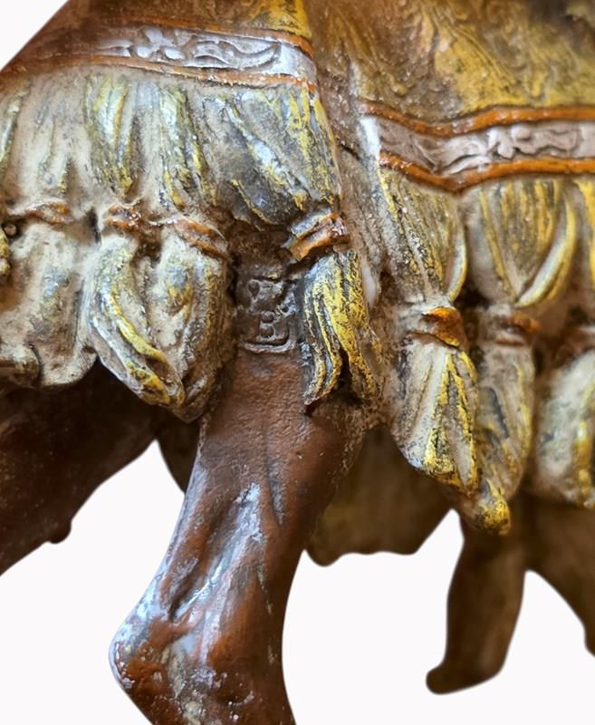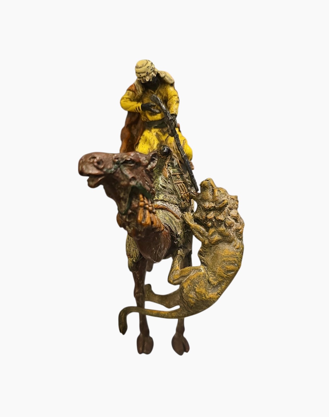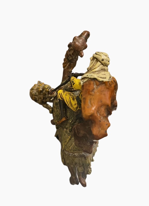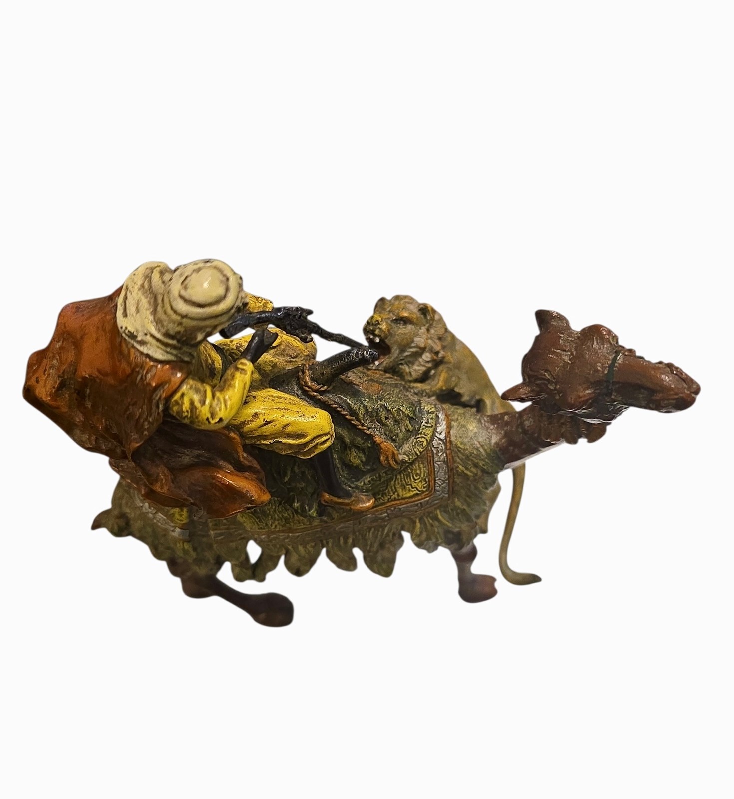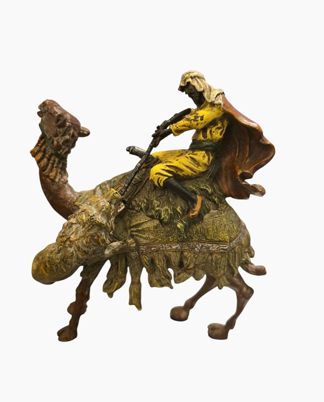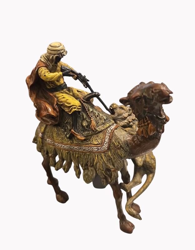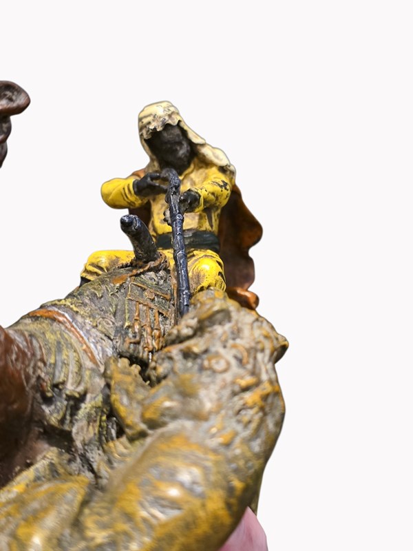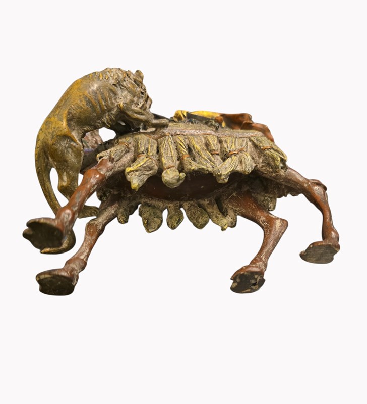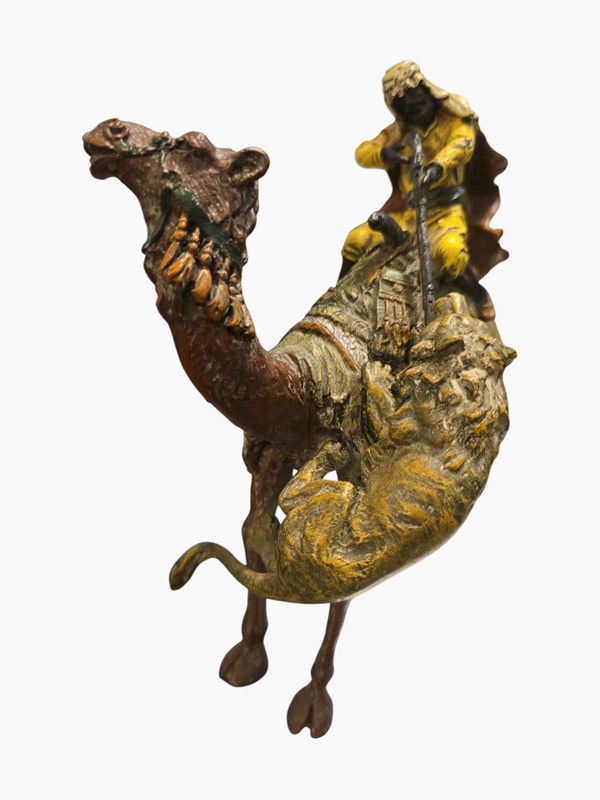 Antique Franz Bergman Cold Painted Bronze Of Arab On Camel With Attacking Tiger