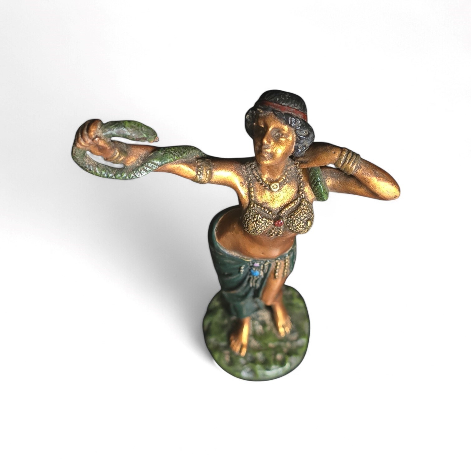 The Antique Franz Bergman Cold Painted Bronze of a female Snake Dancer from around 1900 is a rare and exquisite figurine hallmarked by the maker, Franz Xaver Bergman with the "B" in a twin handled Urn (see photo's). This original piece, crafted in Austria, embodies the Late Victorian style with intricate details and has a weight of 405 grams. The use of bronze as the primary material gives it a unique and elegant appearance, making it a prized addition to any collection of metalware antiques.