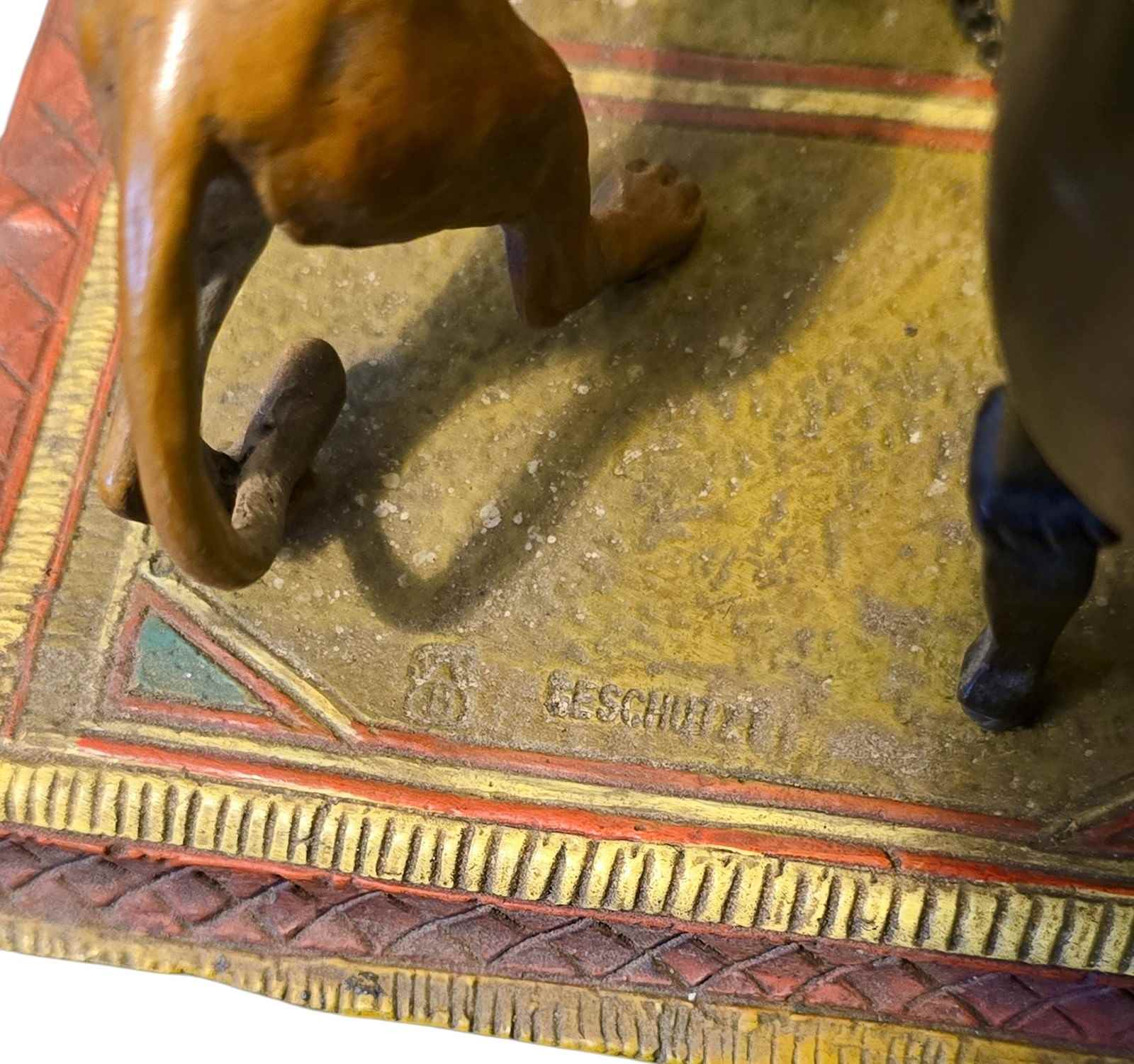The Bronze is in good condition with no damage or restoration and has all its original patina from years of being on display. It measures 14 cm tall, 14 cm deep from front to back and 21 cm long from left to right along the front edge of the rug.