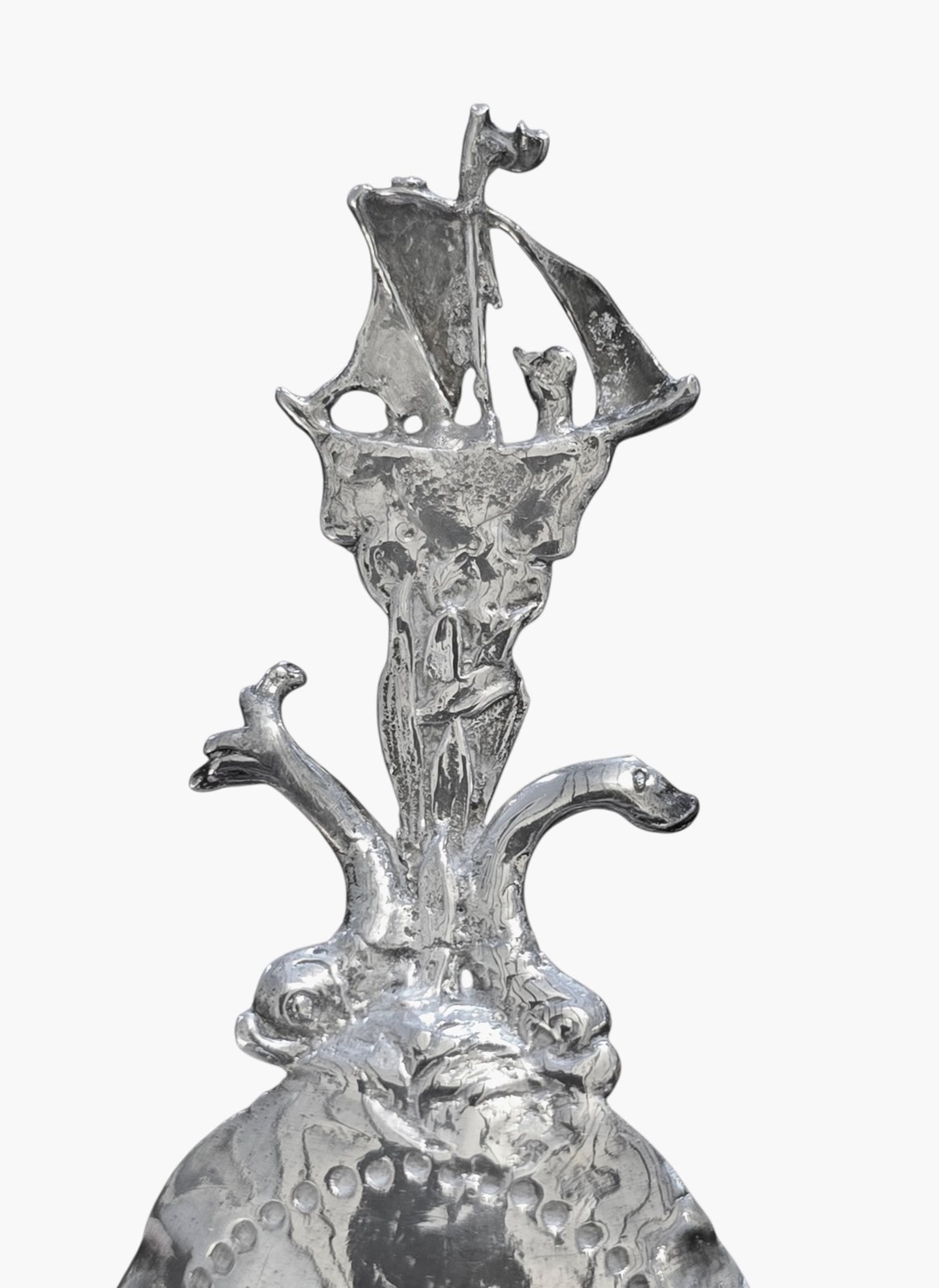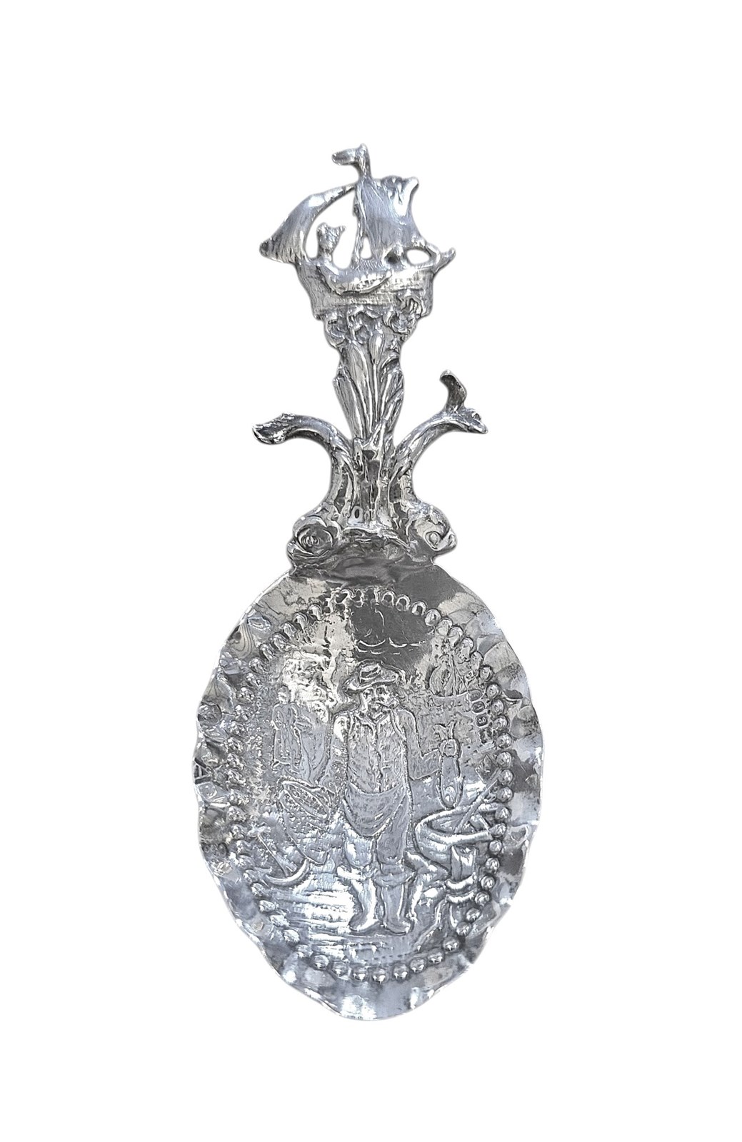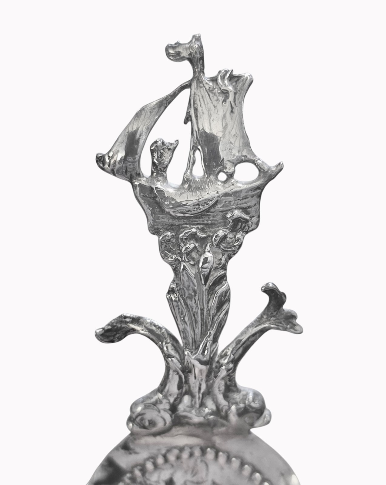 This Antique Sterling Silver German Tea Caddy Spoon, imported in 1902 by William Moering and made in Germany by Georg Roth & Co, is a rare and exquisite piece of cutlery. Crafted from sterling silver with a Continental pattern and a ship finial, this spoon exudes an antique charm that hails from Germany. Dating back to the early 20th century, this tea caddy spoon is a collectible item that adds a touch of history and elegance to any tea party or collection of fine silverware.