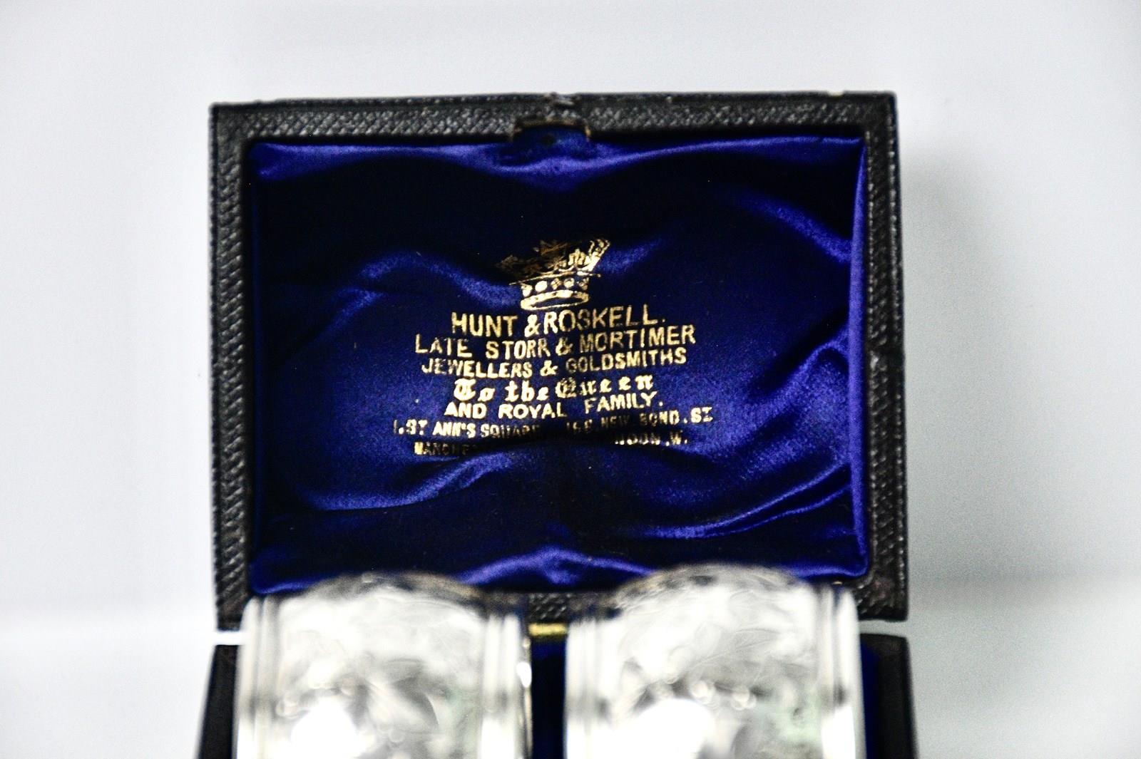 They are in stunningly excellent condition for a pair of silver napkin rings from 1873. The case is in very good condition as well and has the retailer inside the case (Hunt & Roskell - Goldsmiths to the Queen ((Victoria)) and Royal Family").
