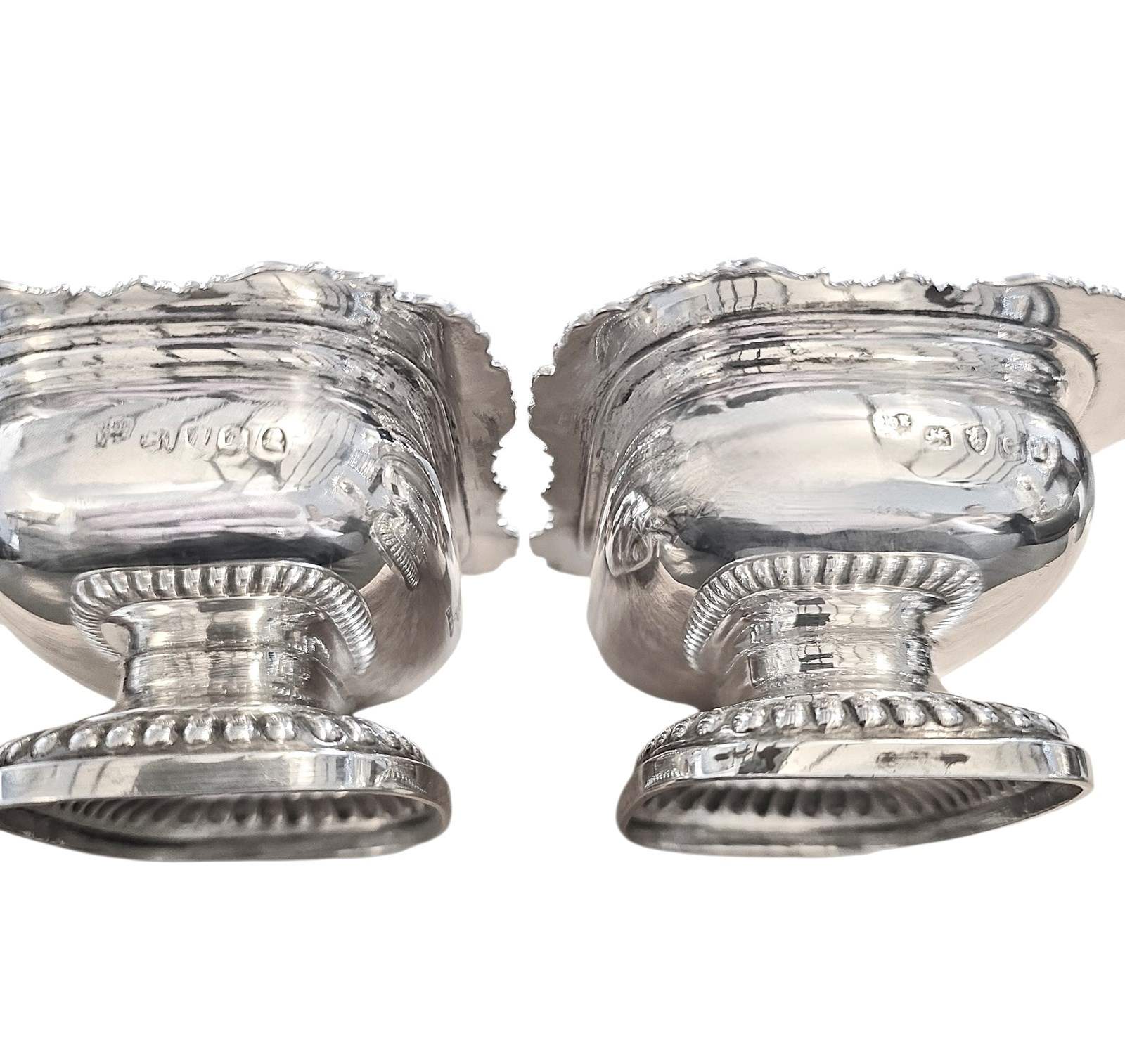 These Stunning pair of antique Georgian silver table salts from 1820, crafted by Rebecca Emes & Edward Barnard I in London are an exceptional and beautifully made pair.. These Georgian-style table salts are made of sterling silver with gilt interior and date back to the early 19th century. The elegant design and craftsmanship of these silver salts reflect the style of the George IV period, showcasing the finest work of British silversmiths from that era.